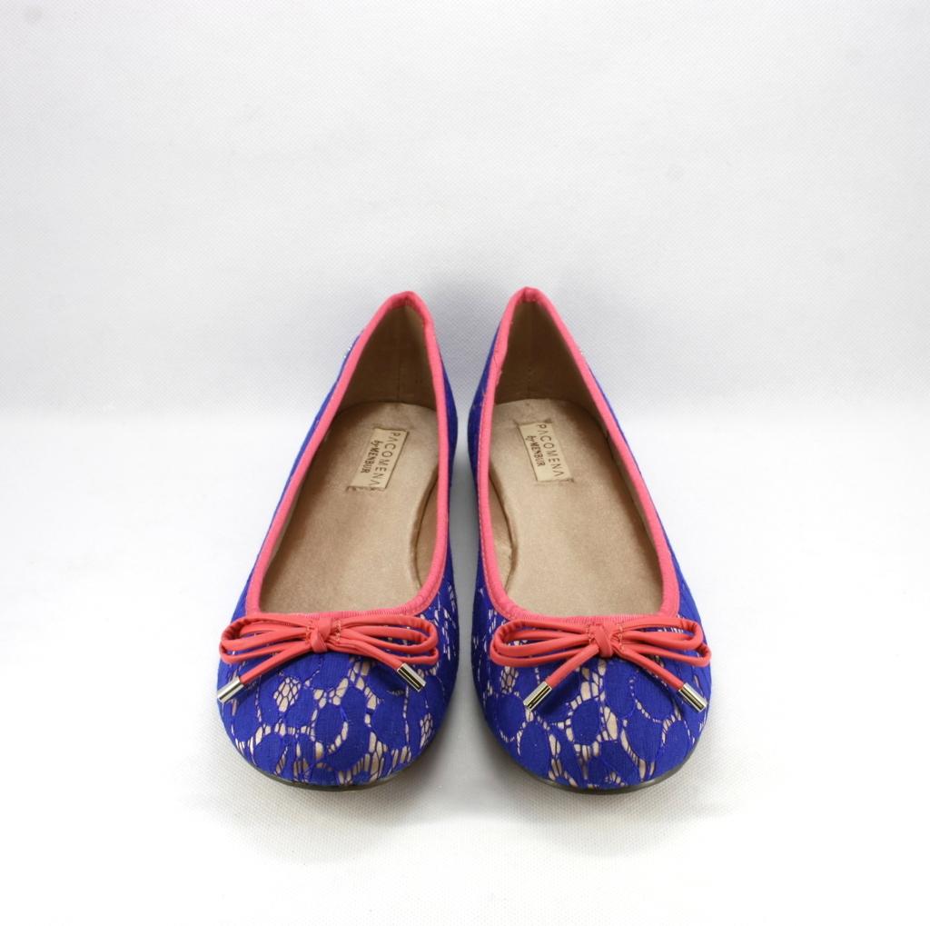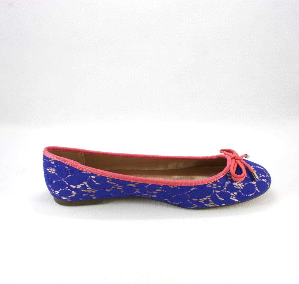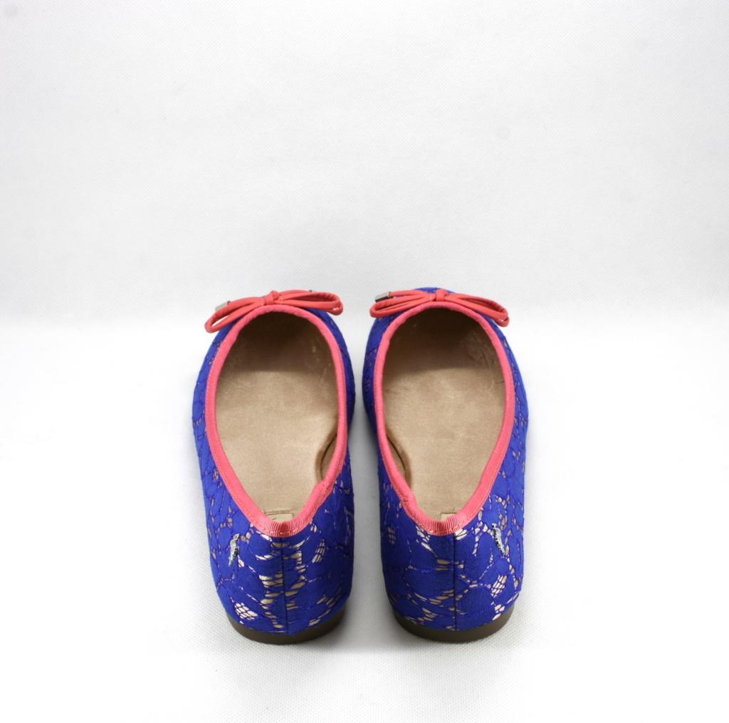 Ballerina in pizzo bluette disegno rebrodè con base nude, rifinita con profili e fiocchetto a contrasto color fuxia.