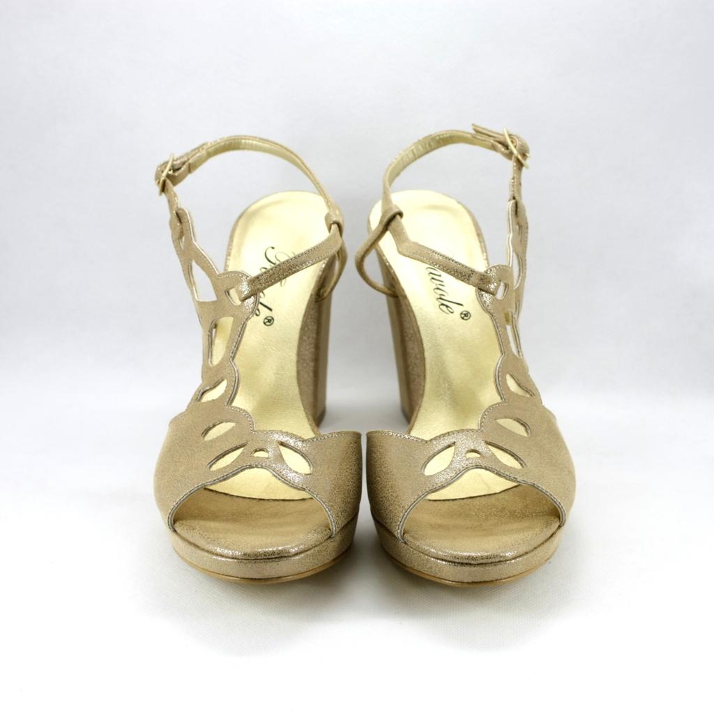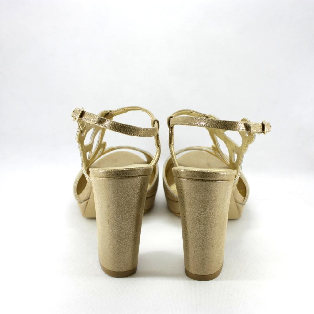 Sandalo donna con tacco largo, una calzatura che si può indossare per ore senza sentirla addosso, stabilità pianta larga e cinghietta la rendono molto confortevole, il colore oro effetto vintage la rende perfetta per moltissimi abbinamenti con i look più svariati.