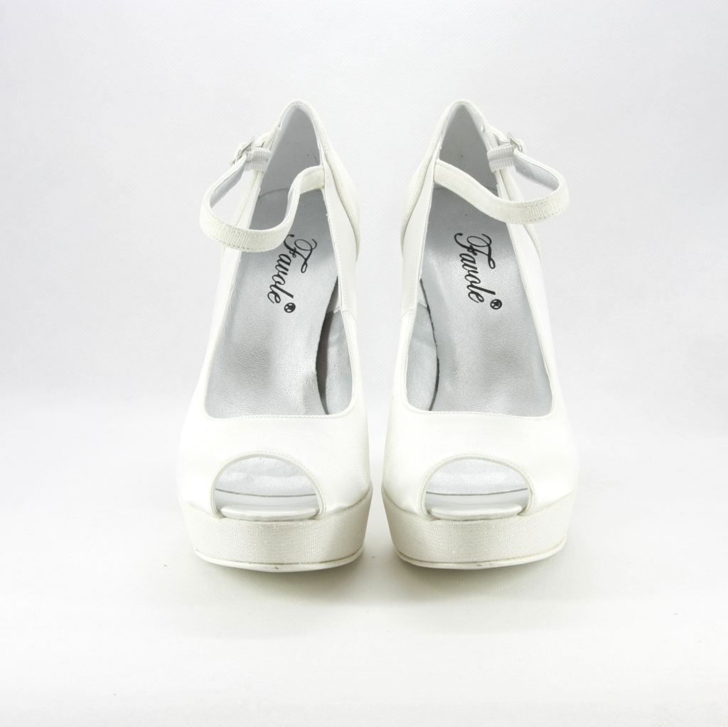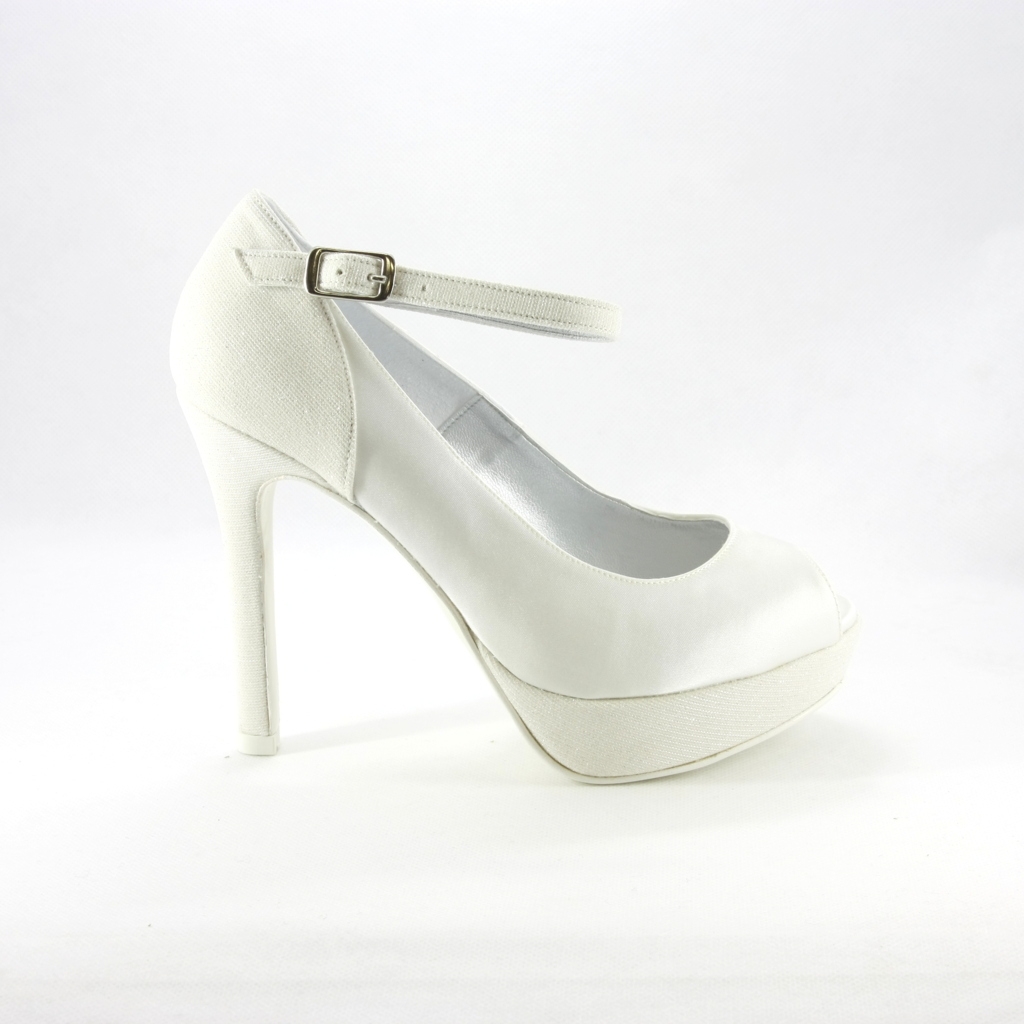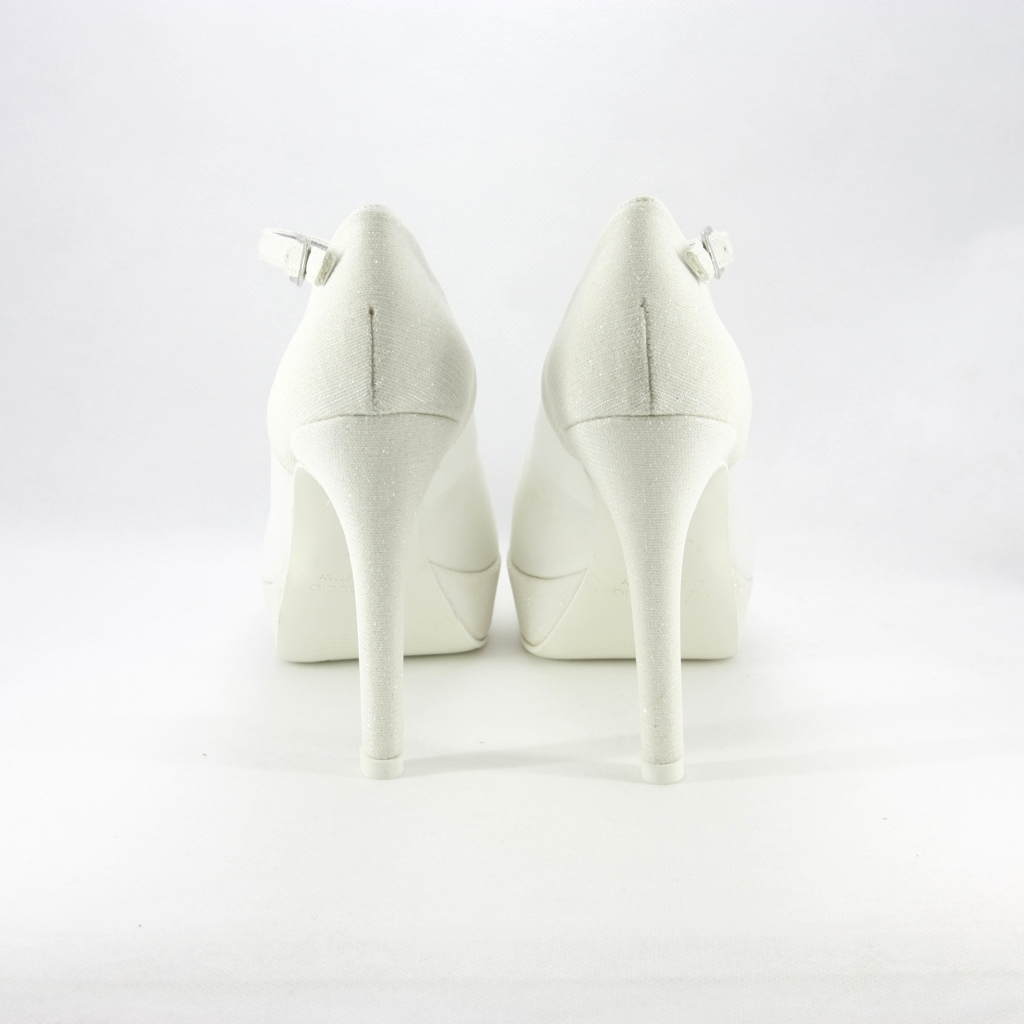 Décolleté in tessuto di raso con inserti glitter scarpa con tacco sfilato alto la comodità è data dal plateaau e cinghietta che donano confort e stabilità, il colore è bianco naturale prima tonalità d'avorio, si abbina perfettamente alle tonalità dei modelli sposa più diffusi.