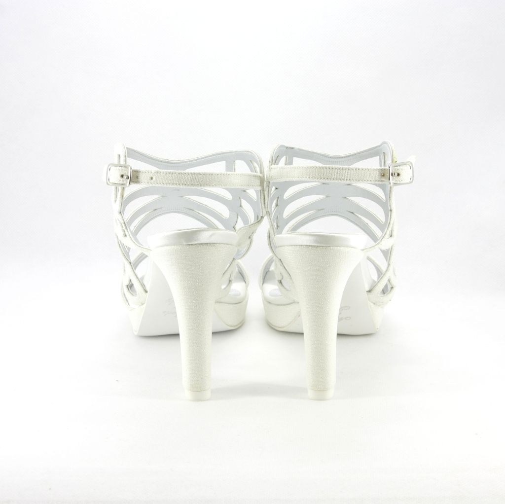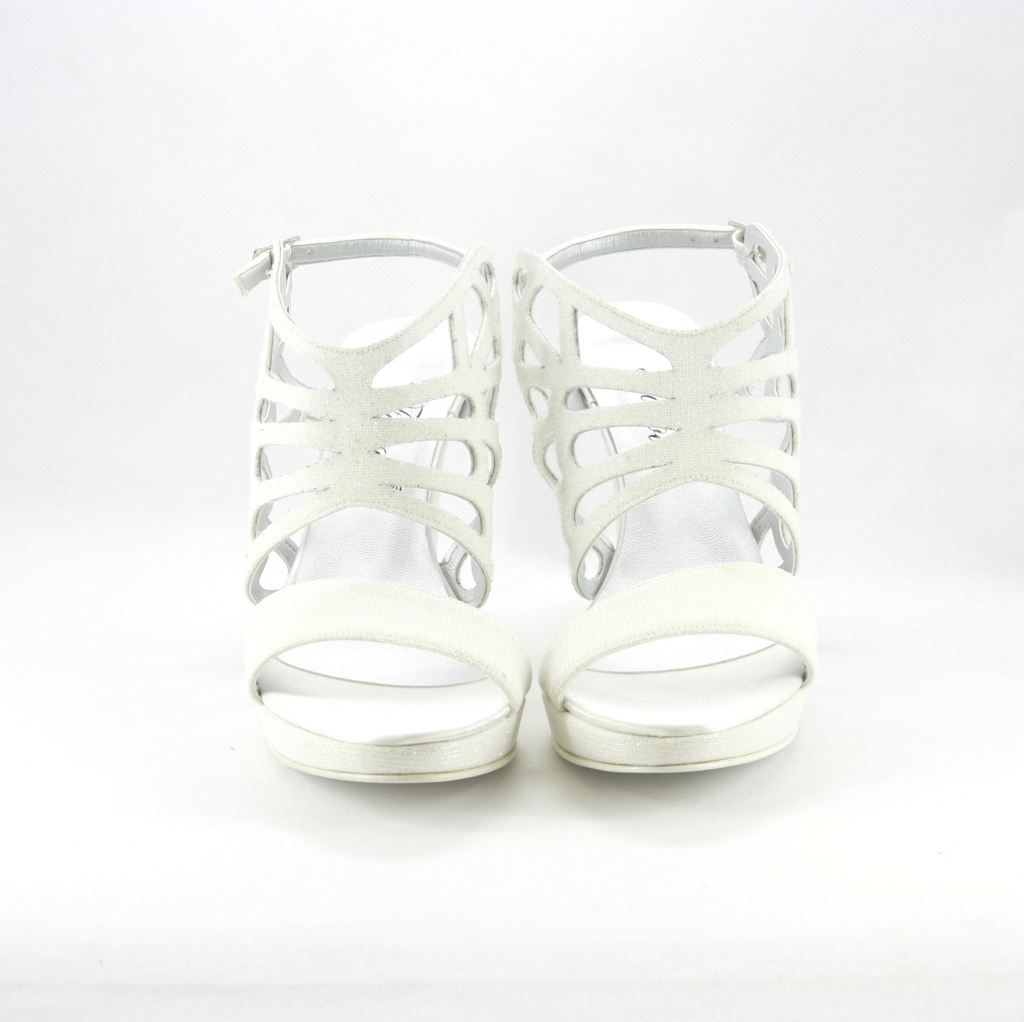 Sandalo donna in tessuto galassia gliter colore avorio, molto luminoso e d'effetto ideale per chi vuole una scarpa che non passi inosservata, un alternativa facile e di gran effetto, adatta sia ad un abbinamento elegante ma anche ad un paio di jeans! Il plateau rende questo sandalo comodissimo.