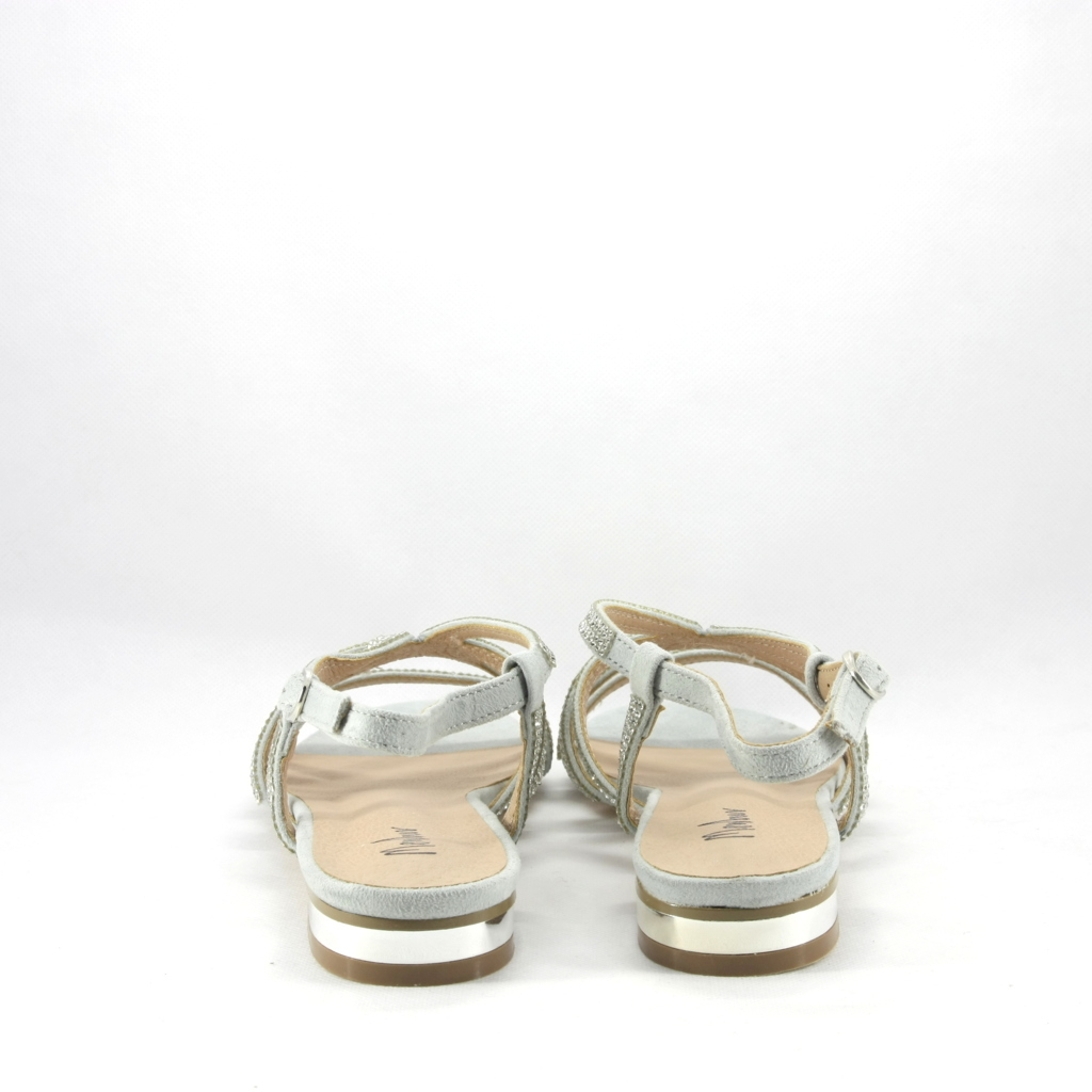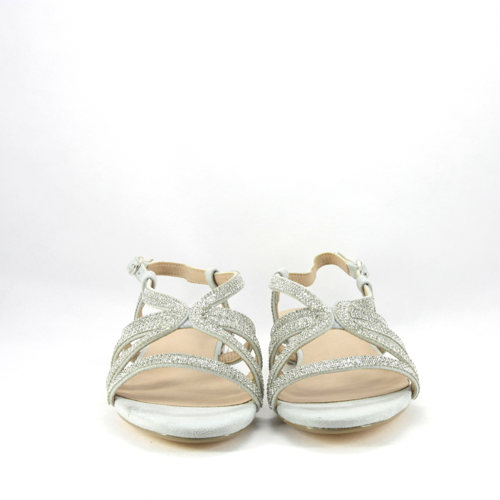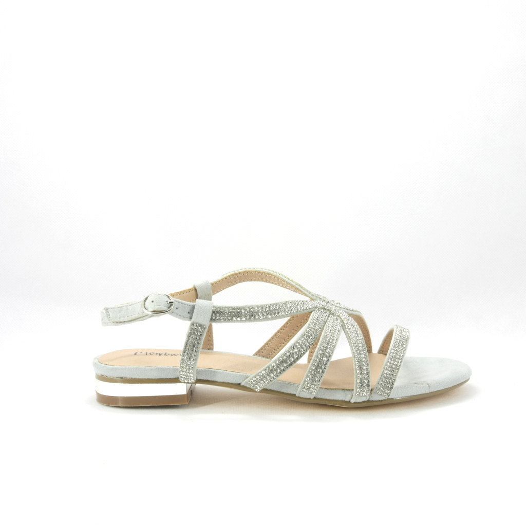 Sandalo cerimonia donna in tessuto effetto scamosciato in colore grigio con applicazione di cristalli ad impreziosire il piede. Tacco basso ideale per chi non è abituata ad usare i tacchi e non vuole rinunciare all'originalità.