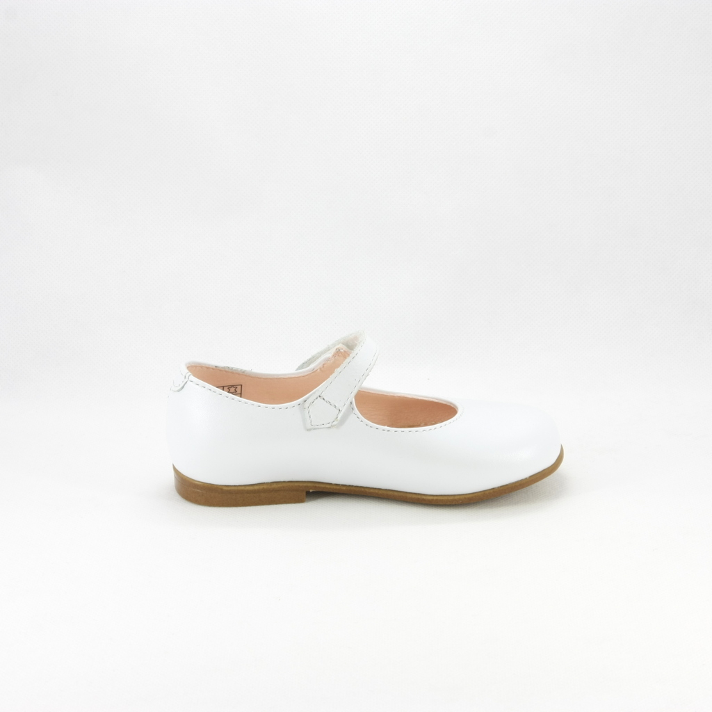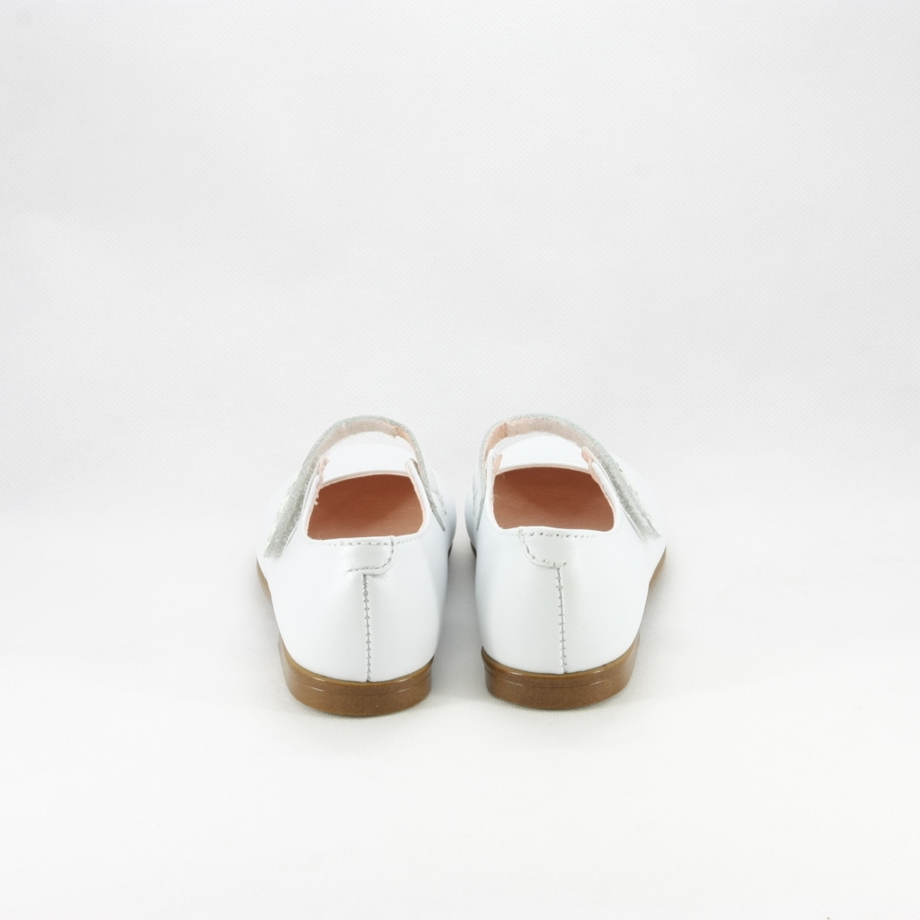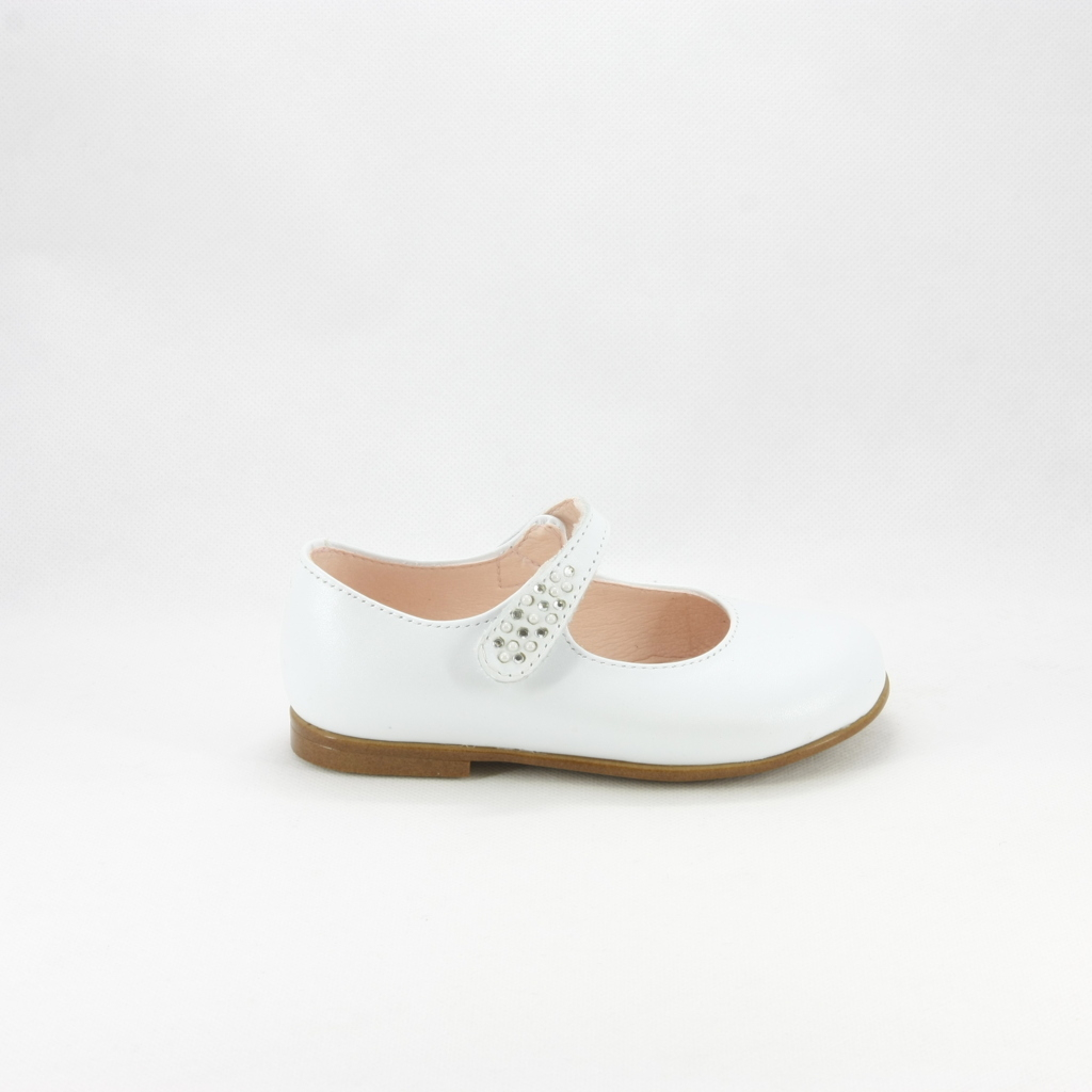 Ballerina bimba elegante da cerimonia realizzata con cinghetta decorata con cristalli e perle.