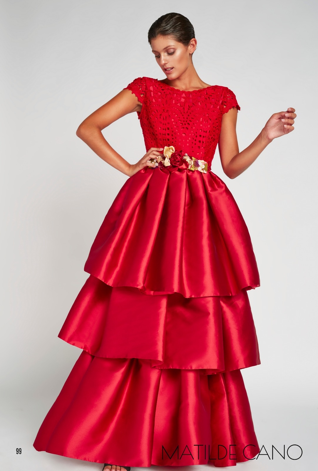 Abito cerimonia donna color rosso amaranto, con ampia scollatura sulla schiena, realizzato con corpetto in pizzo macramè di cotone e gonna a balze in mikado, l'abito è impeziosito da una cintura in vita con fiori applicati.