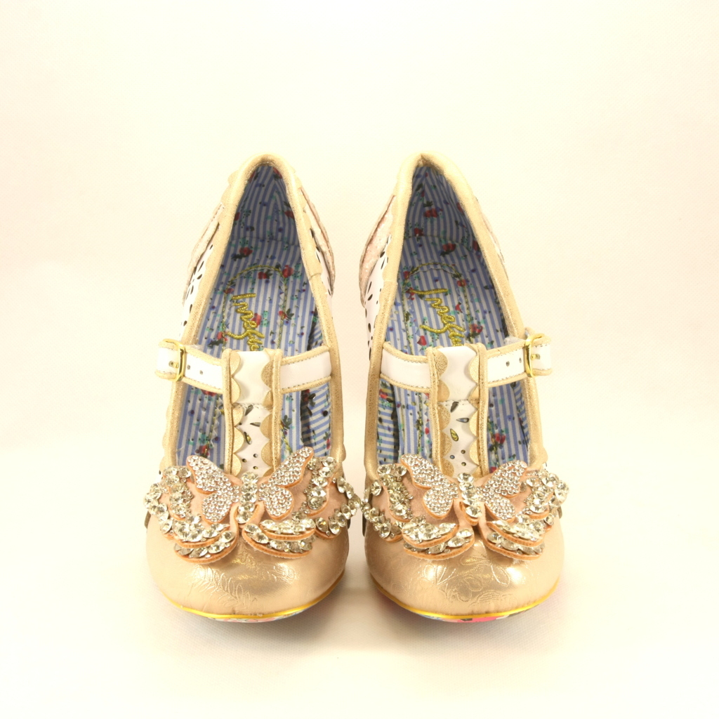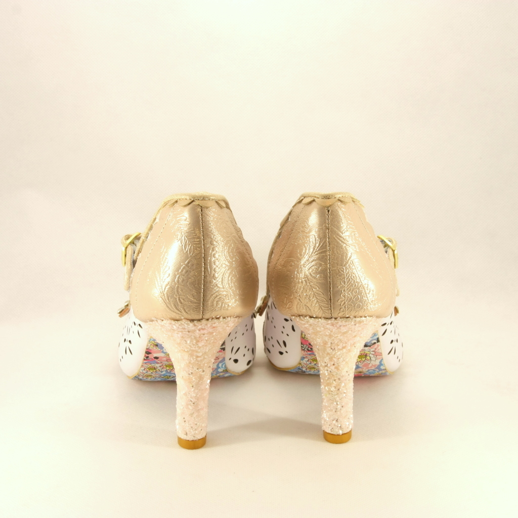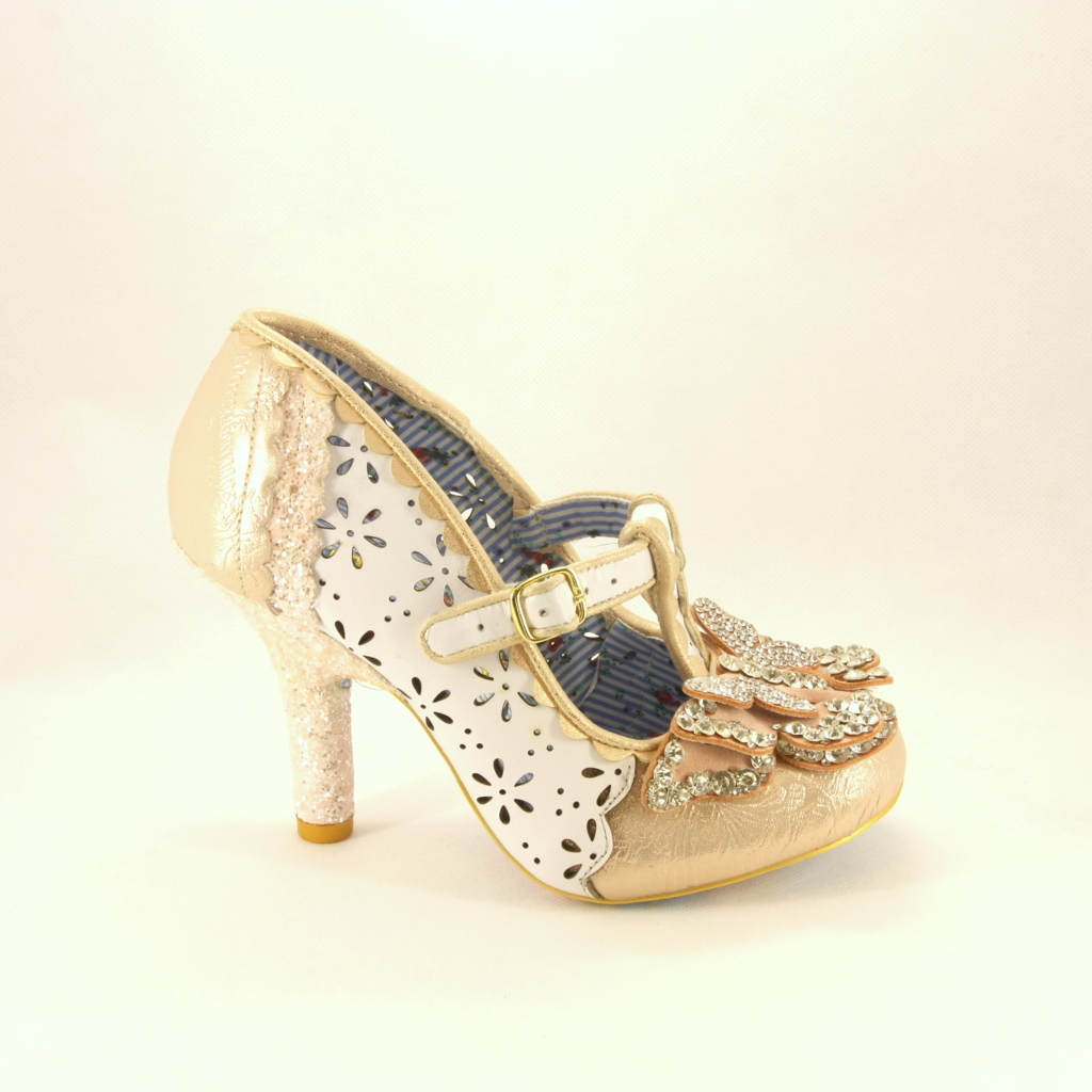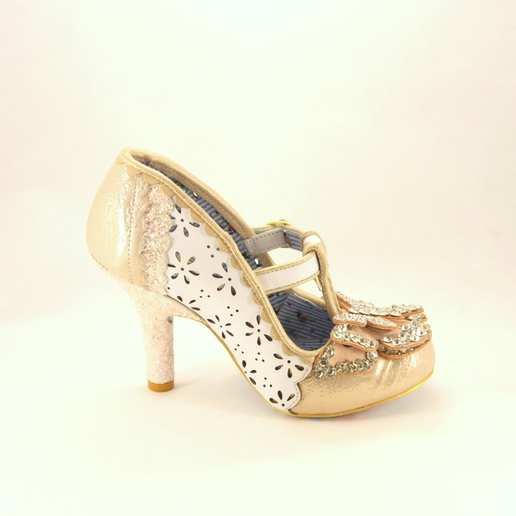 Scarpa dsposa realizzata a effetto traforato con applicazione fiocco di cristalli e tacco glitter.