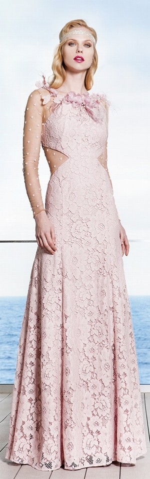 La silhouette è la protagonista di questo sensuale abito ricco di dettagli, pizzo aderente e delicate trasparenze per un abito dalla linea a sirena e la delicatissima tonalità del rosa.