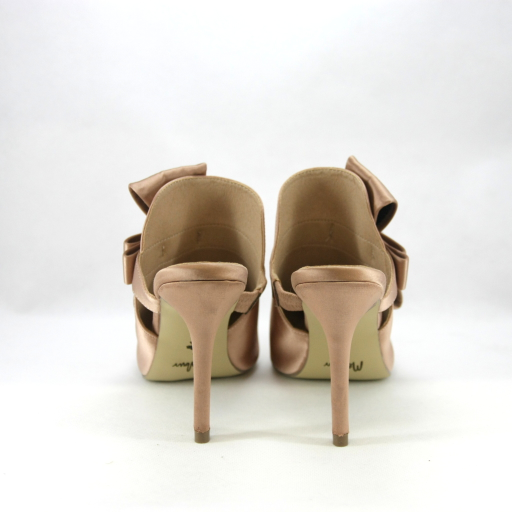 Elegantissima e particolare scarpa cerimonia donna in tessuto di raso luminoso dettagli in cristallo e fiocco, realizzata in color nude.