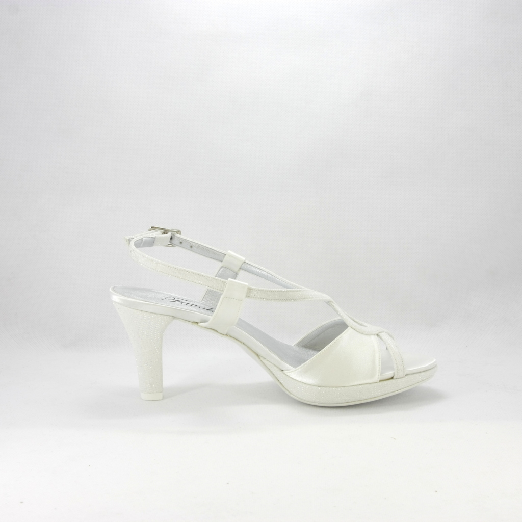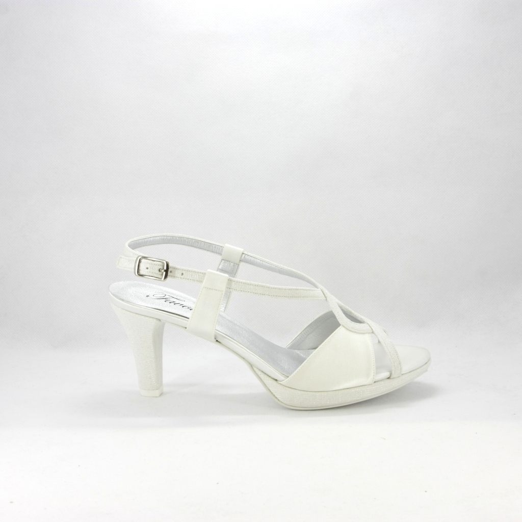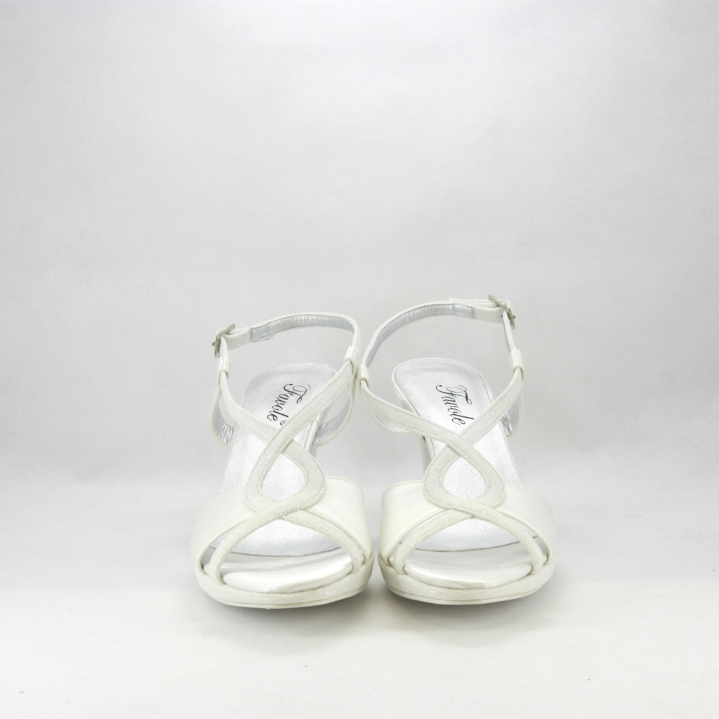 Sandalo cerimonia donna elegante in tessuto di raso con dettagli glitter, tacco sfilato di media altezza, per una sposa che punta alla comodità fin da subito oppure un ottimo secondo paio di scarpe.