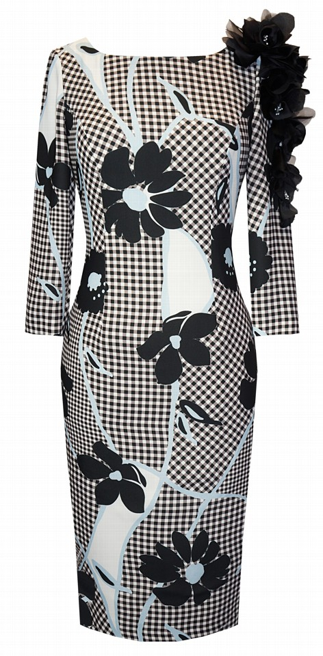 Abito cerimonia donna corto a tubino con manica lunga e applicazioni di fiori in tessuto sulla spalla; realizzato in tessuto fantasia di poliestere.