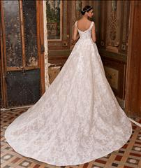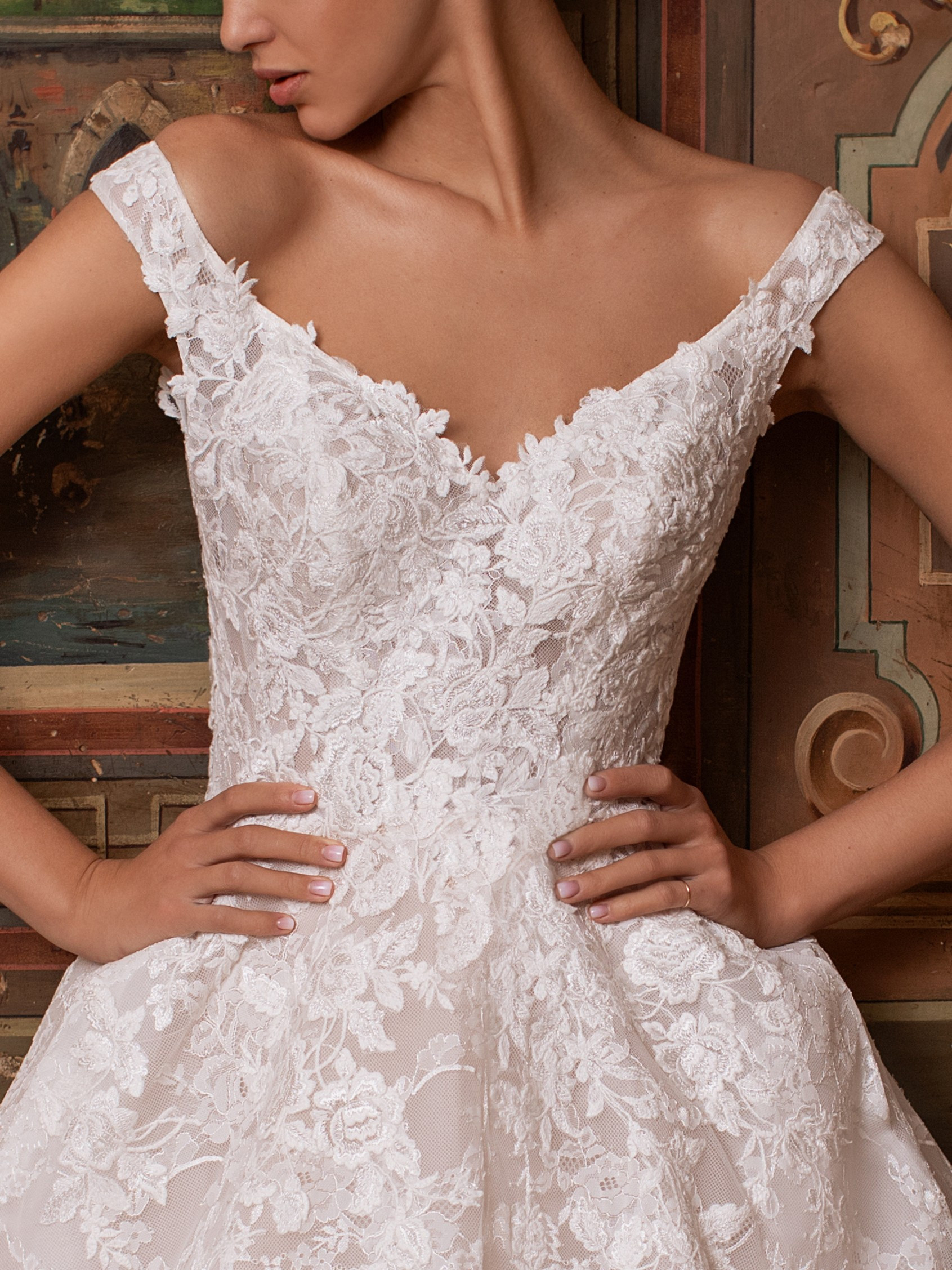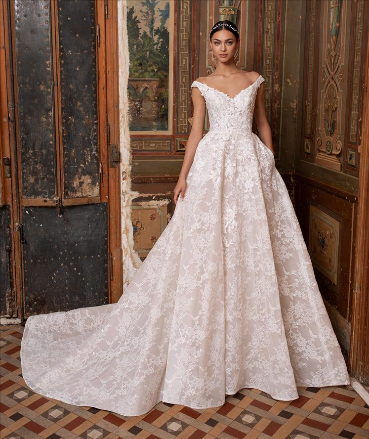 I motivi floreali in pizzo donano un tocco vittoriano a questo modello senza tempo, con maniche scese, che mette in risalto il décolléte e risplende in un mosaico di rose bianche.