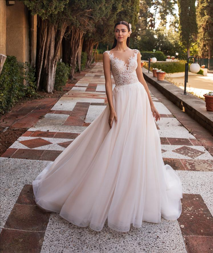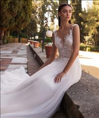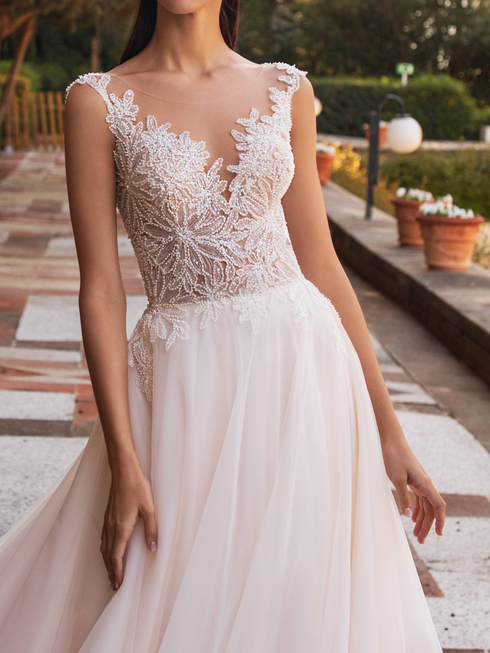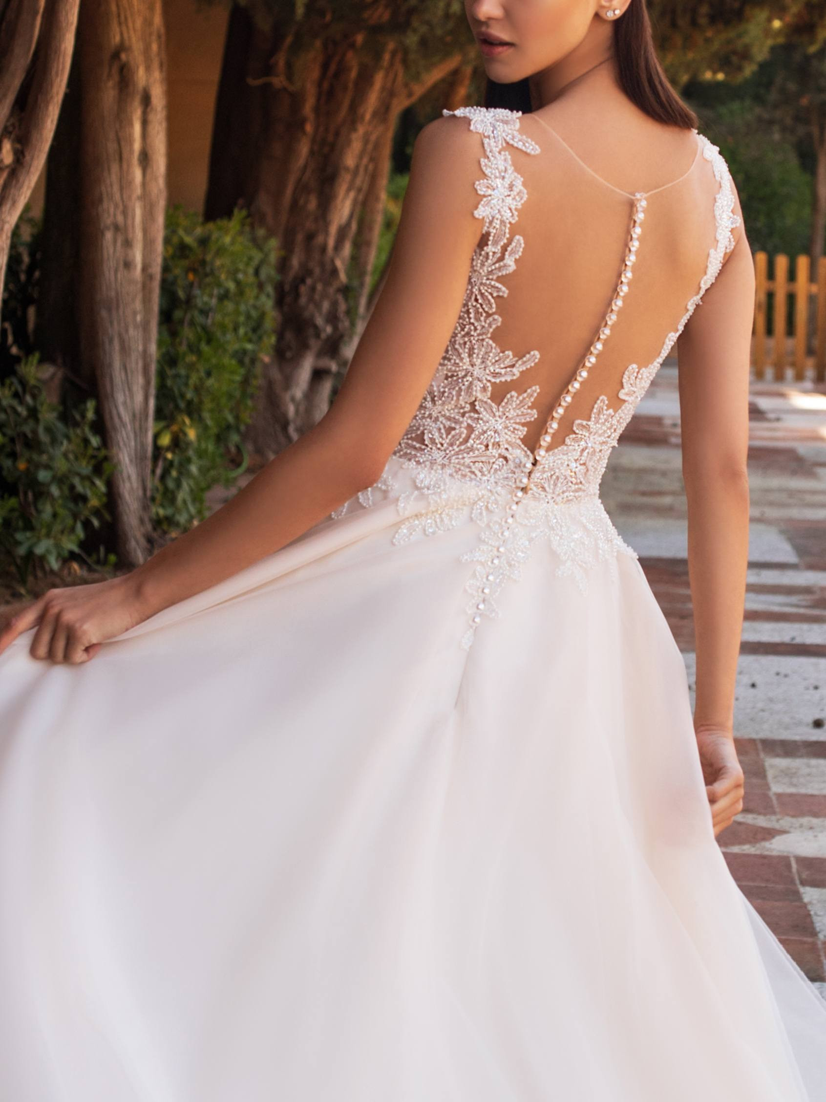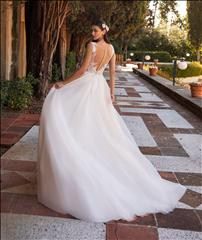 Questo romantico abito da sposa si caratterizza per un corpetto semitrasparente ricamato a motivi di margherite ed una morbidissima e fluida gonna realizzata in tulle.
