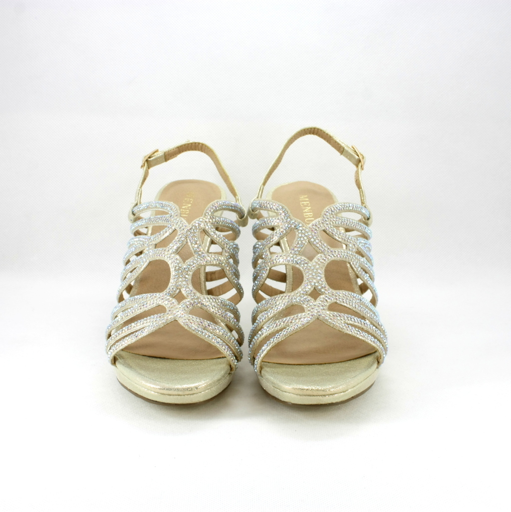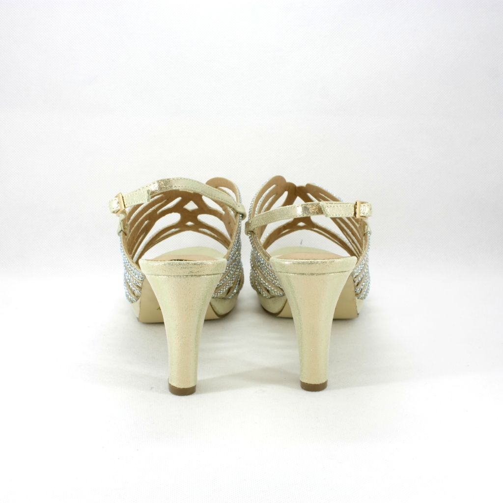 Sandalo cerimonia donna elegante in tessuto oro con applicazione cristalli color opale e cinghietta regolabile alla caviglia.