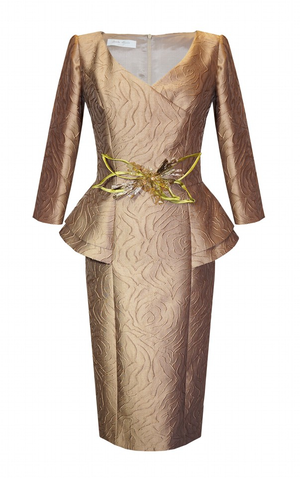 Abito cerimonia donna corto con manica 3/4 realizzato in tessuto di broccato con decoro spilla removibile in rafia/raso/perle/pailettes.