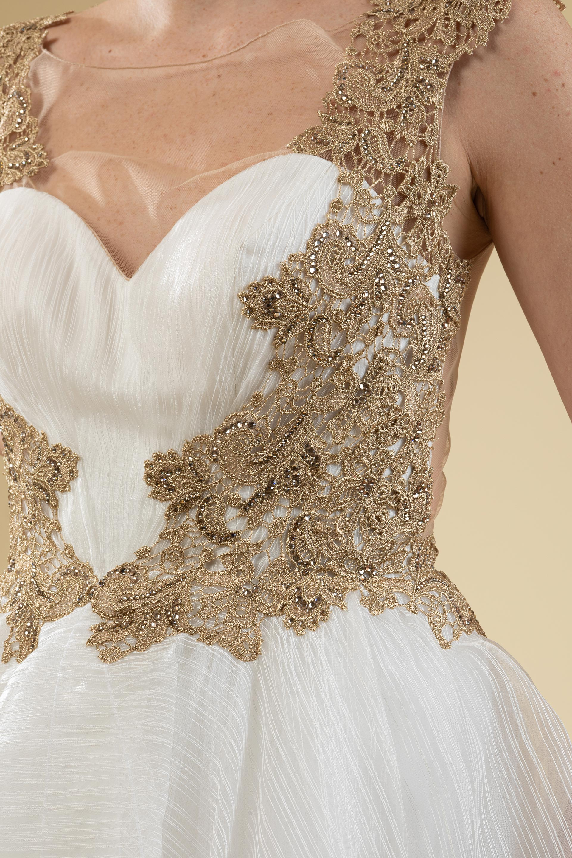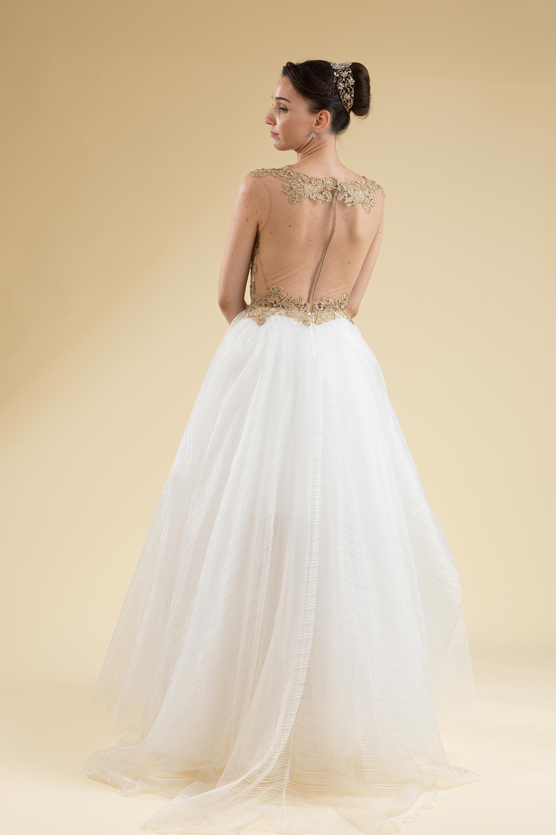 Abito sposa ampio realizzato in morbido tulle ed organza operata rigata, il corpetto è realizzato in pizzo macramè color oro ricamato con cristalli svarovsky tono su tono.