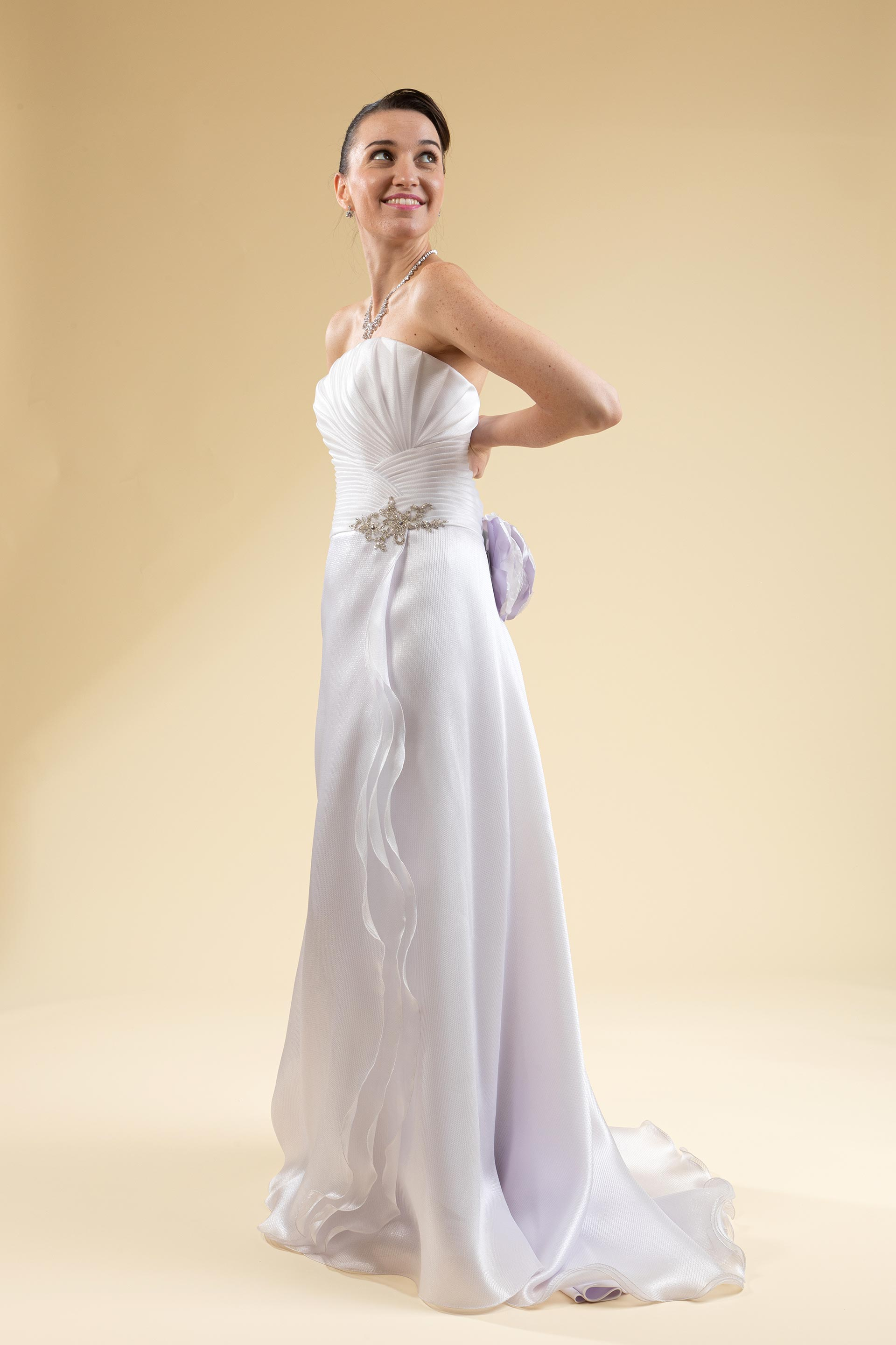 Abito sposa decoltè in organza lilla.