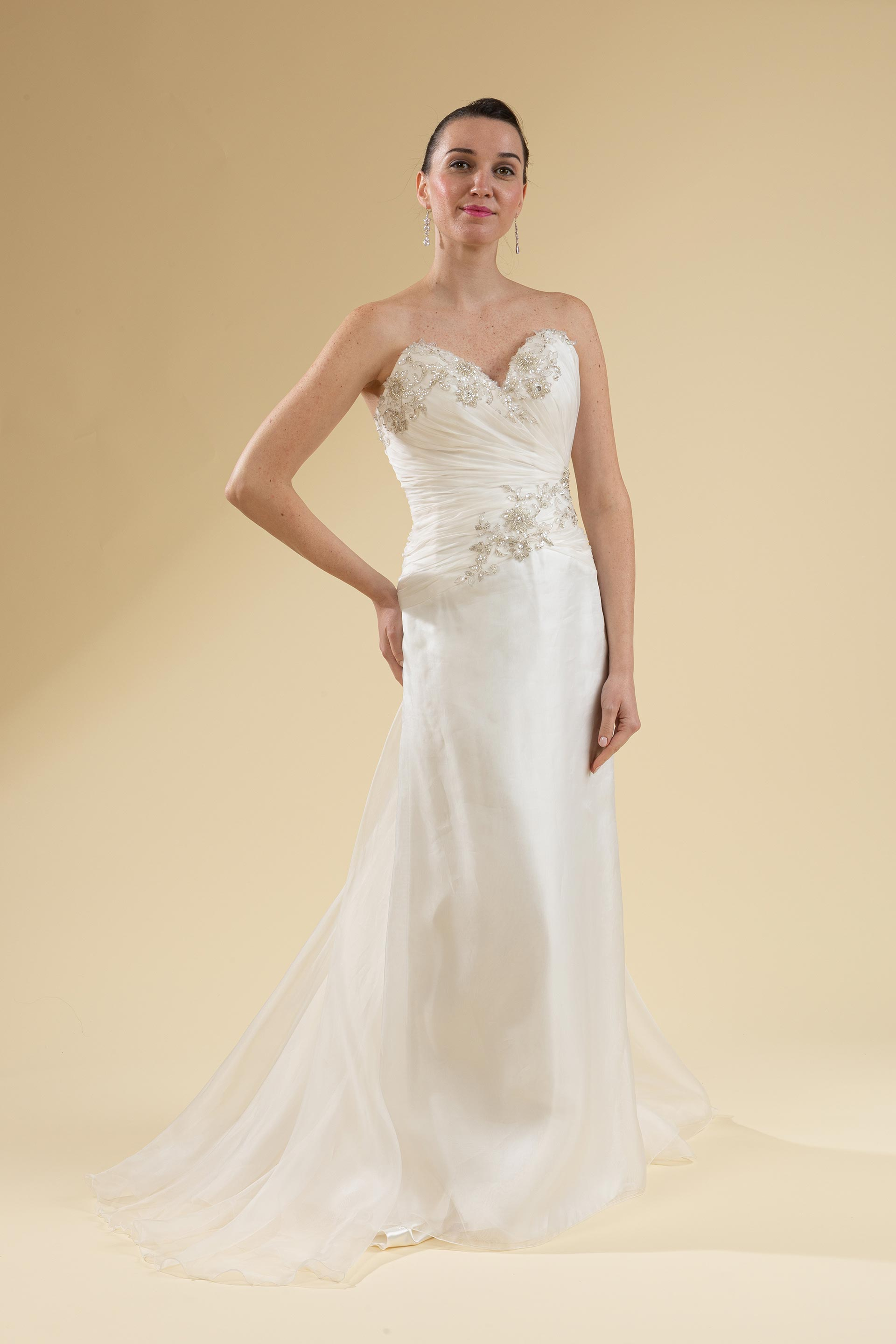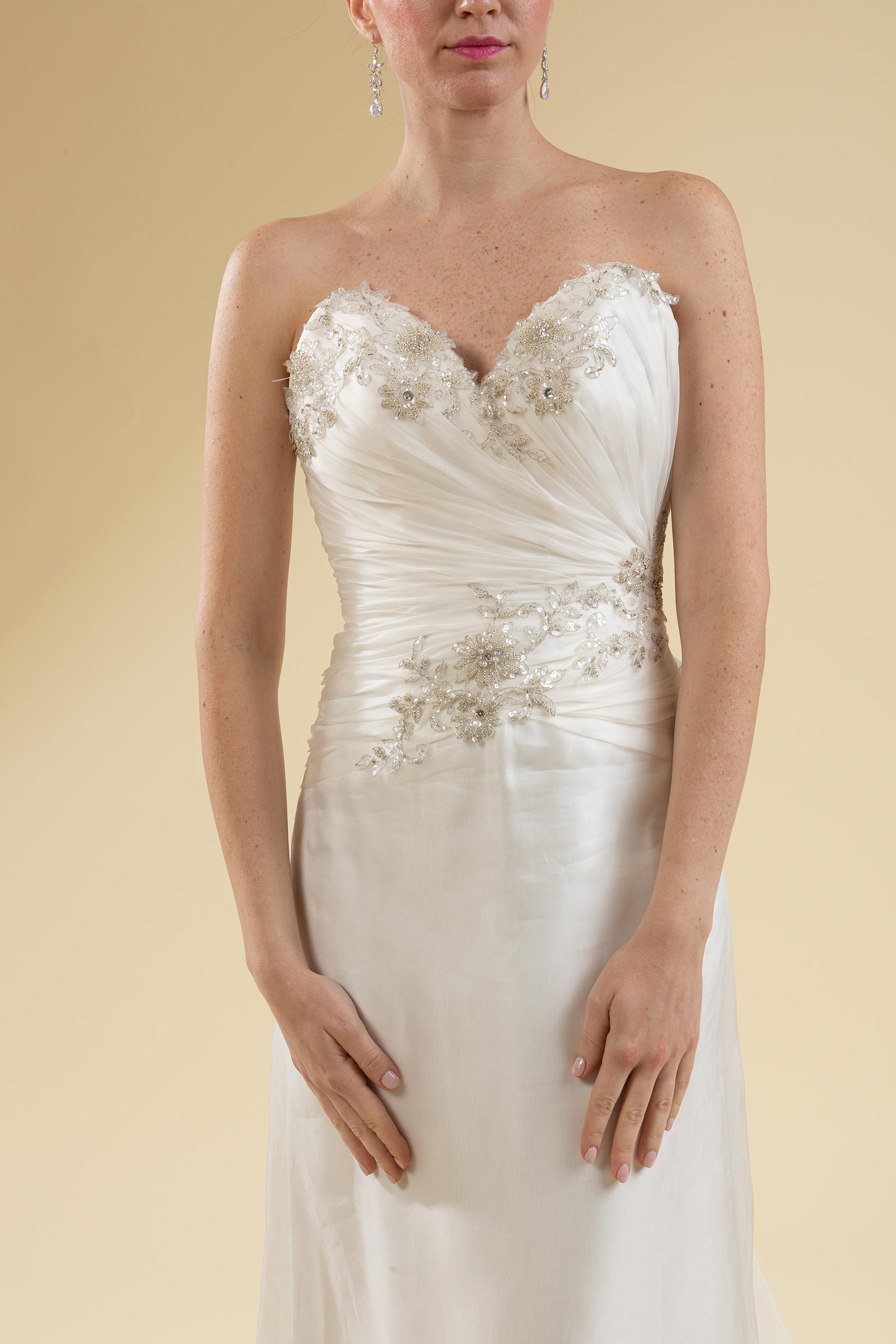 Abito sposa drappeggiato svasato con scollo a cuore e ricamo cristalli.