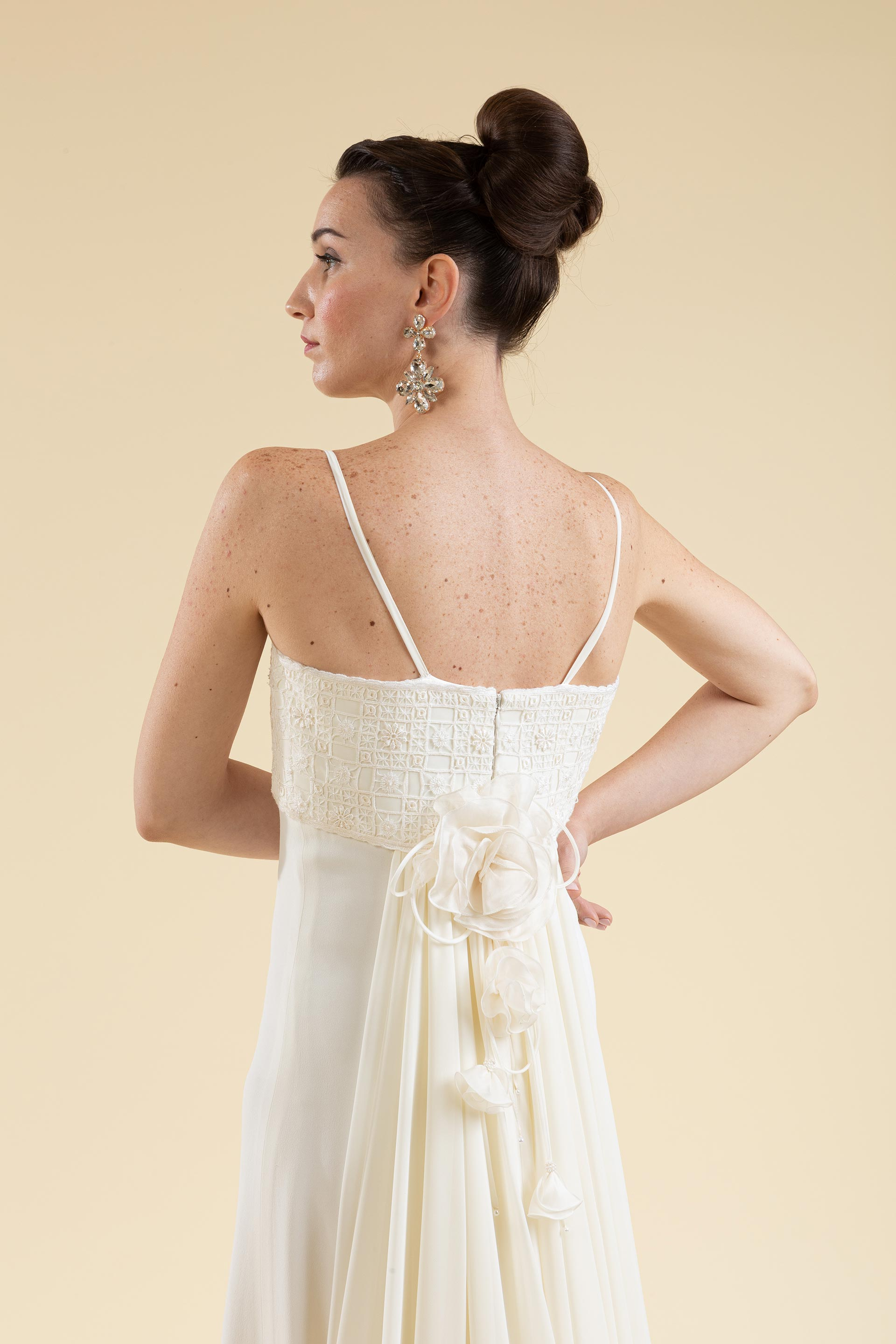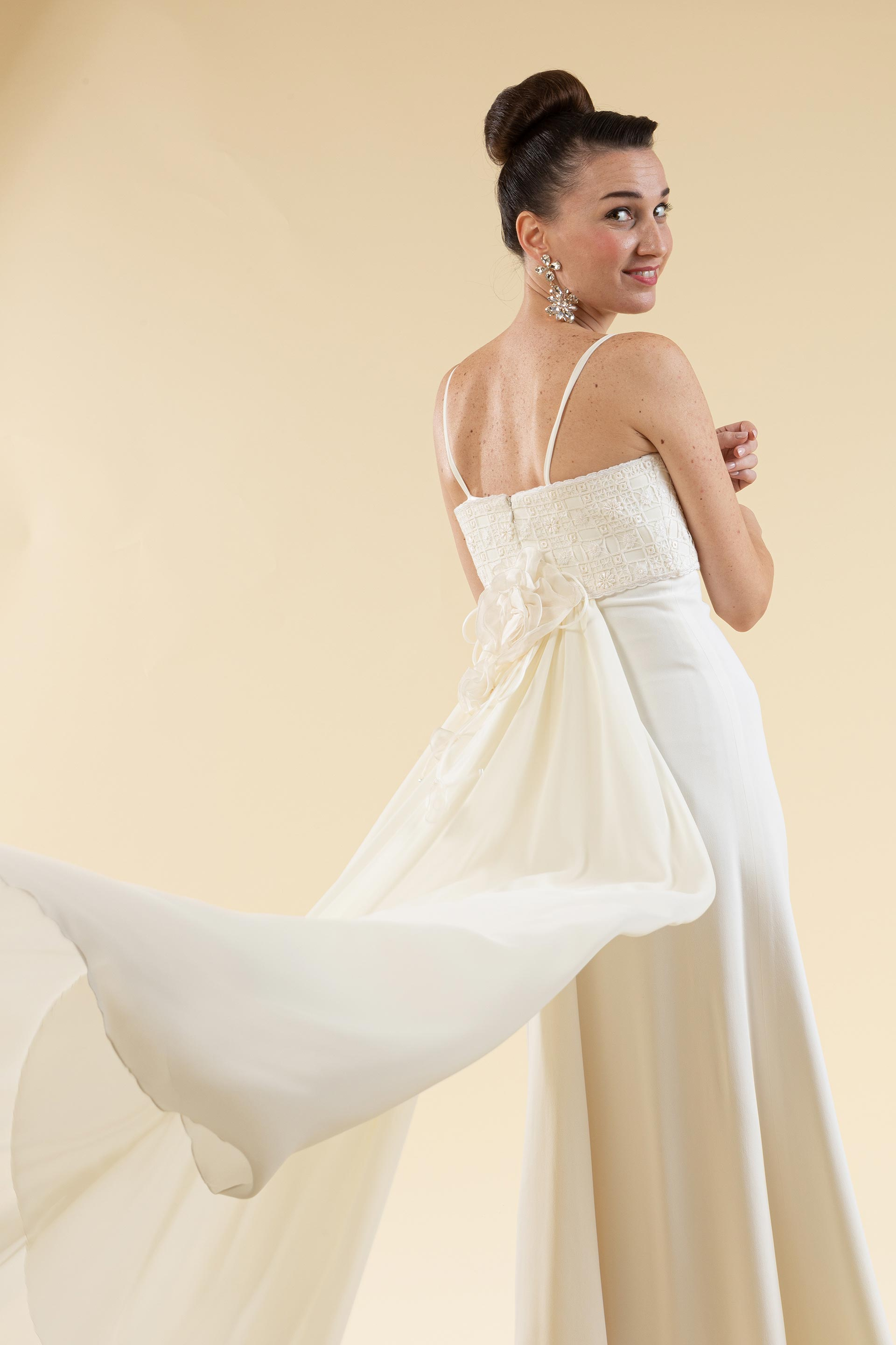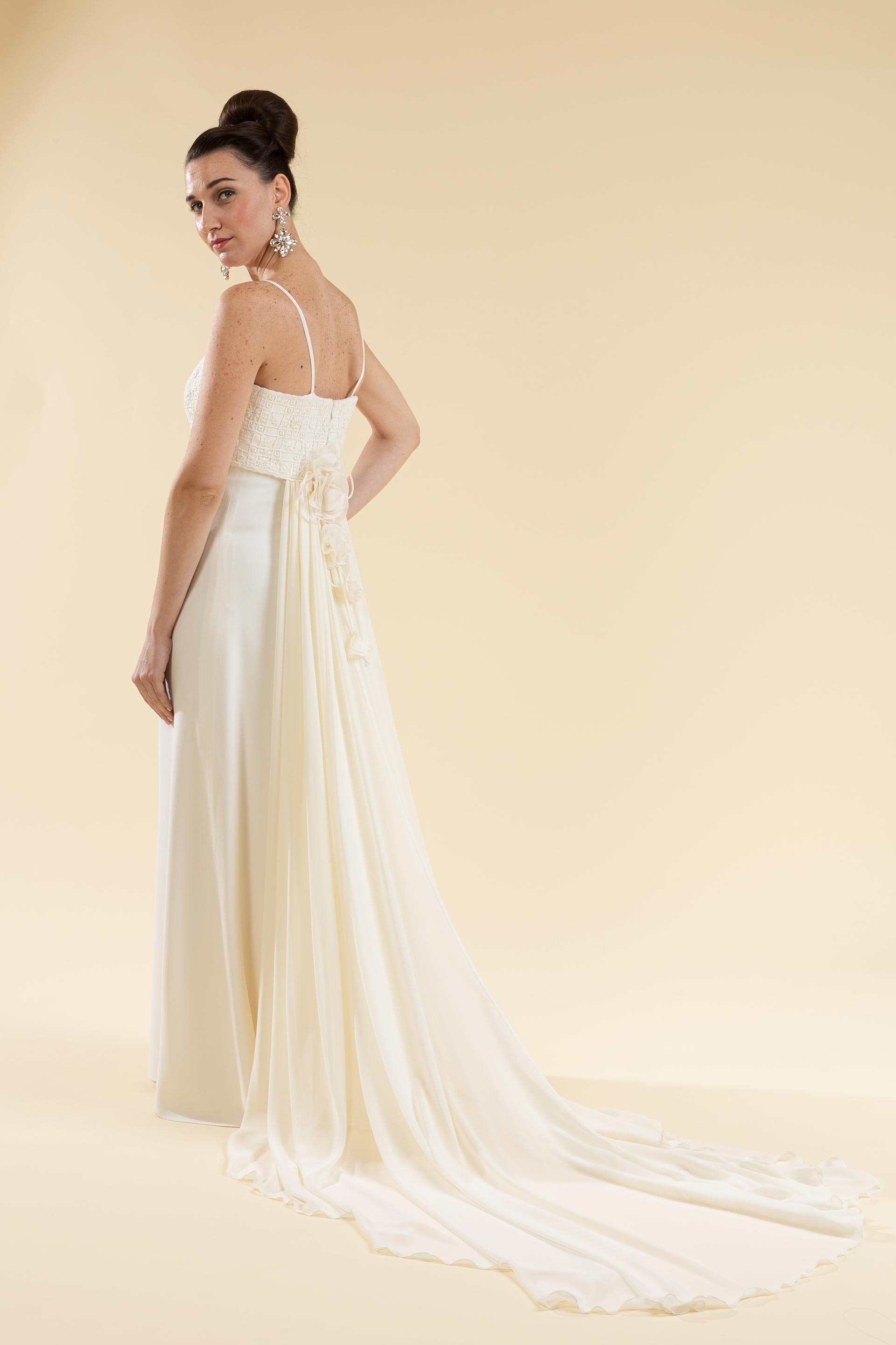 Abito sposa stile impero con corpetto in pizzo, con coda realizzata in fluido tessuto di voile e rosa applicata.