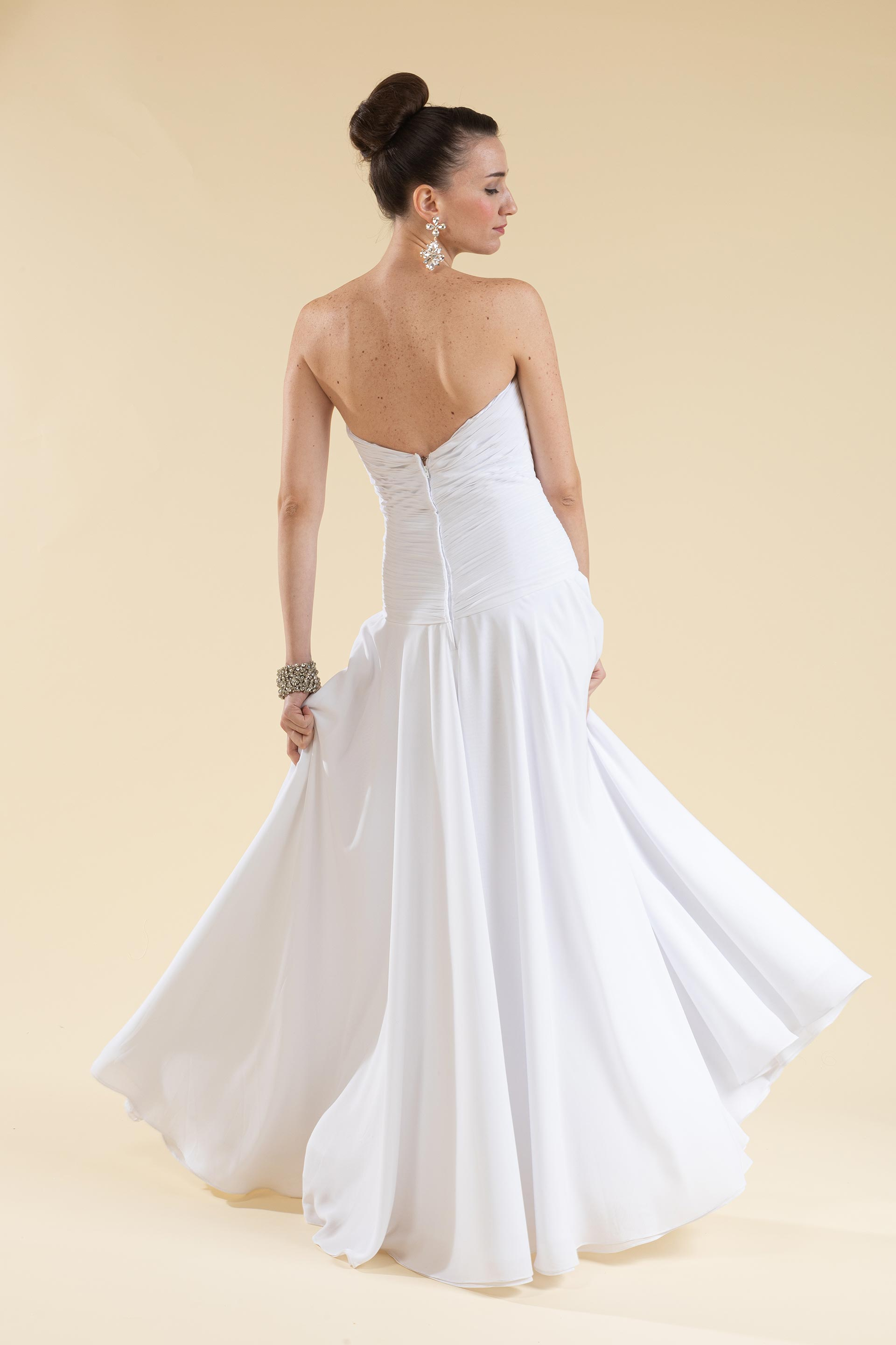Abito sposa drappeggiato a décolleté realizzato in tessuto di voile.