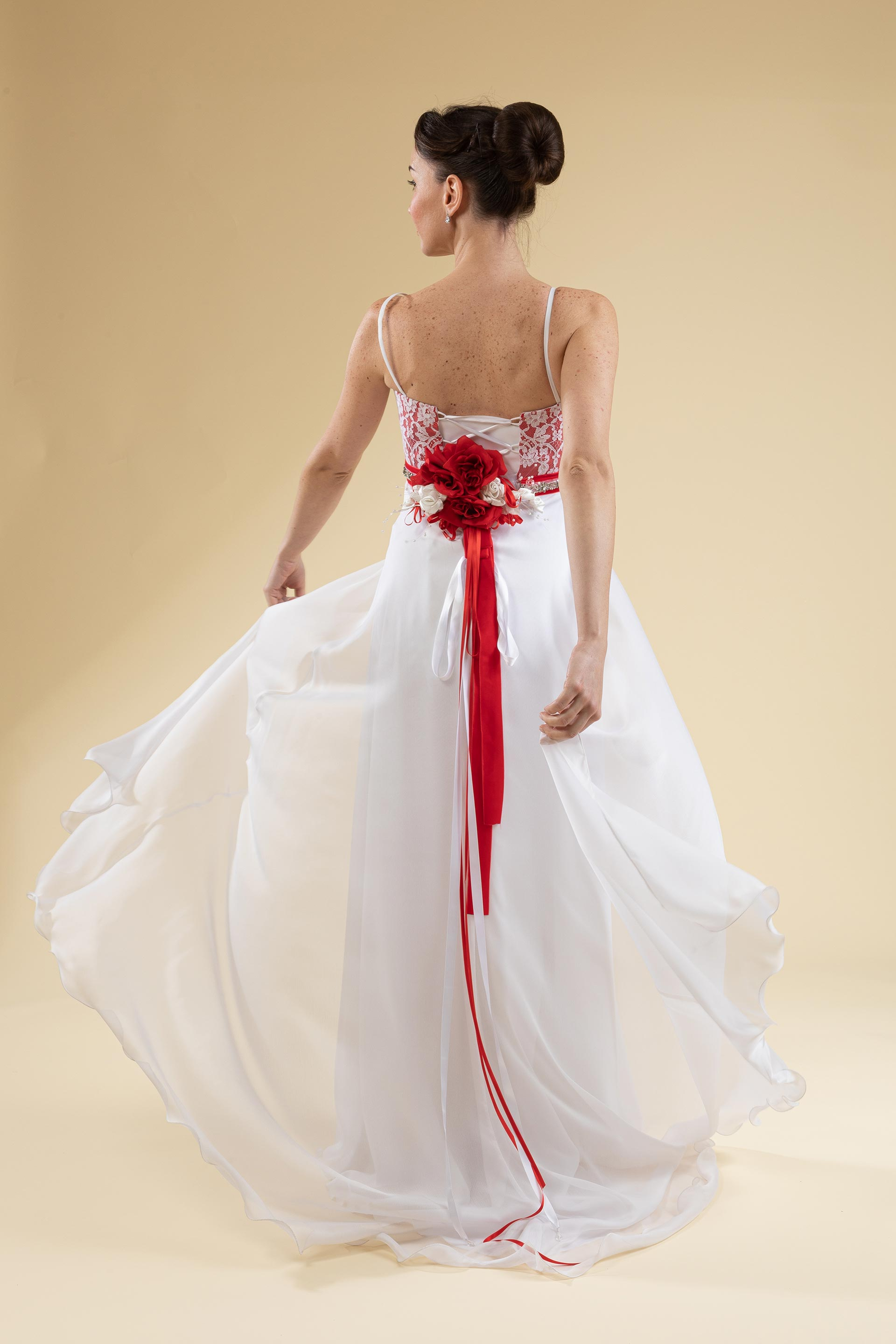 Abito sposa stile impero bicolore bianco/rosso con pizzo e dettagli strass, con chiusura a laccetti.