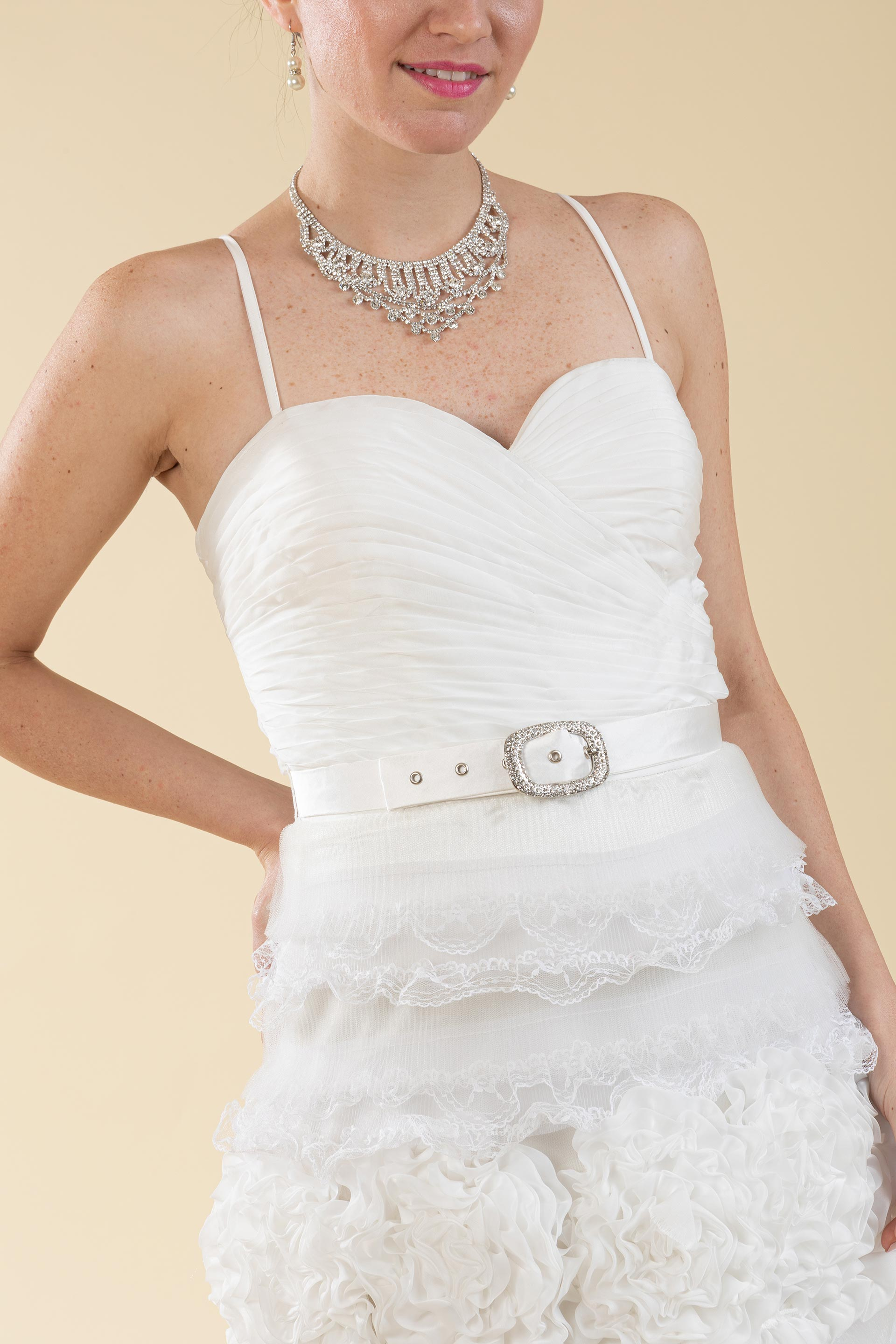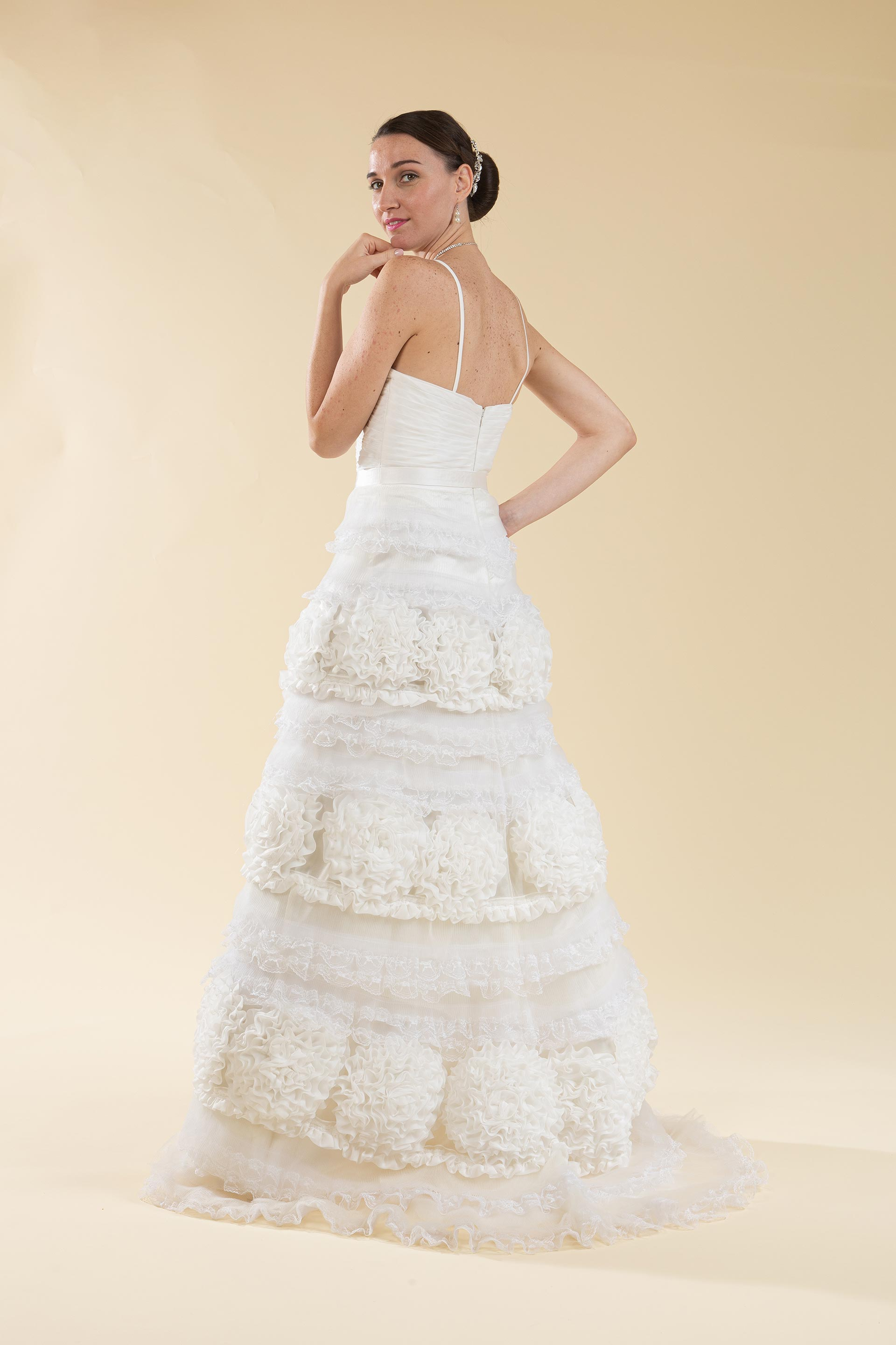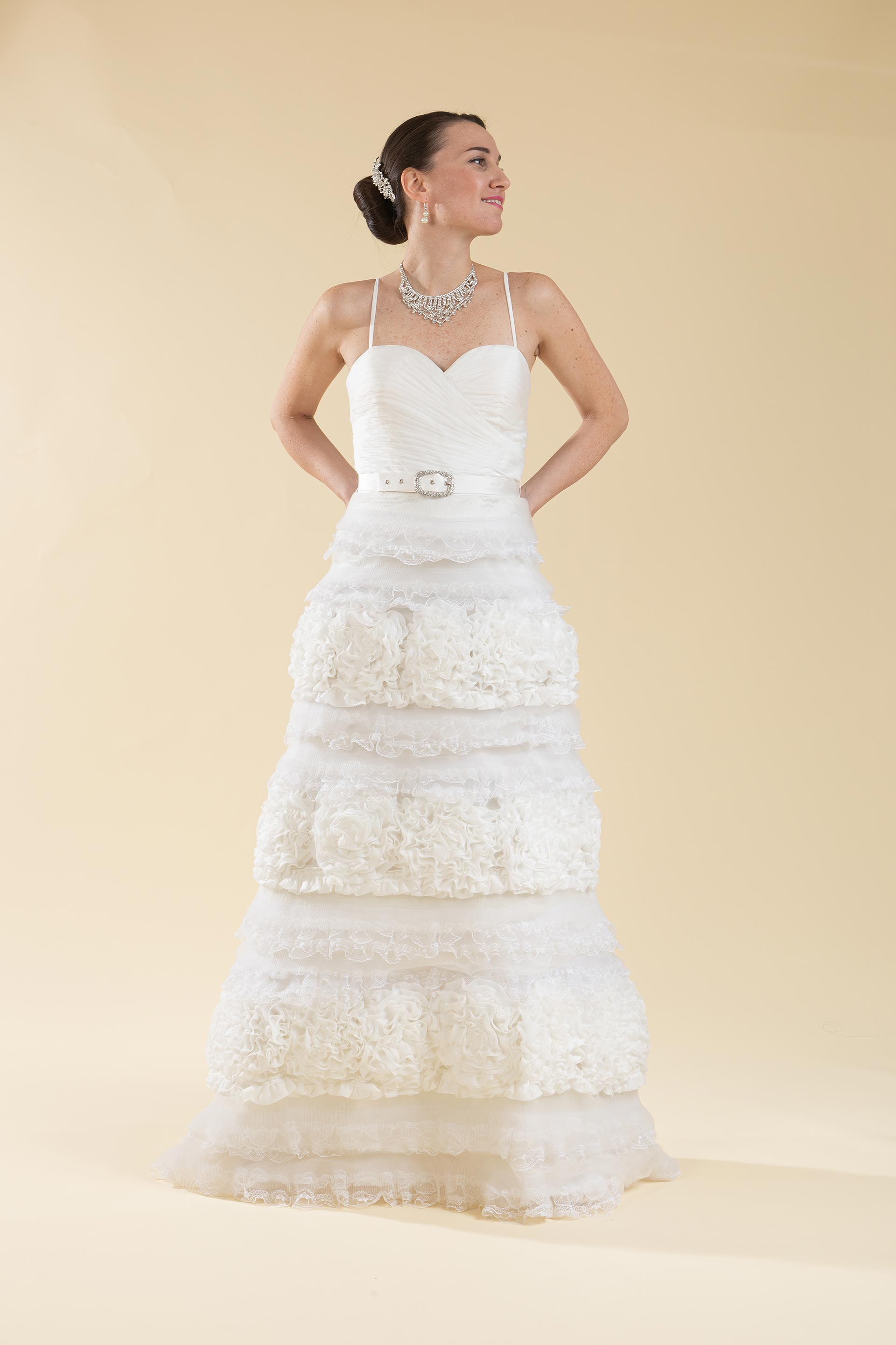 Particolarissimo abito sposa con dettagli pizzo e arricciature.