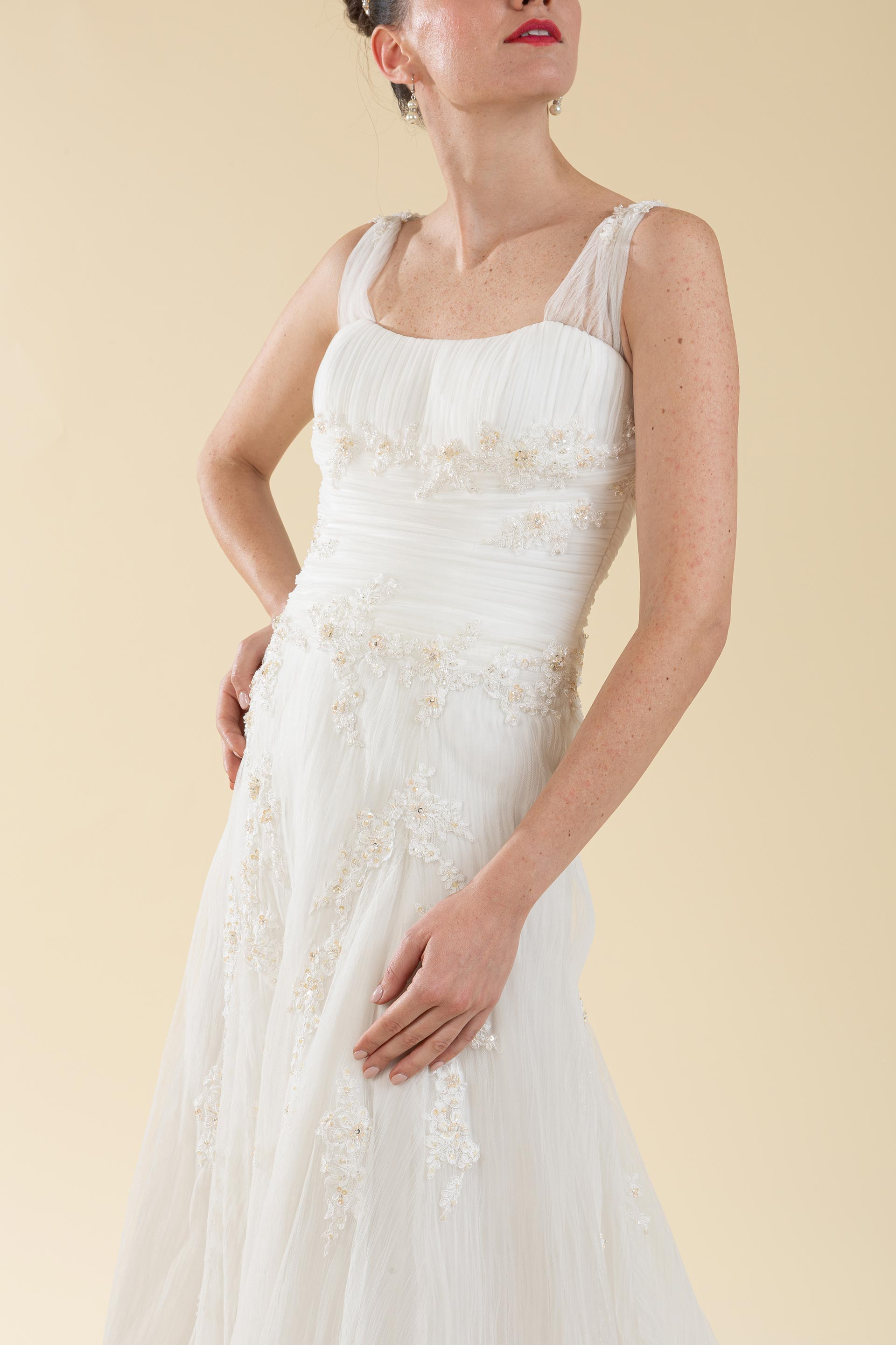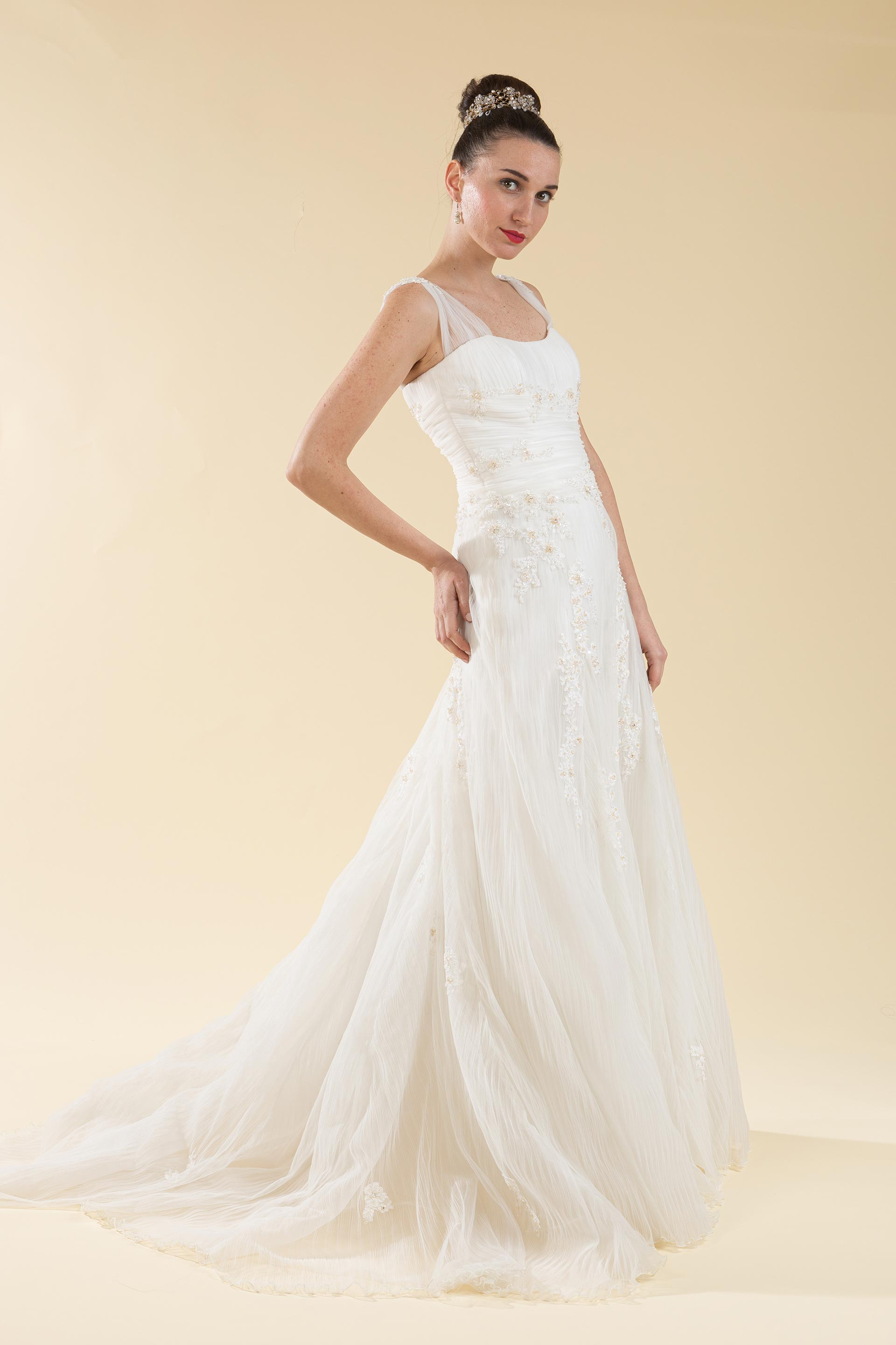 Abito sposa scivolato in tulle plissè con spallina larga in trasparenza e applicazioni pizzo.