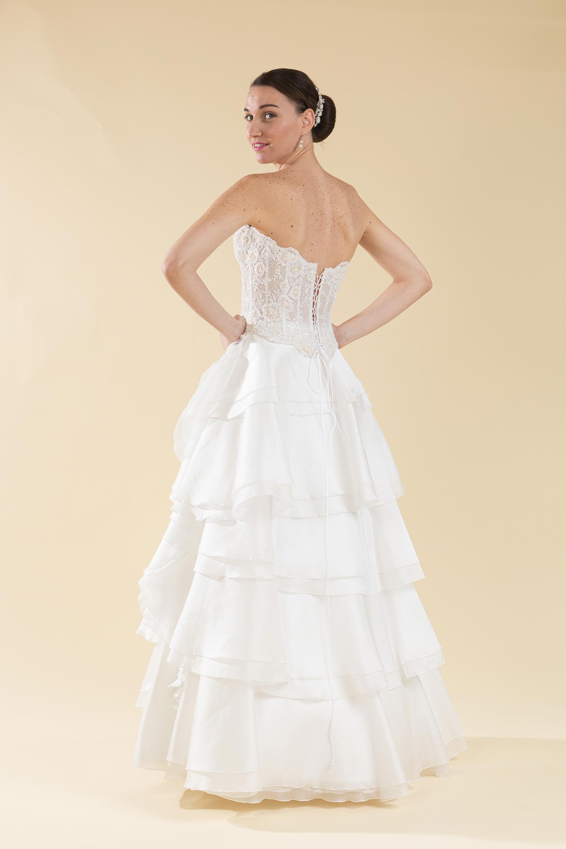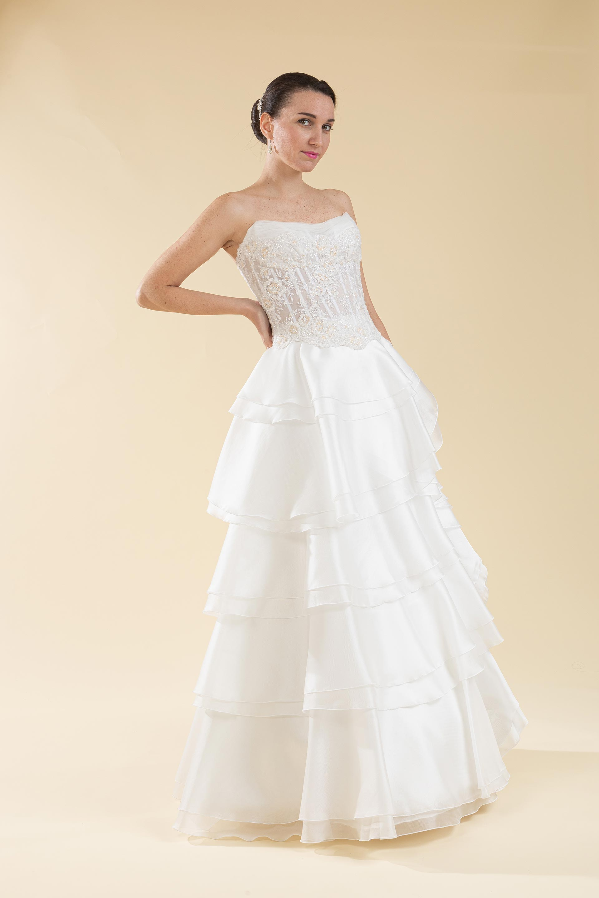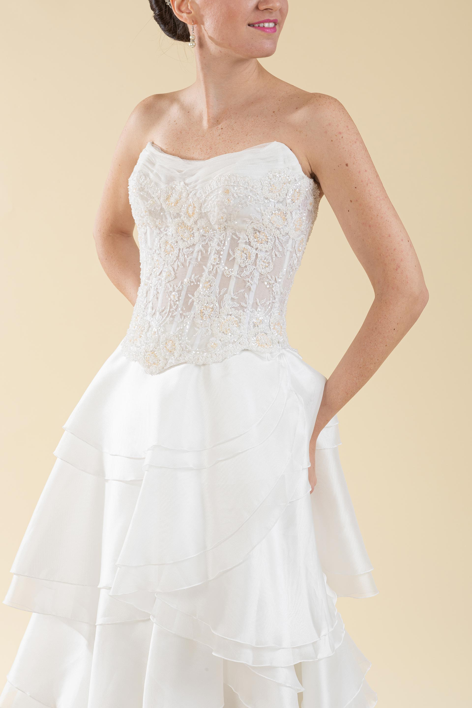 Abito sposa 2pz. bustino pizzo e gonna a balze.