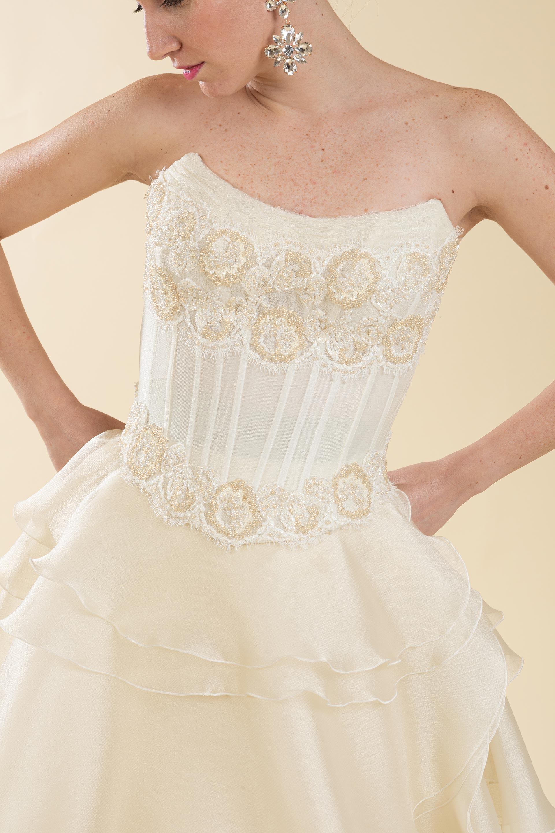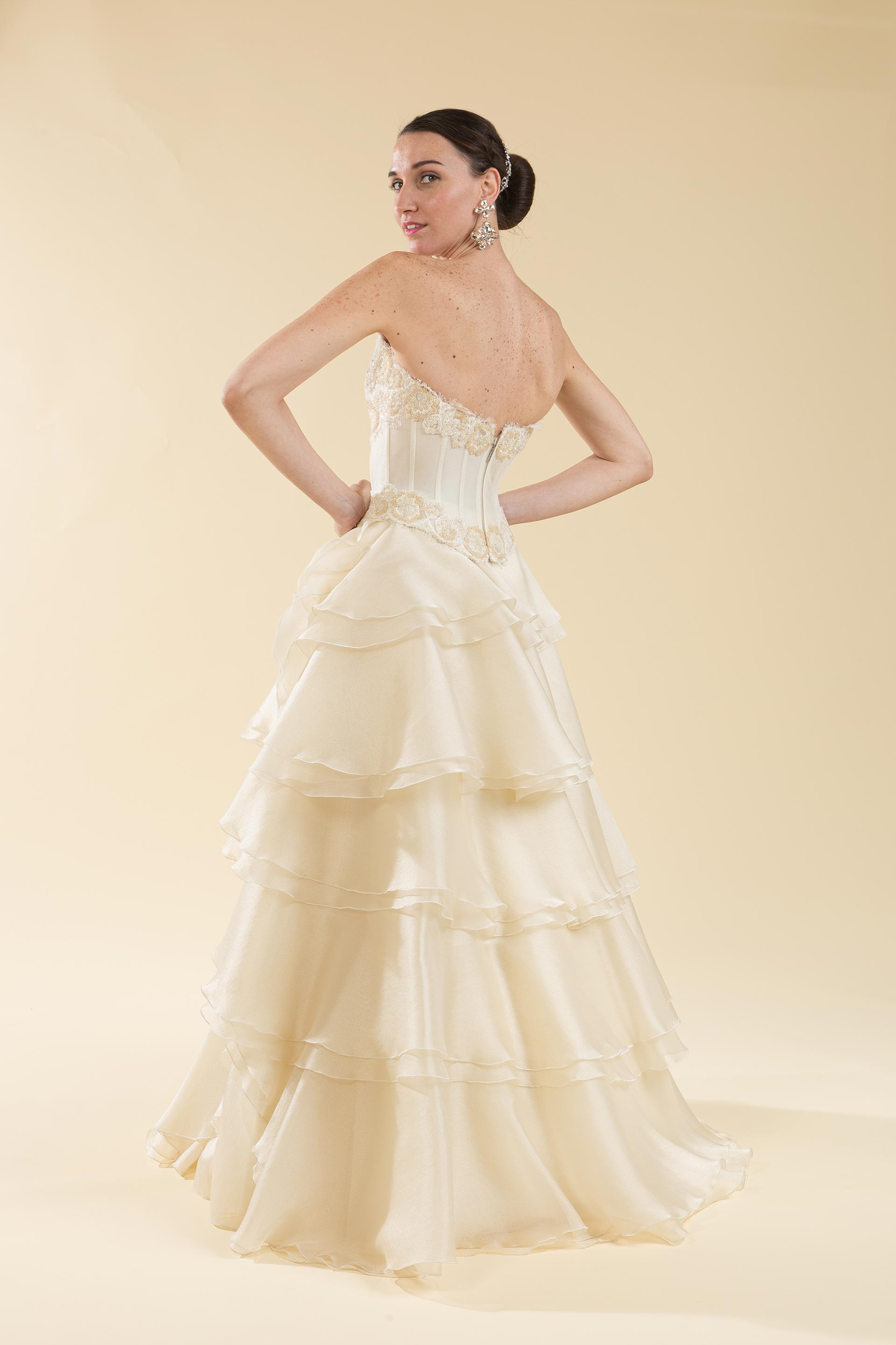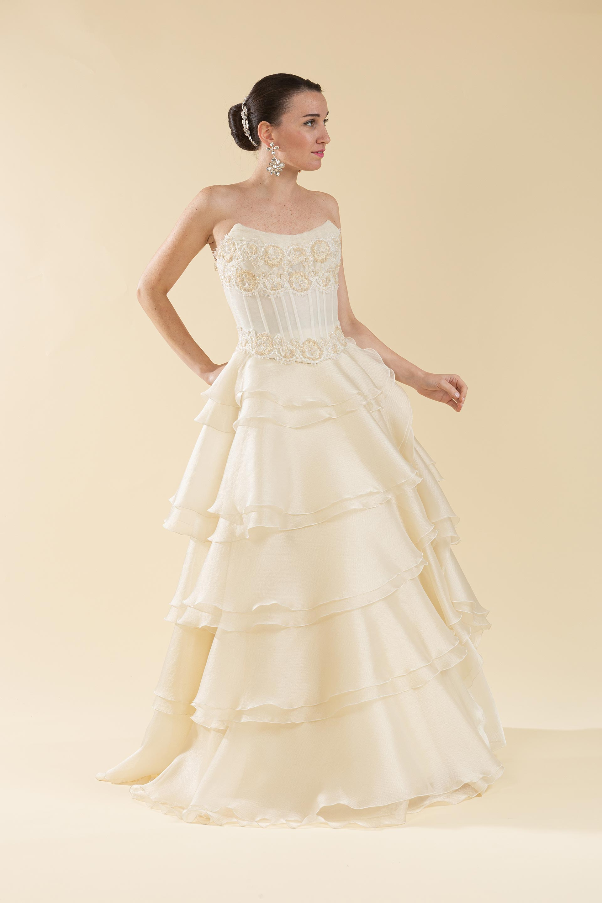 Abito sposa 2pz. bustino pizzo e gonna a balze.