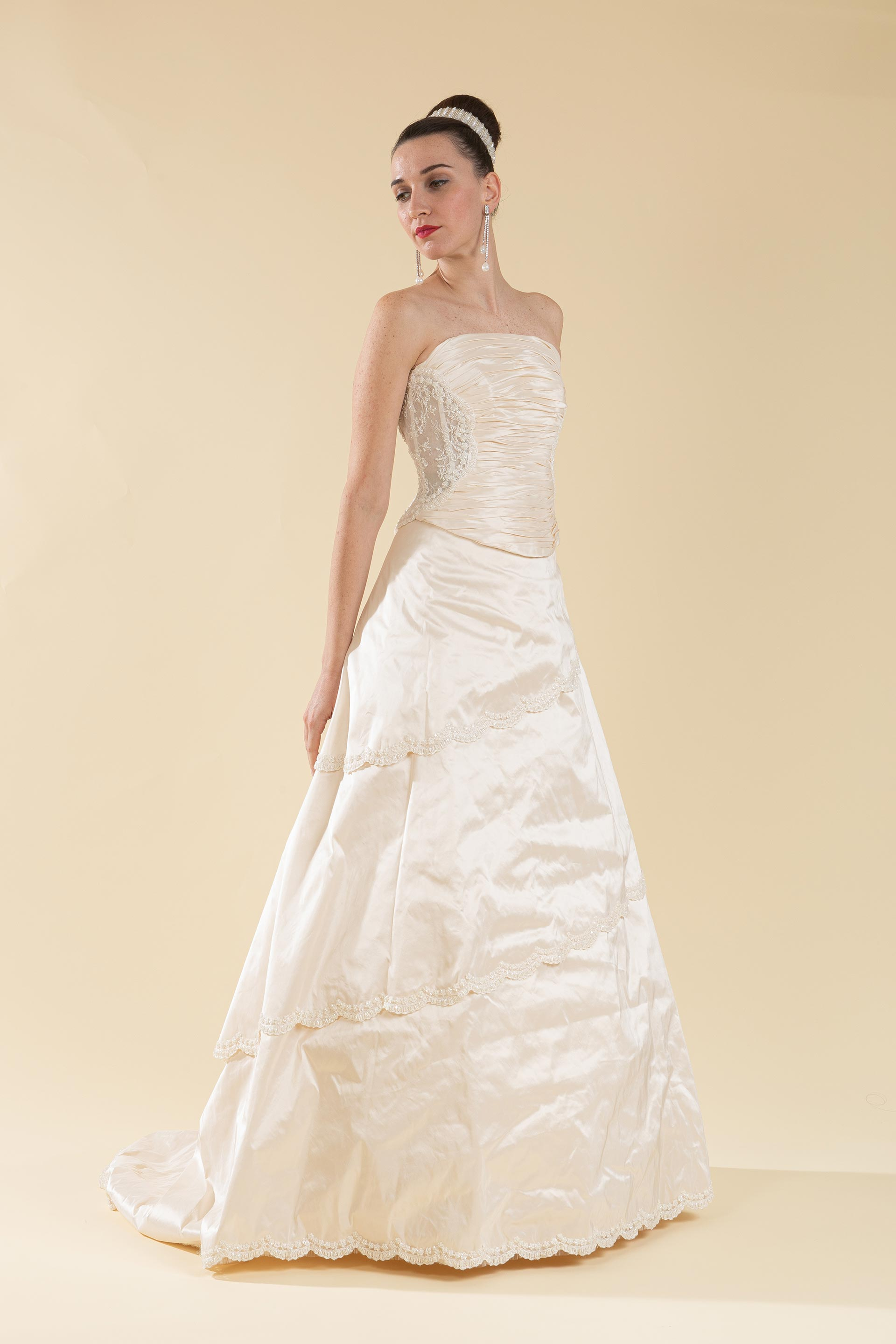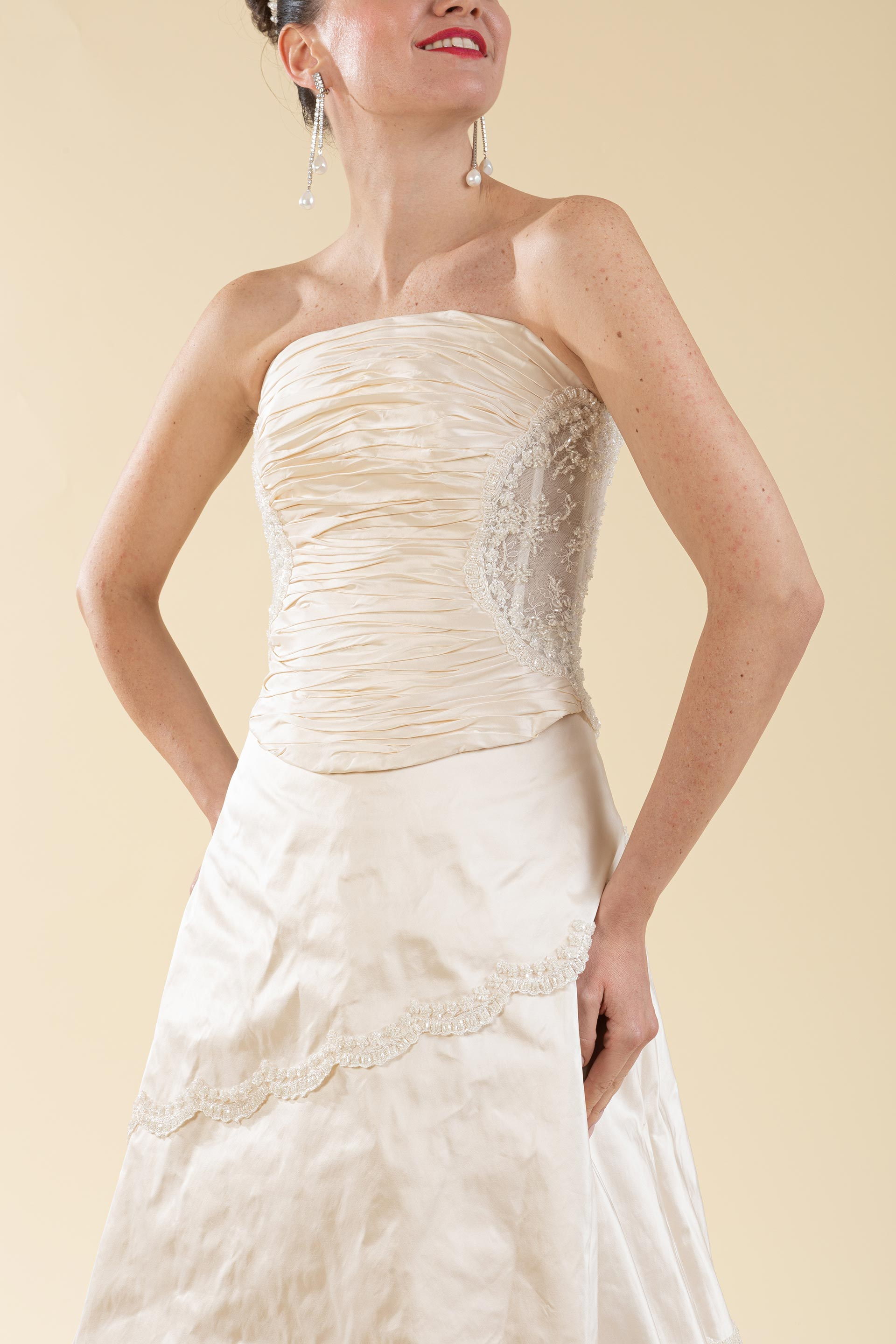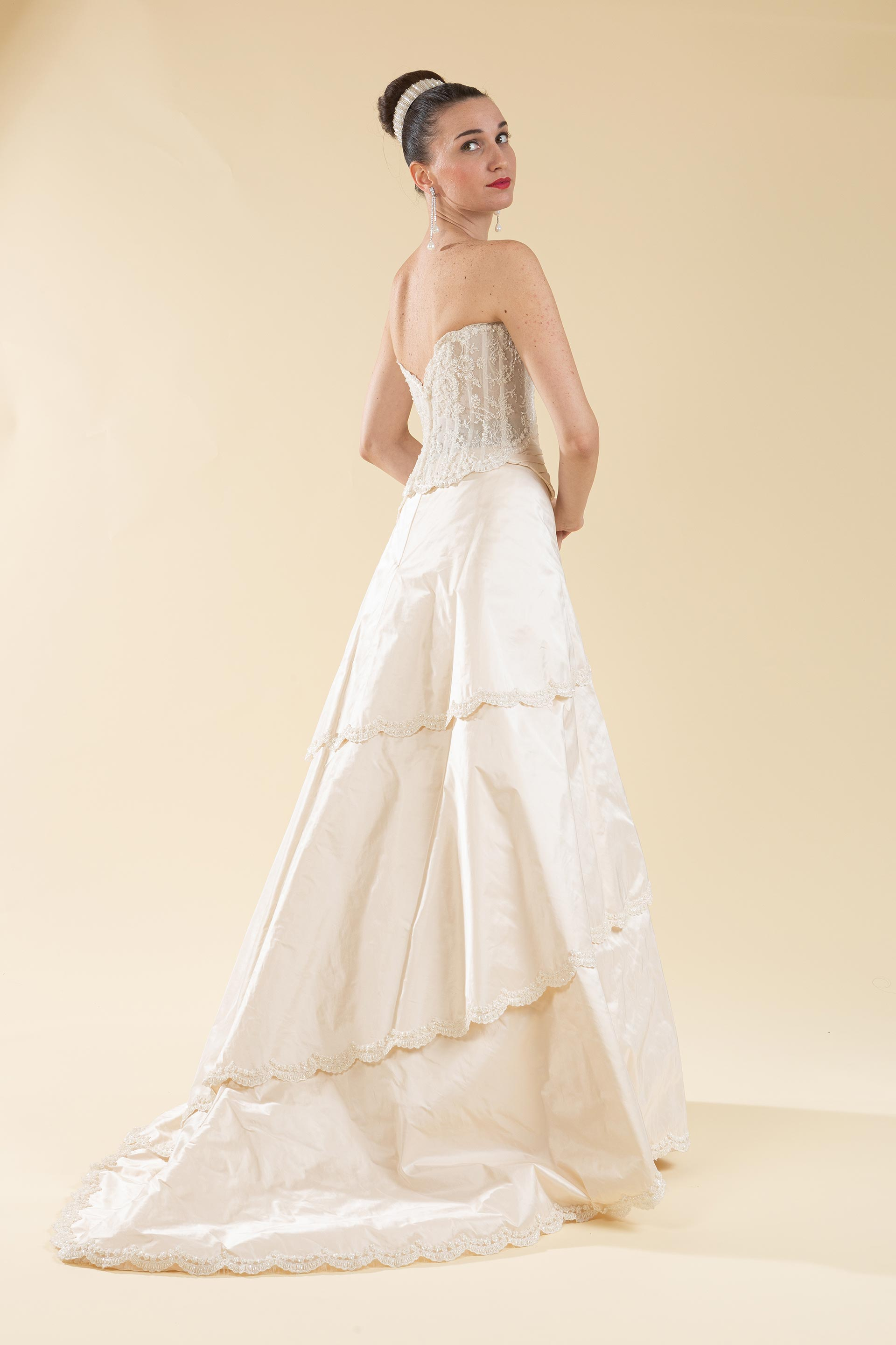 Abito sposa 2 pz. composto da bustino realizzato in tafetà drappeggiato con pizzo in trasparenza e gonna a balza piatta decorata con rifinitura di pizzo a cappe.