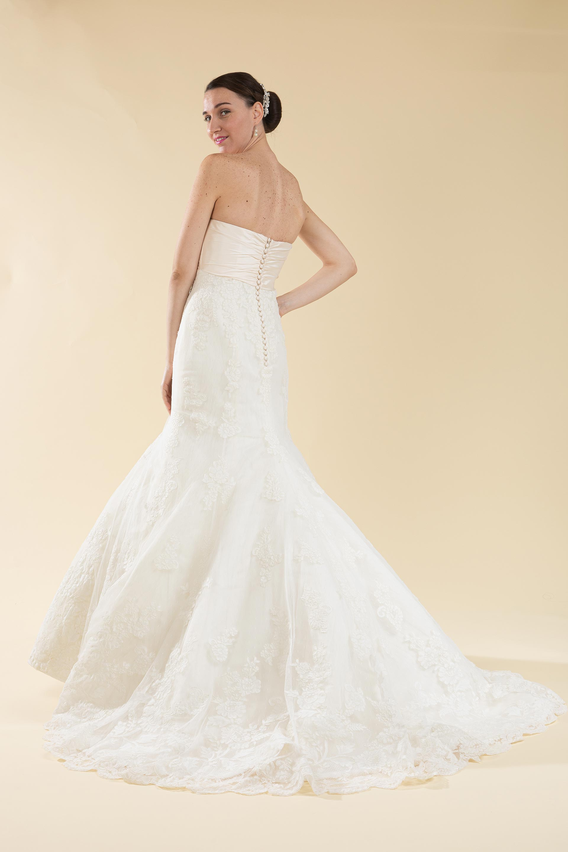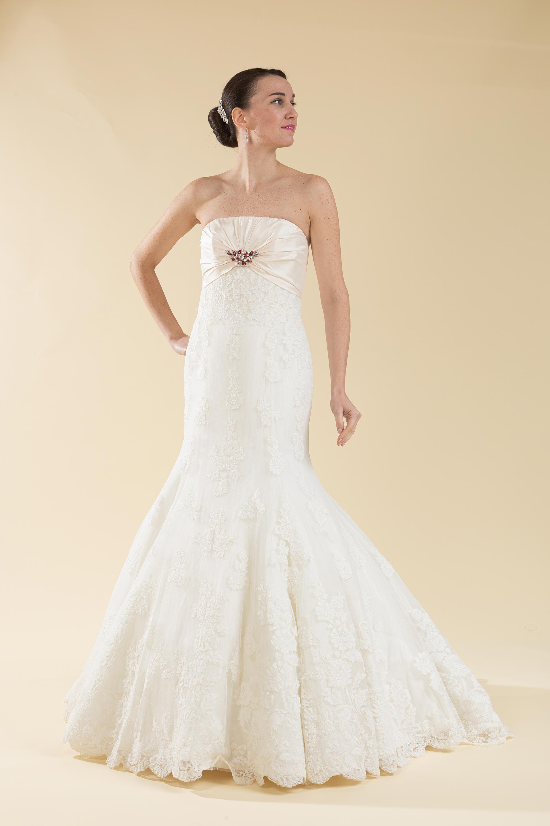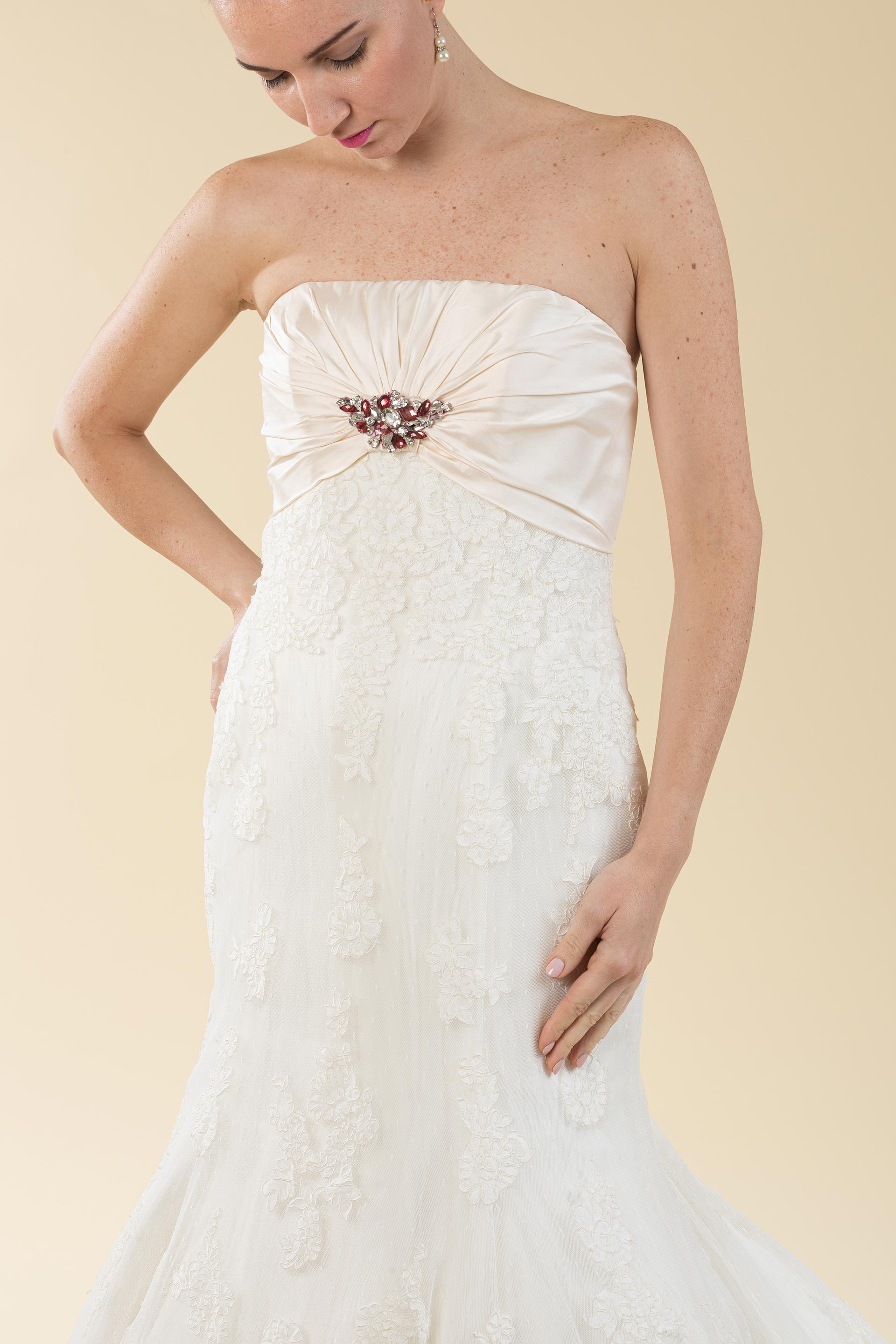 Abito sposa semi sirena in pizzo rebrodè con drappeggio sul seno in tessuto di Shantung impreziosito da un applicazione di strass color ciliegia e argento.