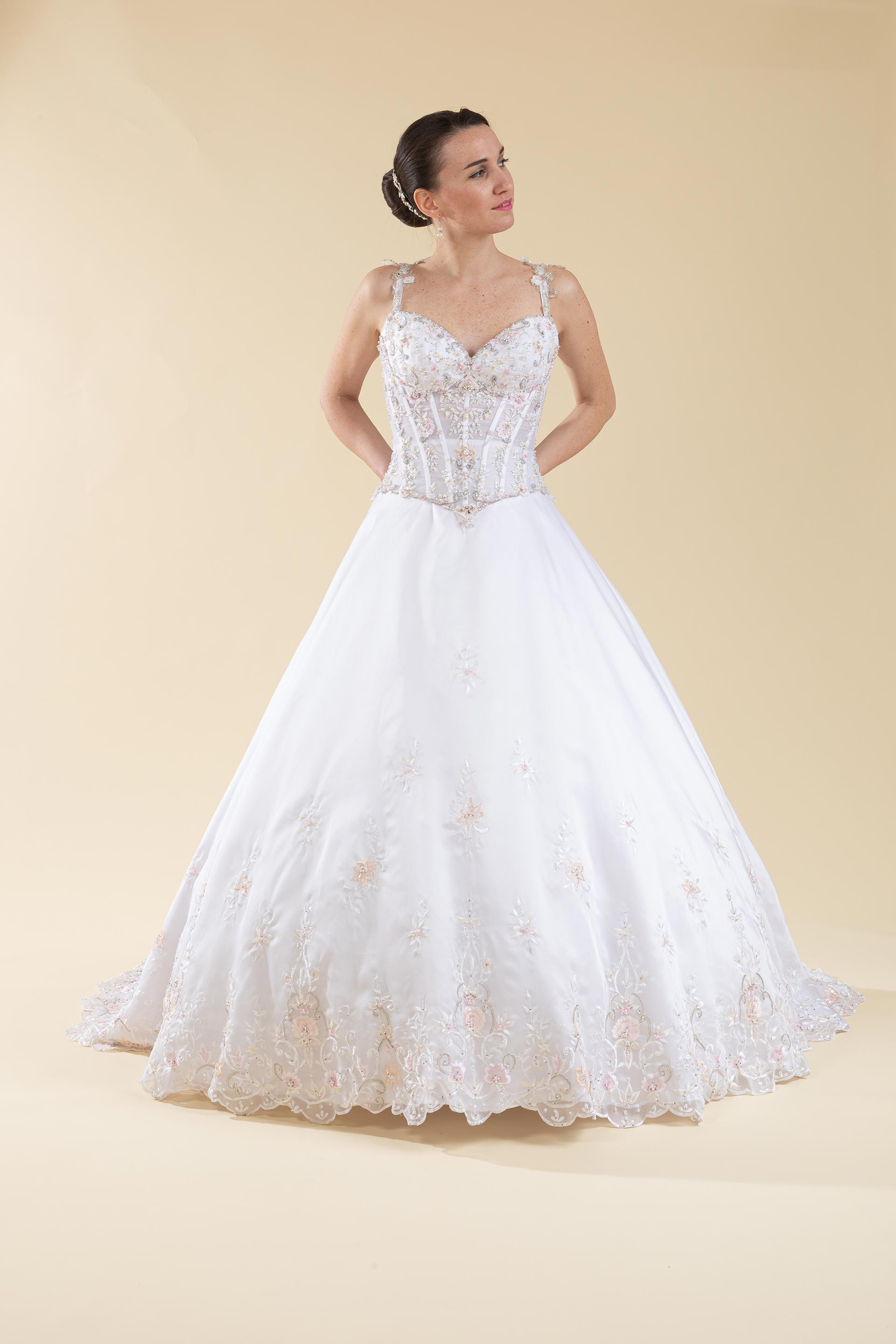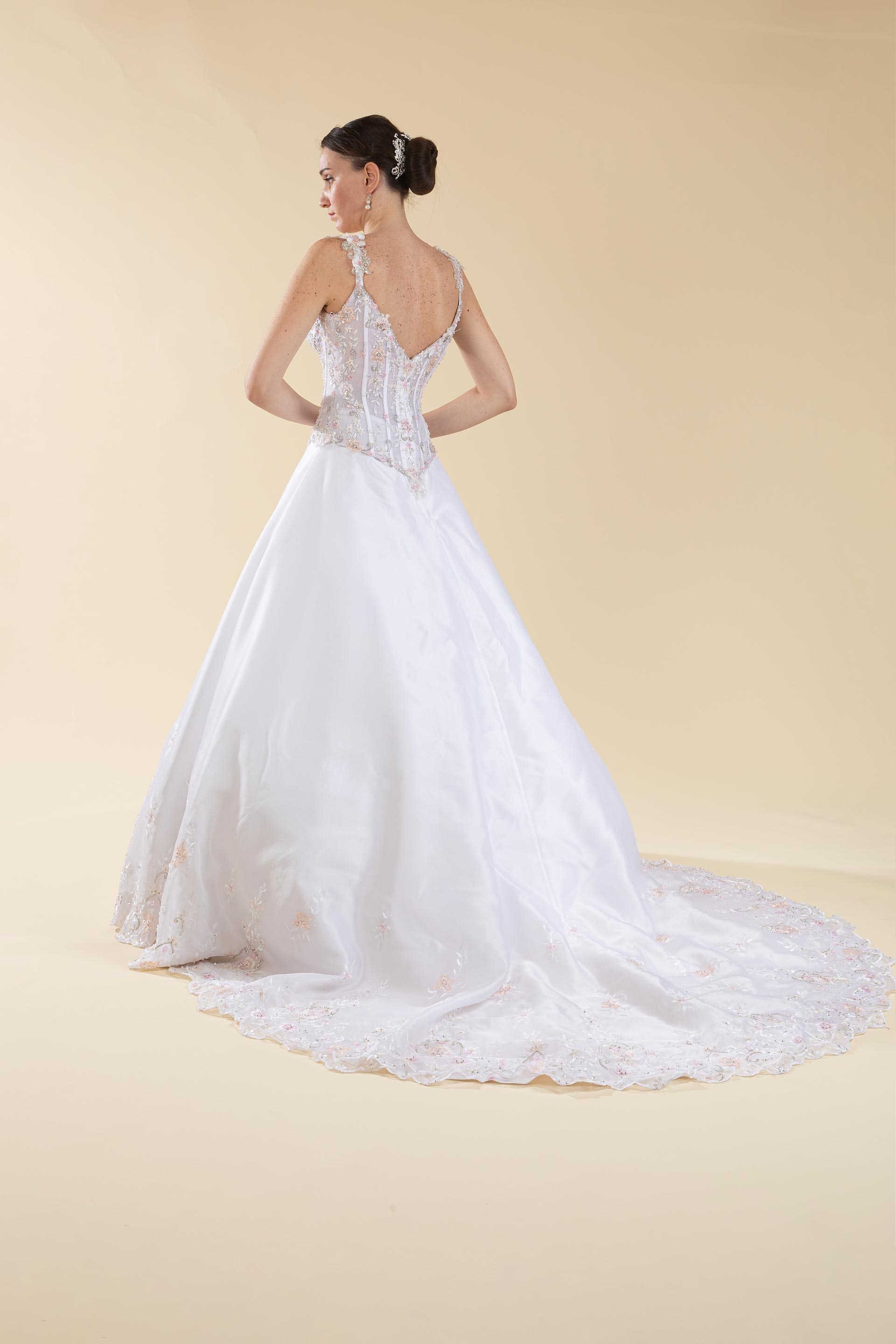 Abito sposa ampio con scollatura a cuore profonda e manichette, il corpetto è realizzato in pizzo bicolore semi trasparente, la gonna in organza ricamata.