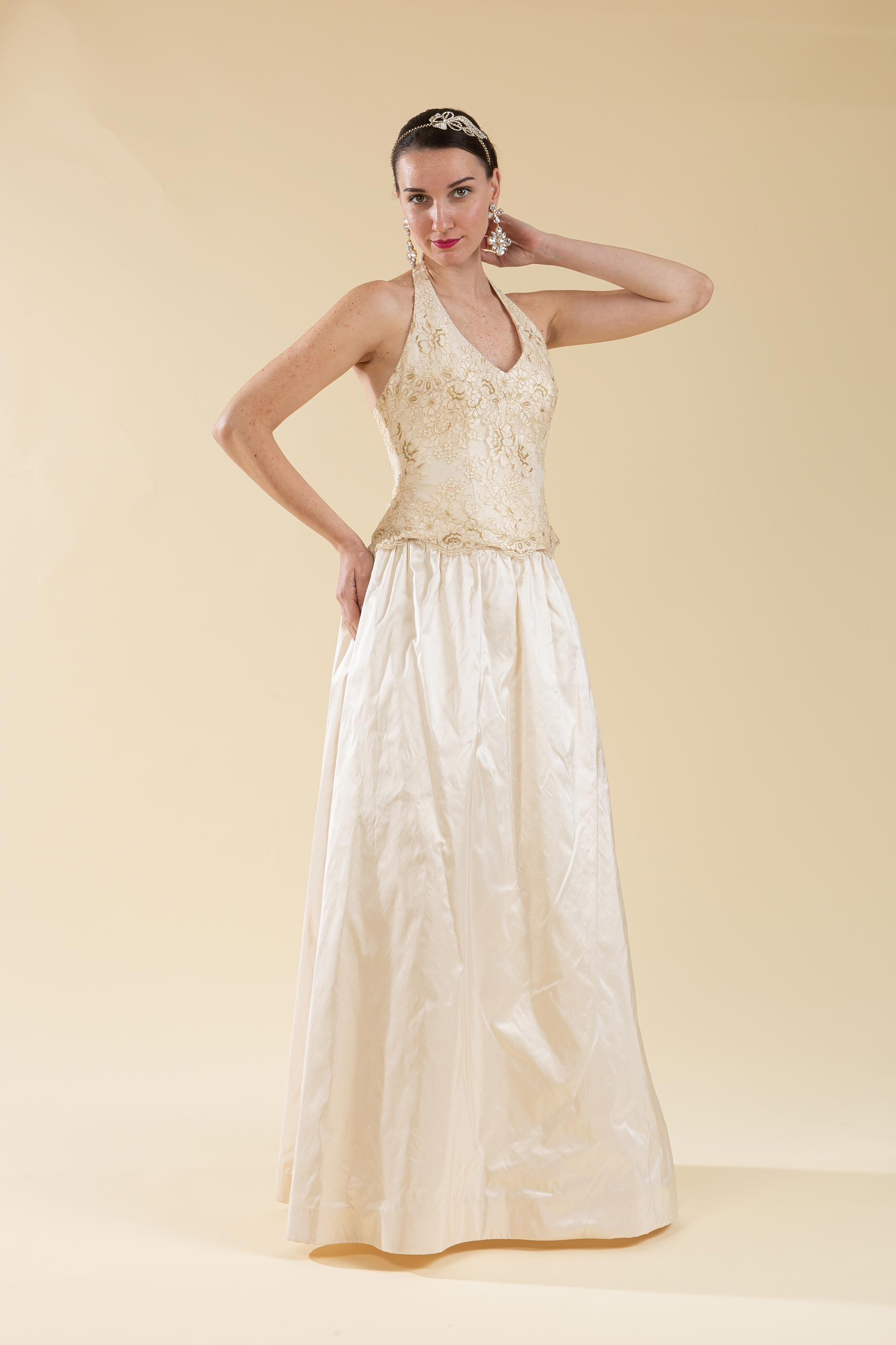 Abito sposa 2 pz. bustino con scollo all'americana realizzato in pizzo e gonna di taglio ampio realizzata in taffetà color avorio dorato.