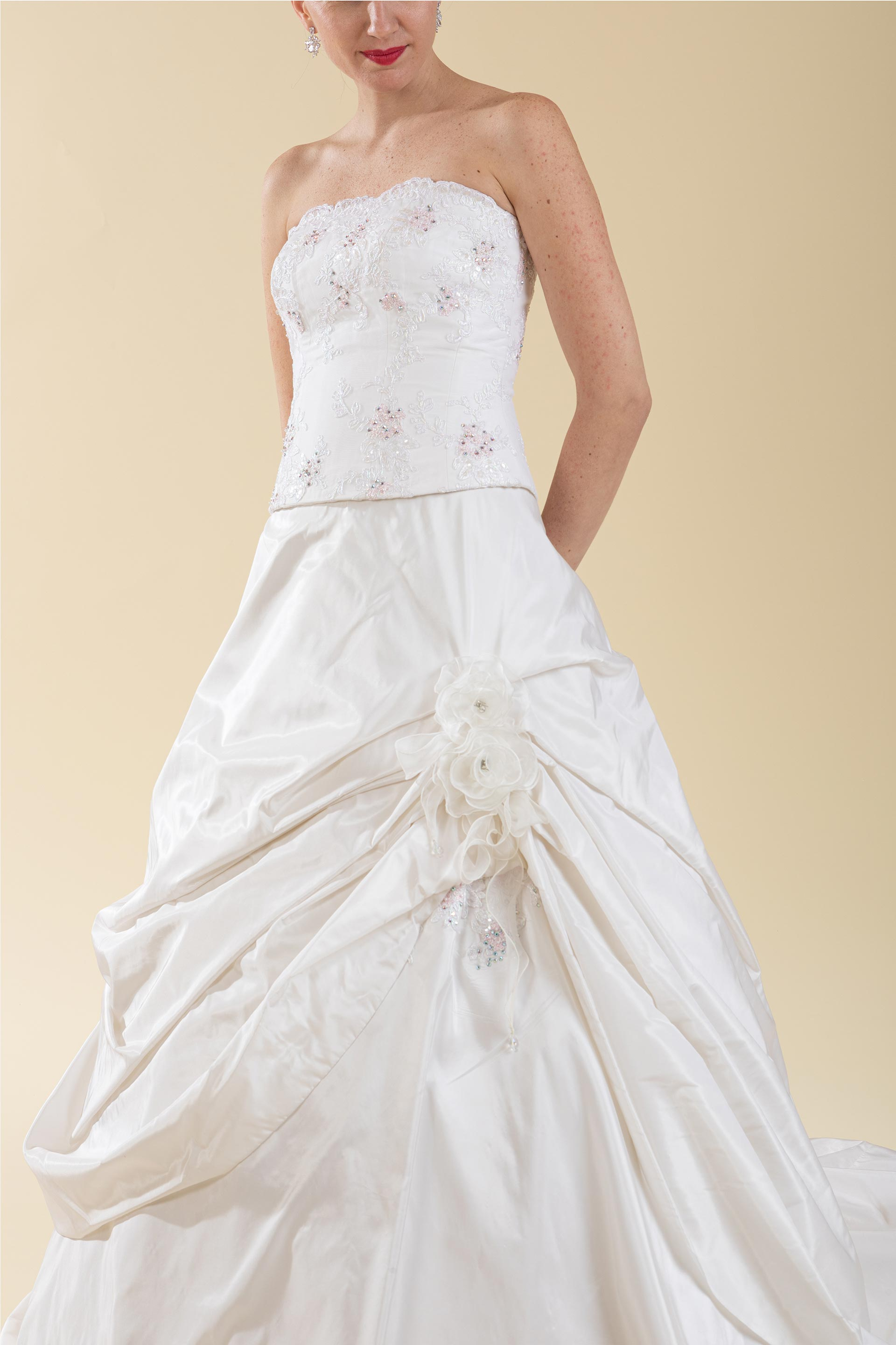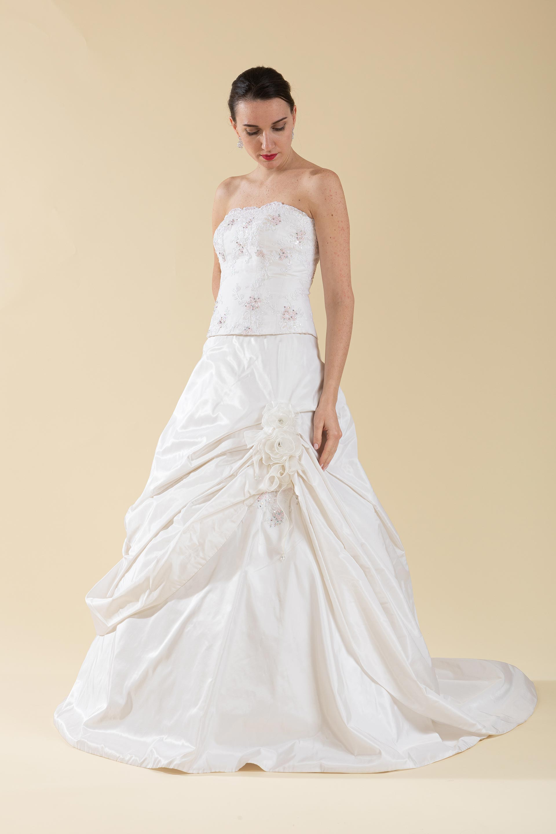 Abito sposa 2 pz. composto da bustino in pizzo bicolore avorio/rosa e chiusura a laccetti, gonna ampia ripresa impreziosita da coppia di fiori in organza.