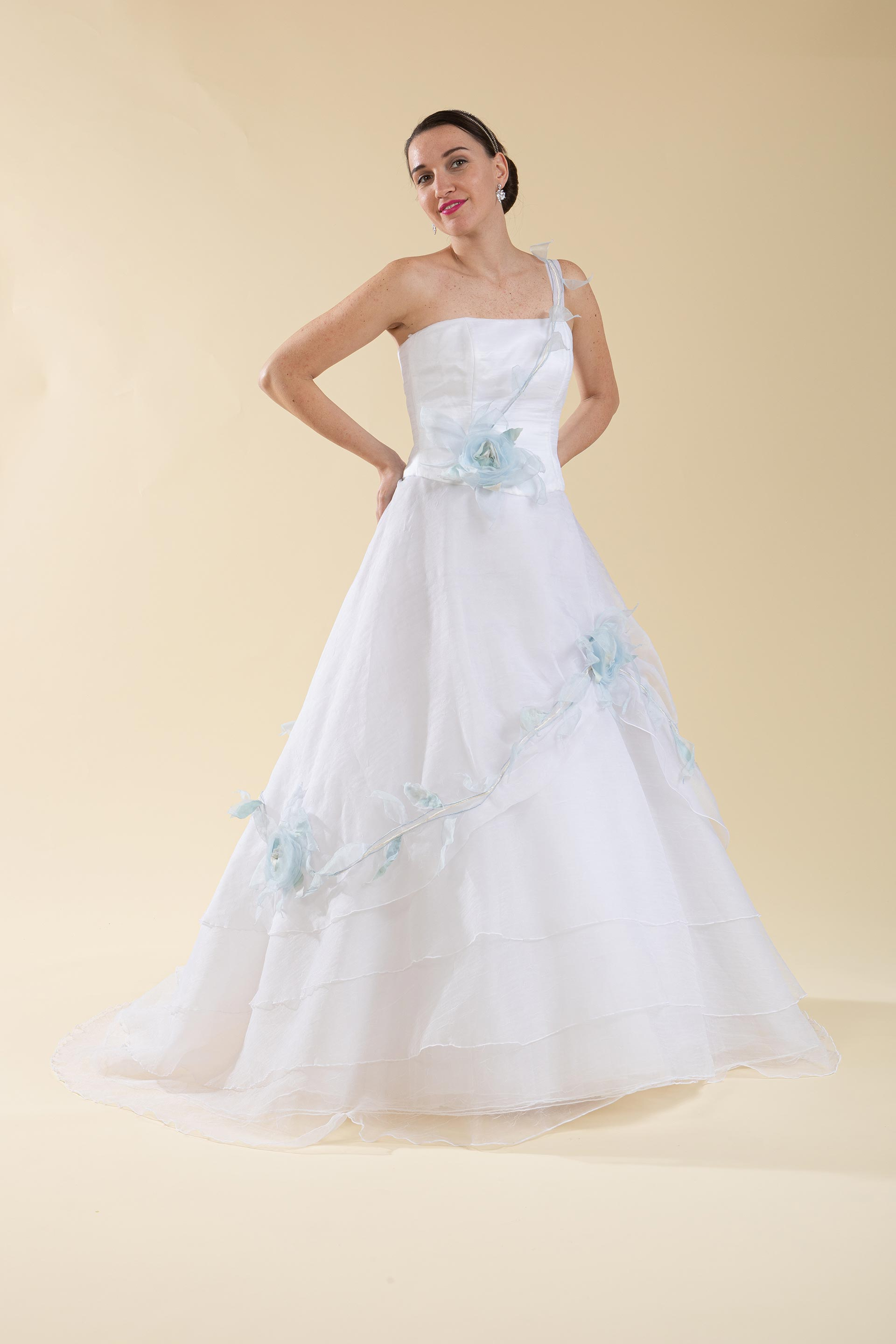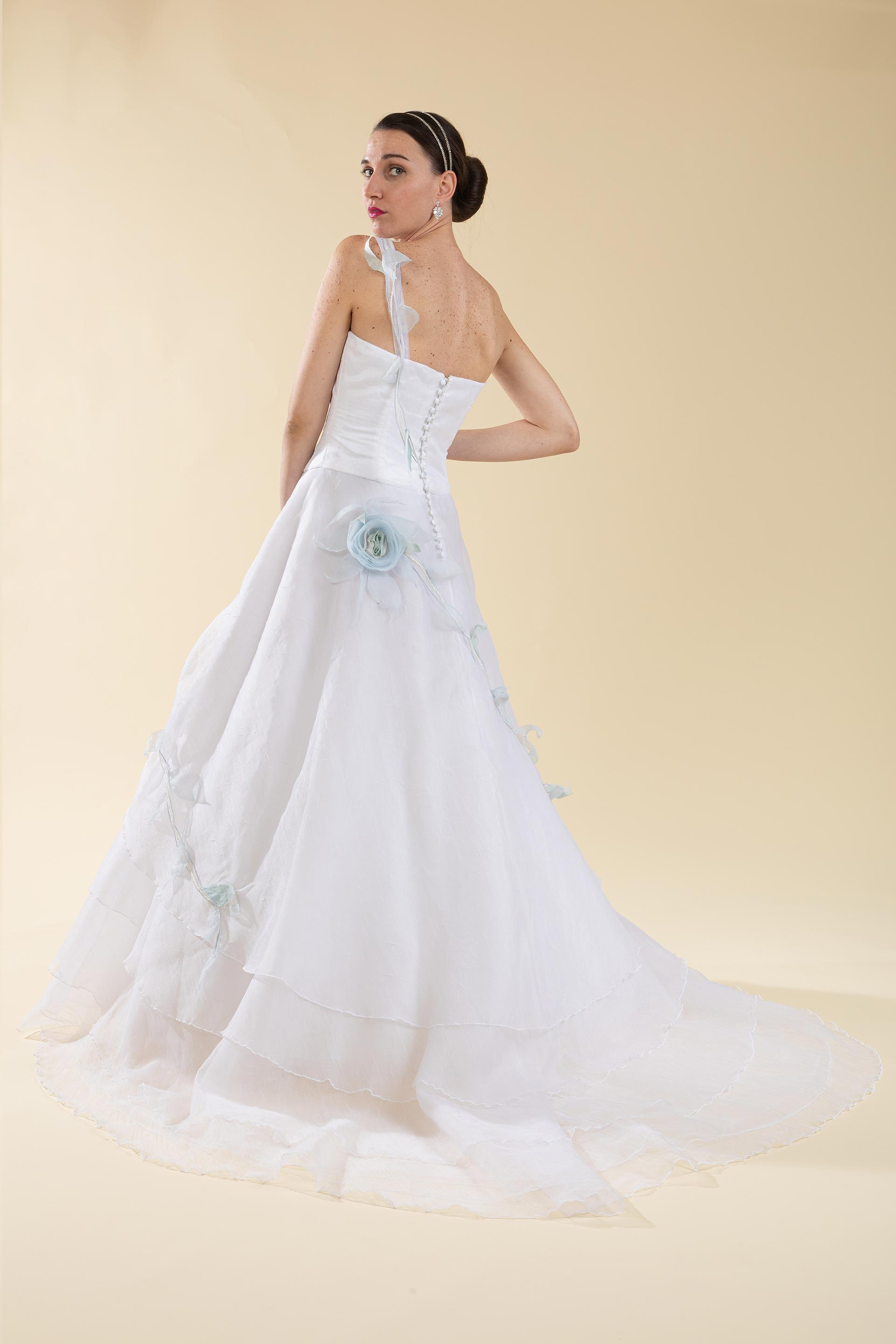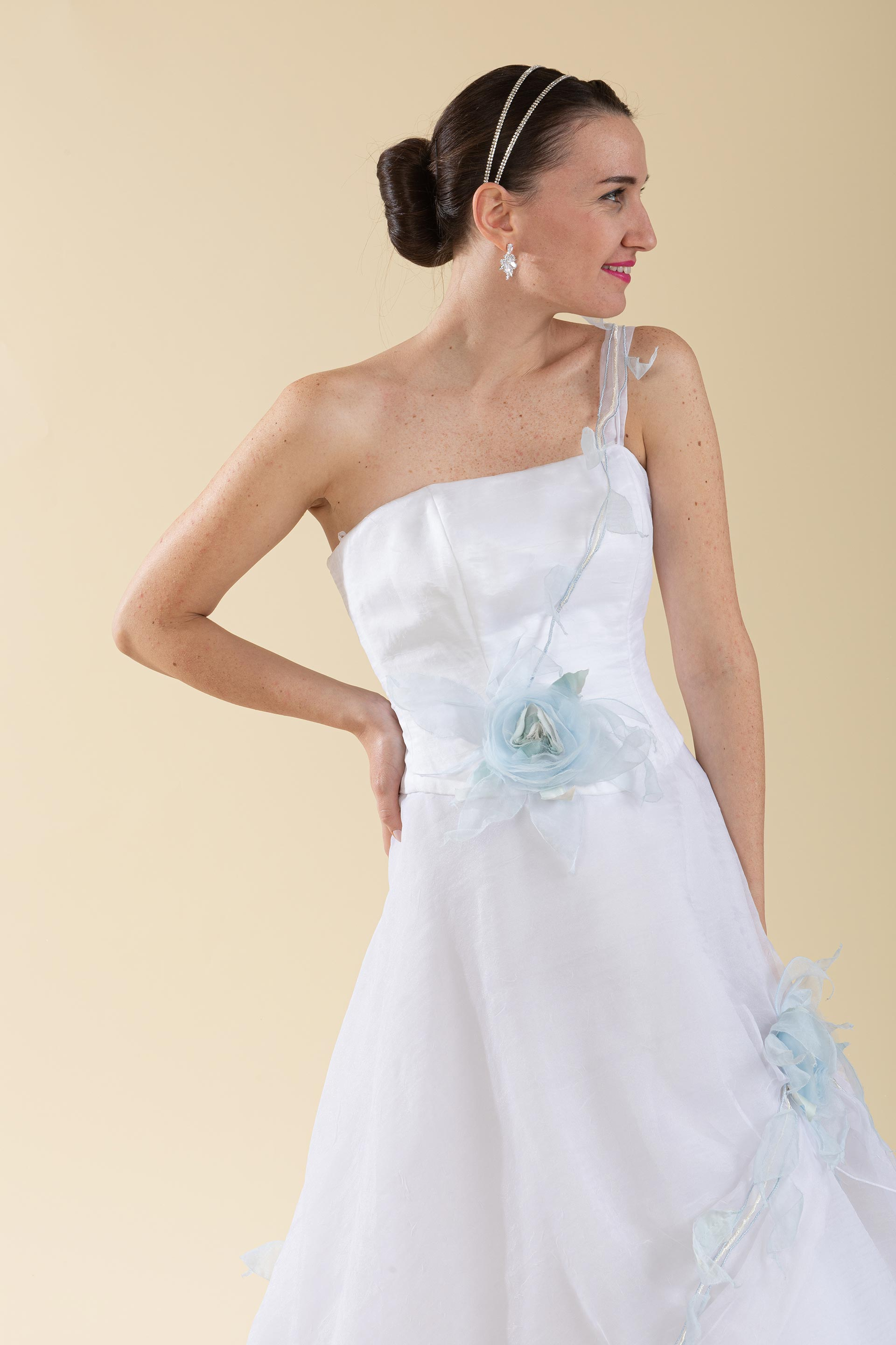 Abito sposa dalla linea ampia realizzato in organza con spallina sottile e fiori azzurri applicati.
