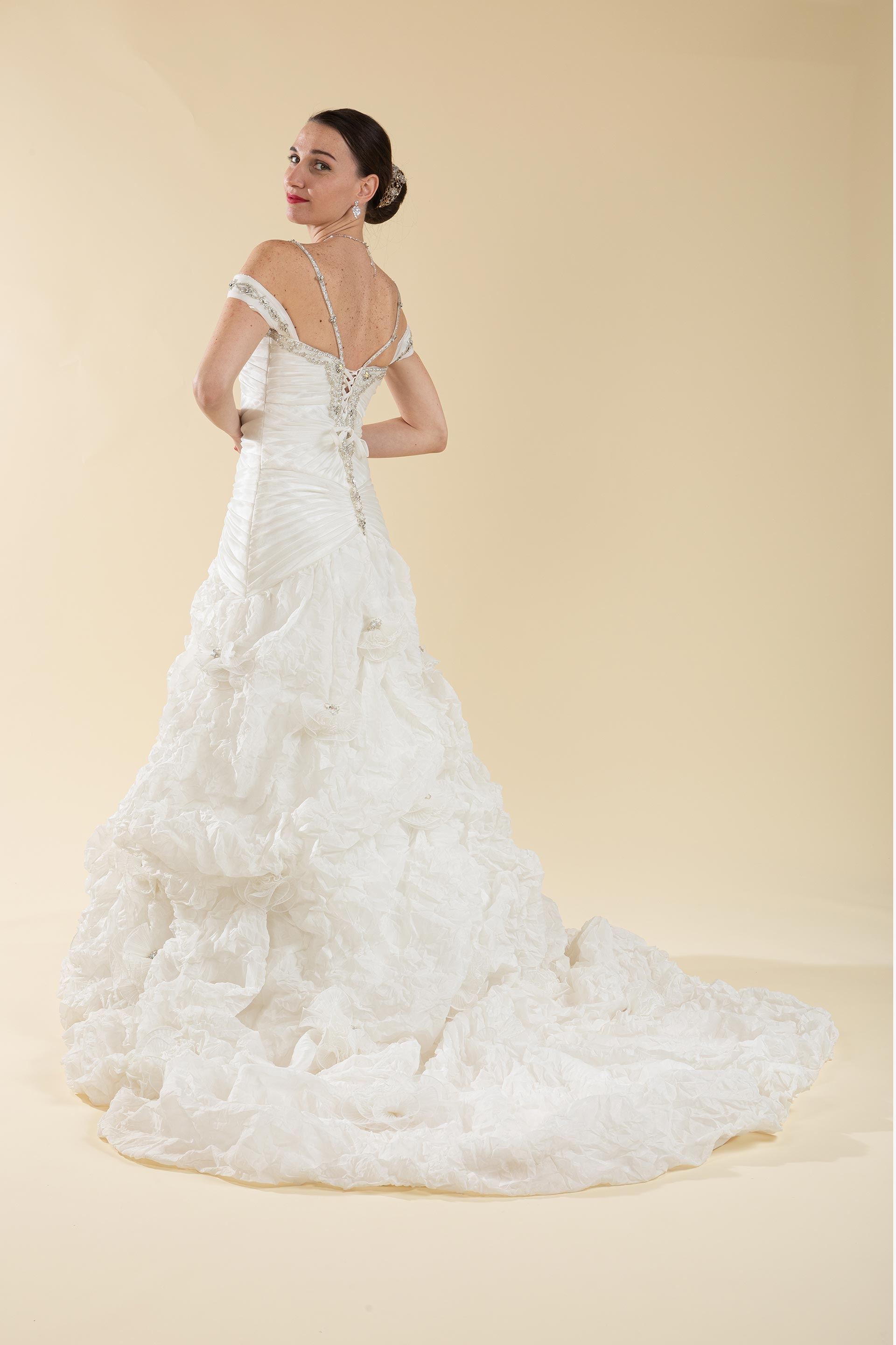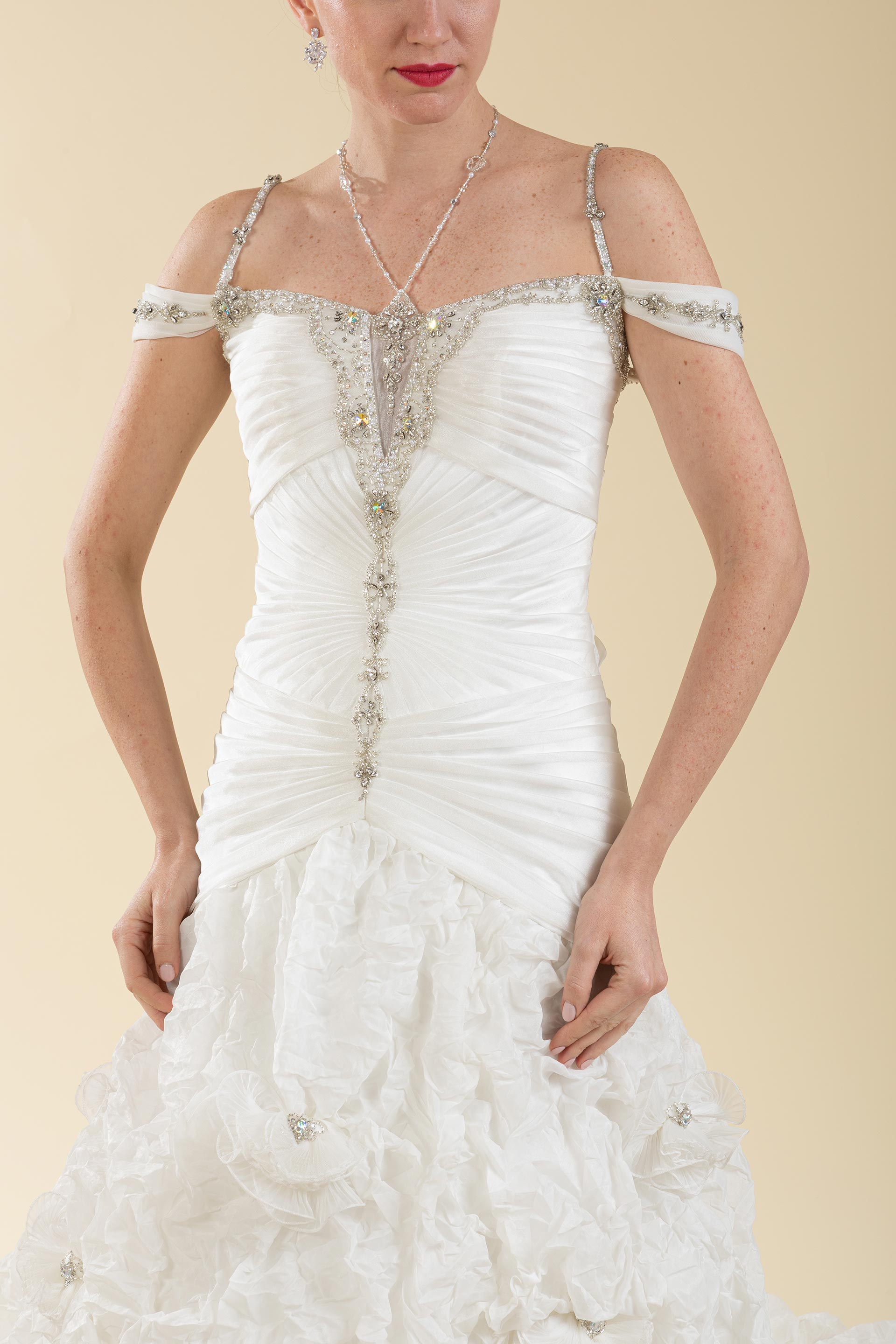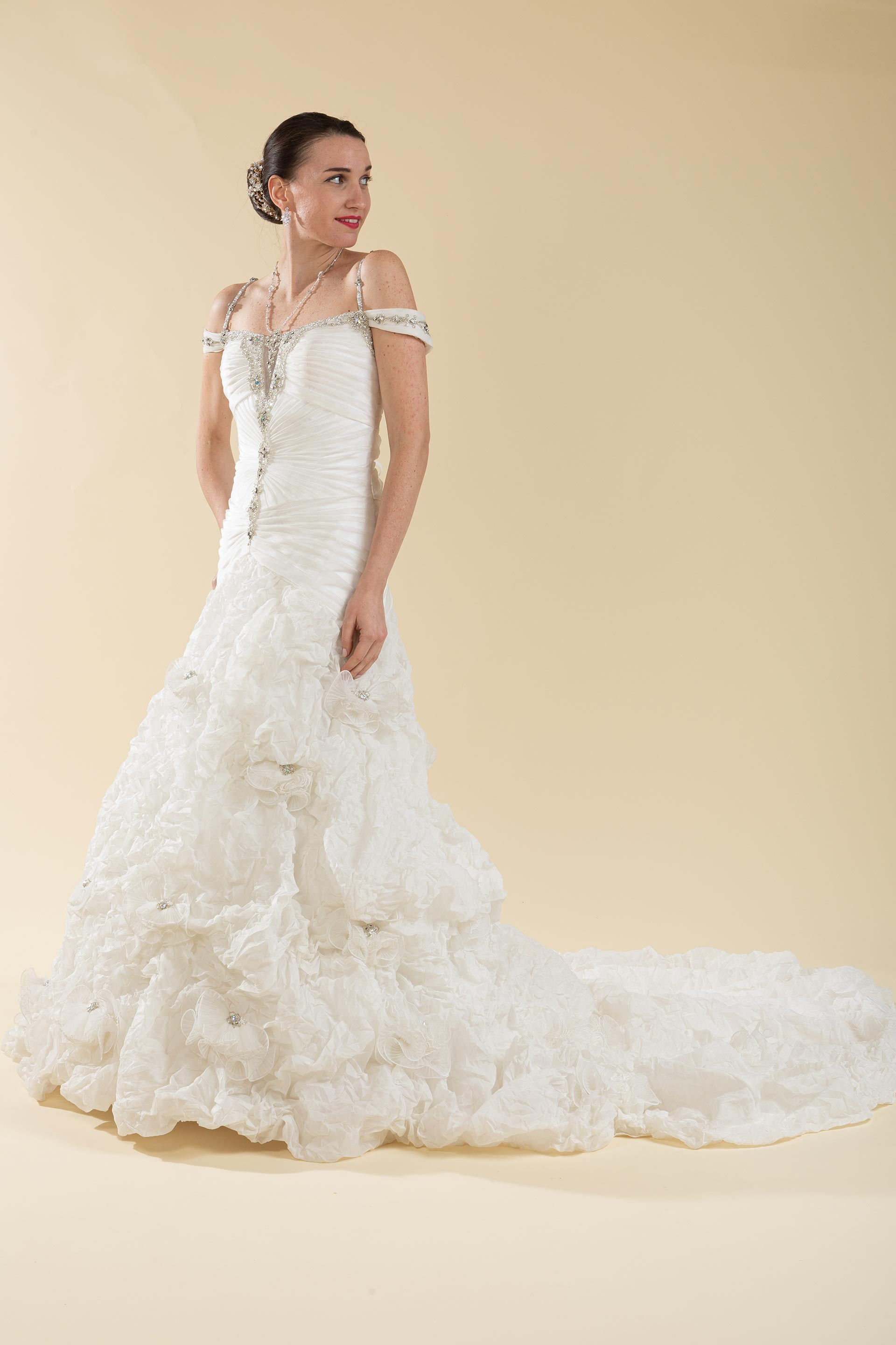 Abito sposa con siluette drappeggiata ad esaltare la sinuosità del corpo realizzata in organza con applicazioni perle e strass e gonna realizzata in tessuto di organza effetto stropicciato e applicazioni di perle.