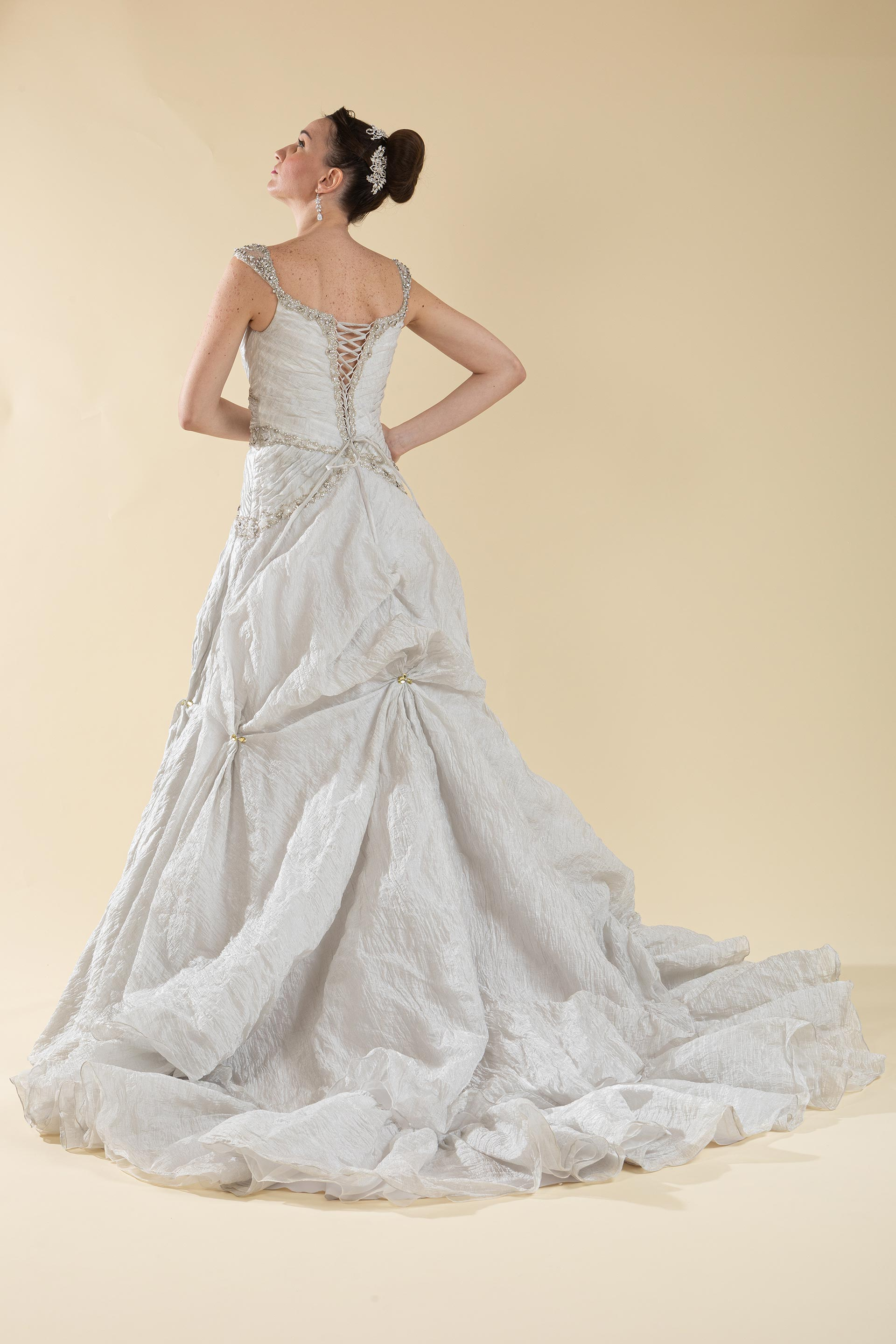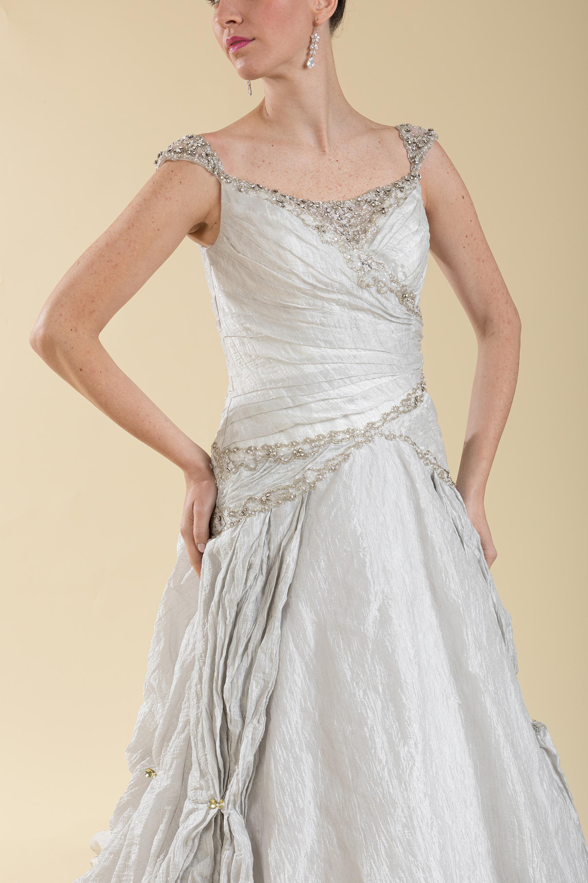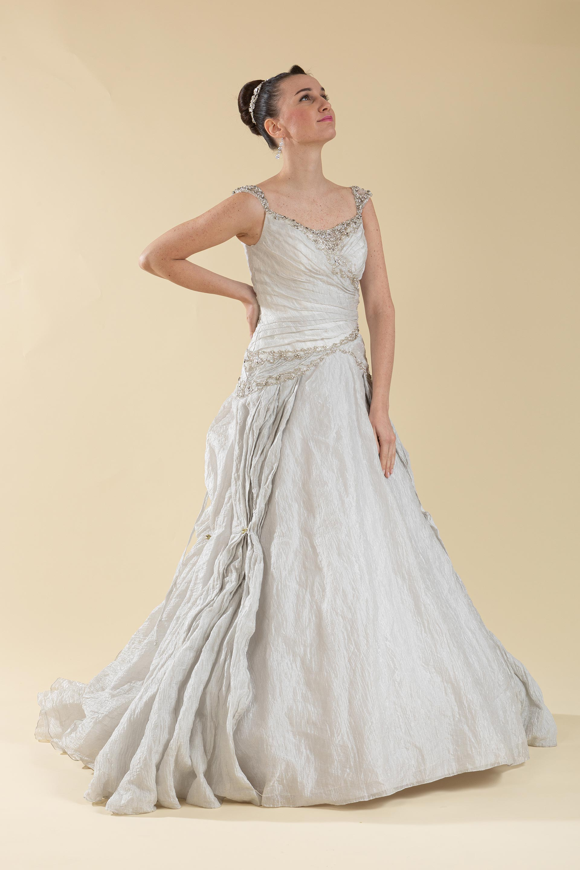 Abito sposa con corpetto drappeggiato ad esaltare la sinuosità del corpo realizzata in organza con ricami di perle e strass argento e gonna realizzata in tessuto di organza effetto stropicciato laminato e applicazioni di strass.