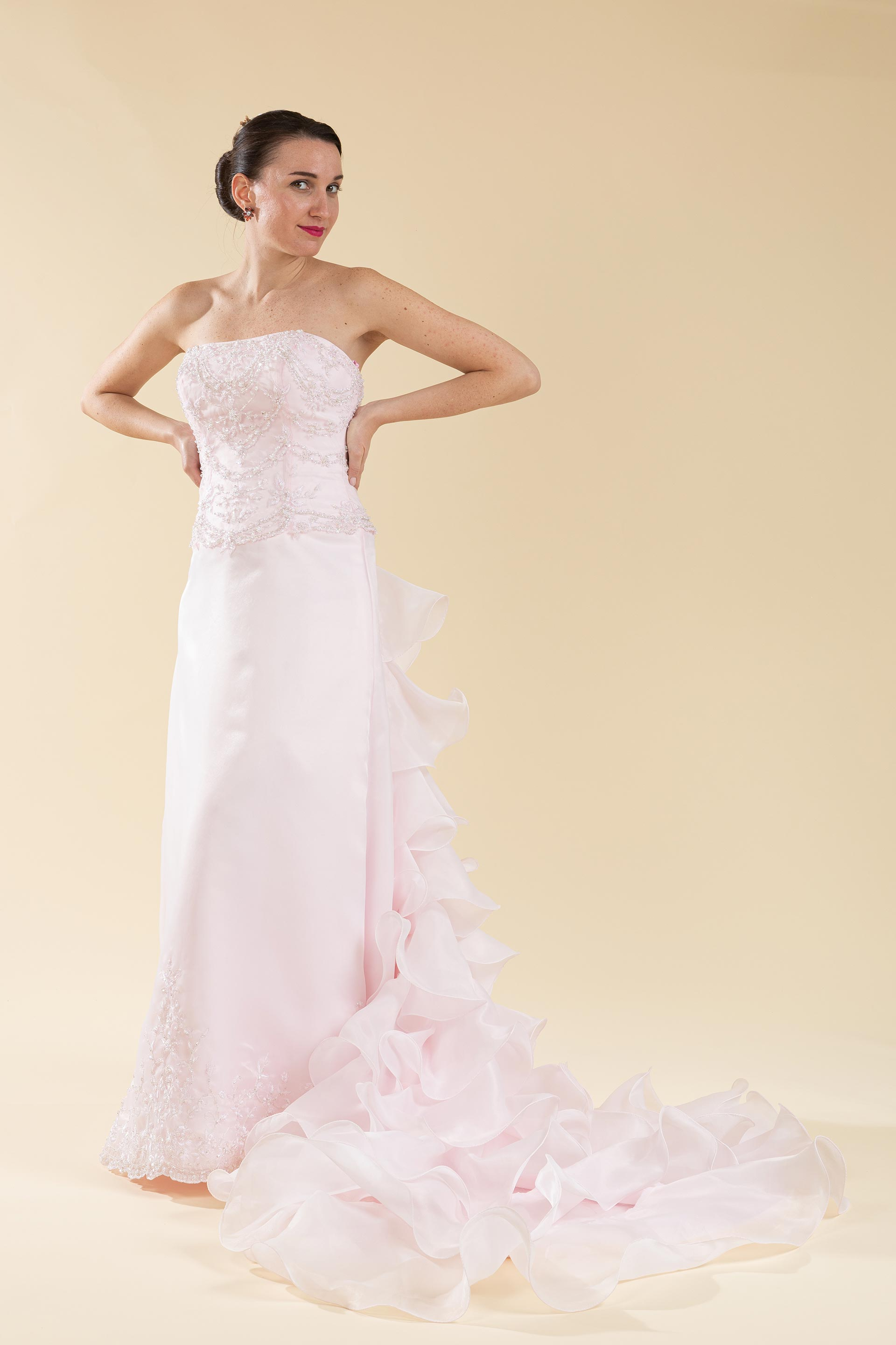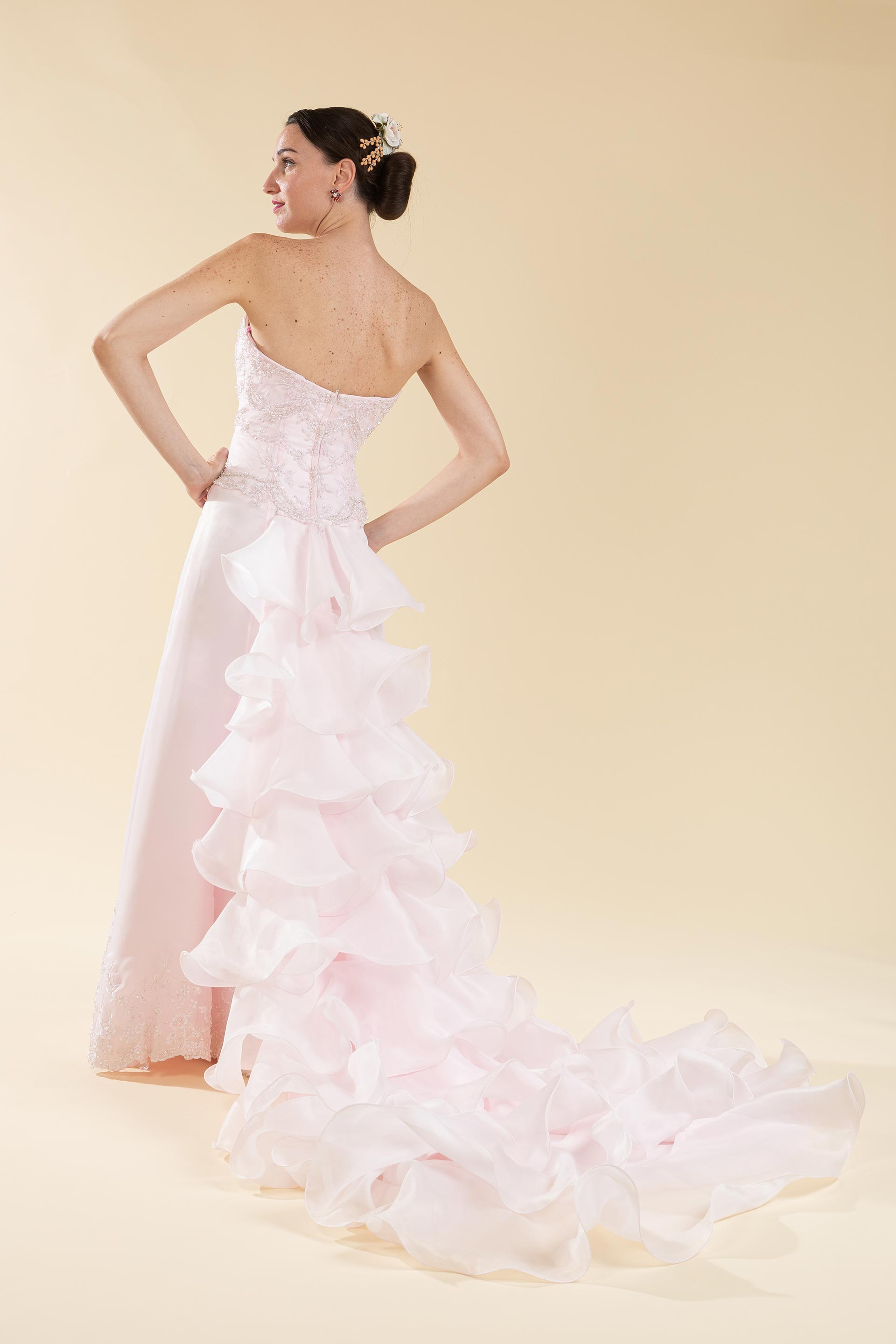 Abito sposa color rosa con coda a balze