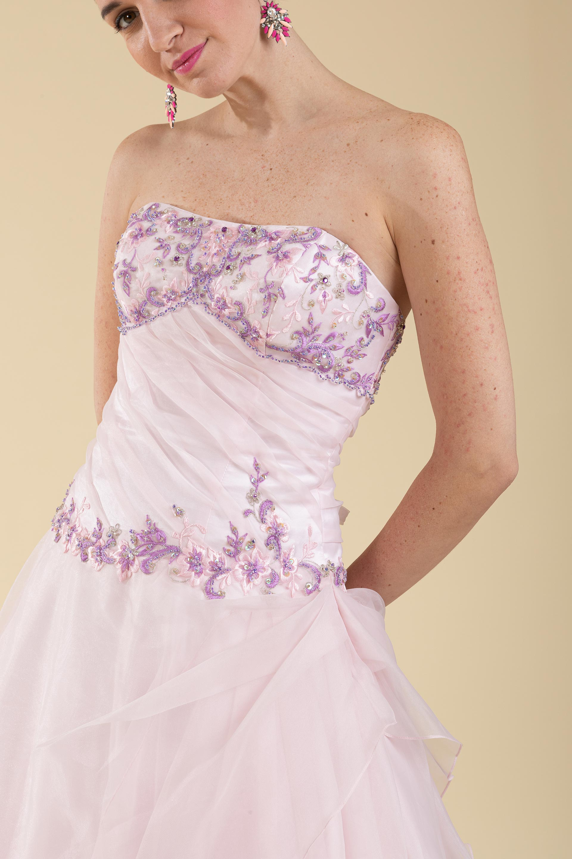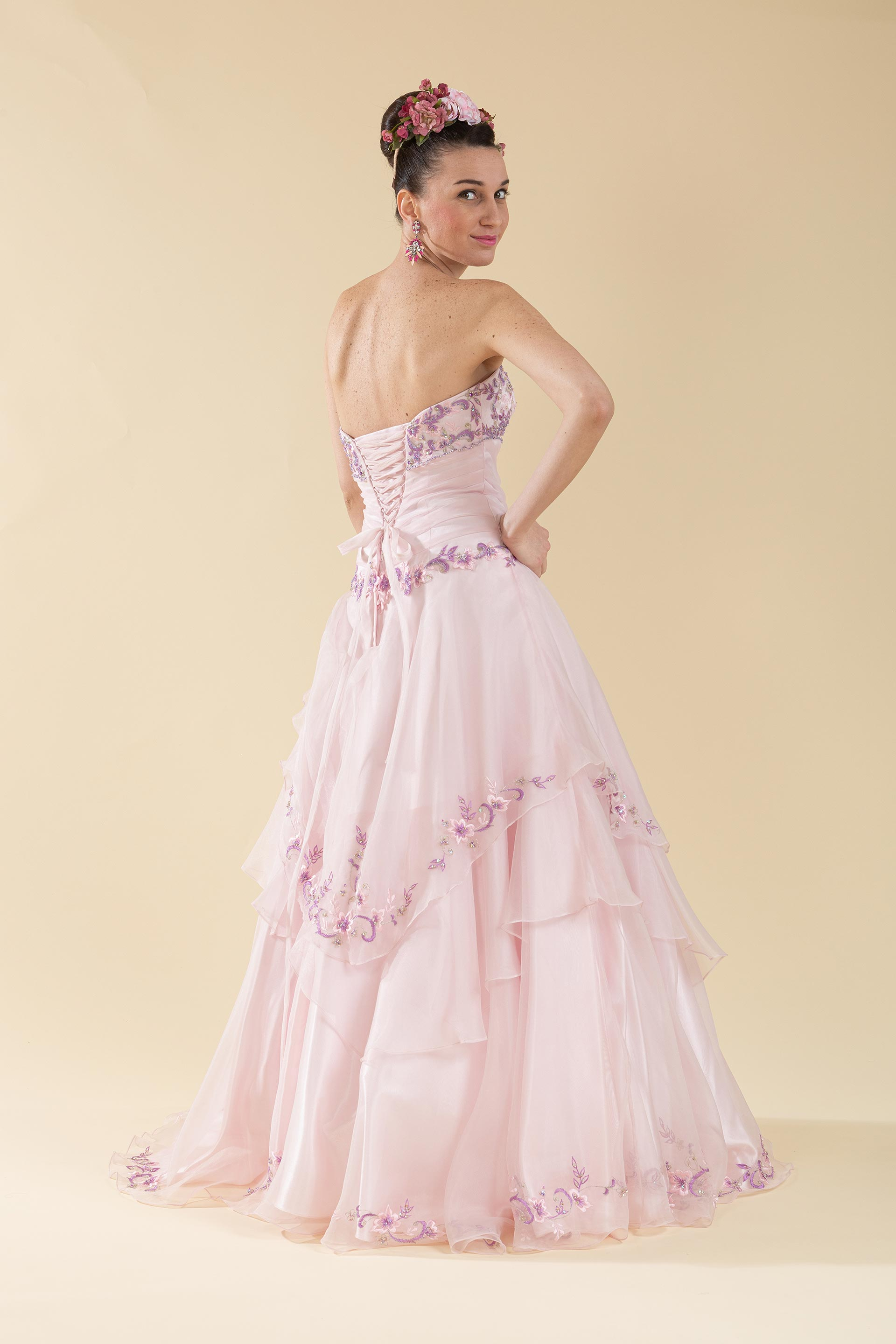 Abito sposa rosa con corpetto drappeggiato, gonna ampia a balze decorato con ricami rosa e lilla.