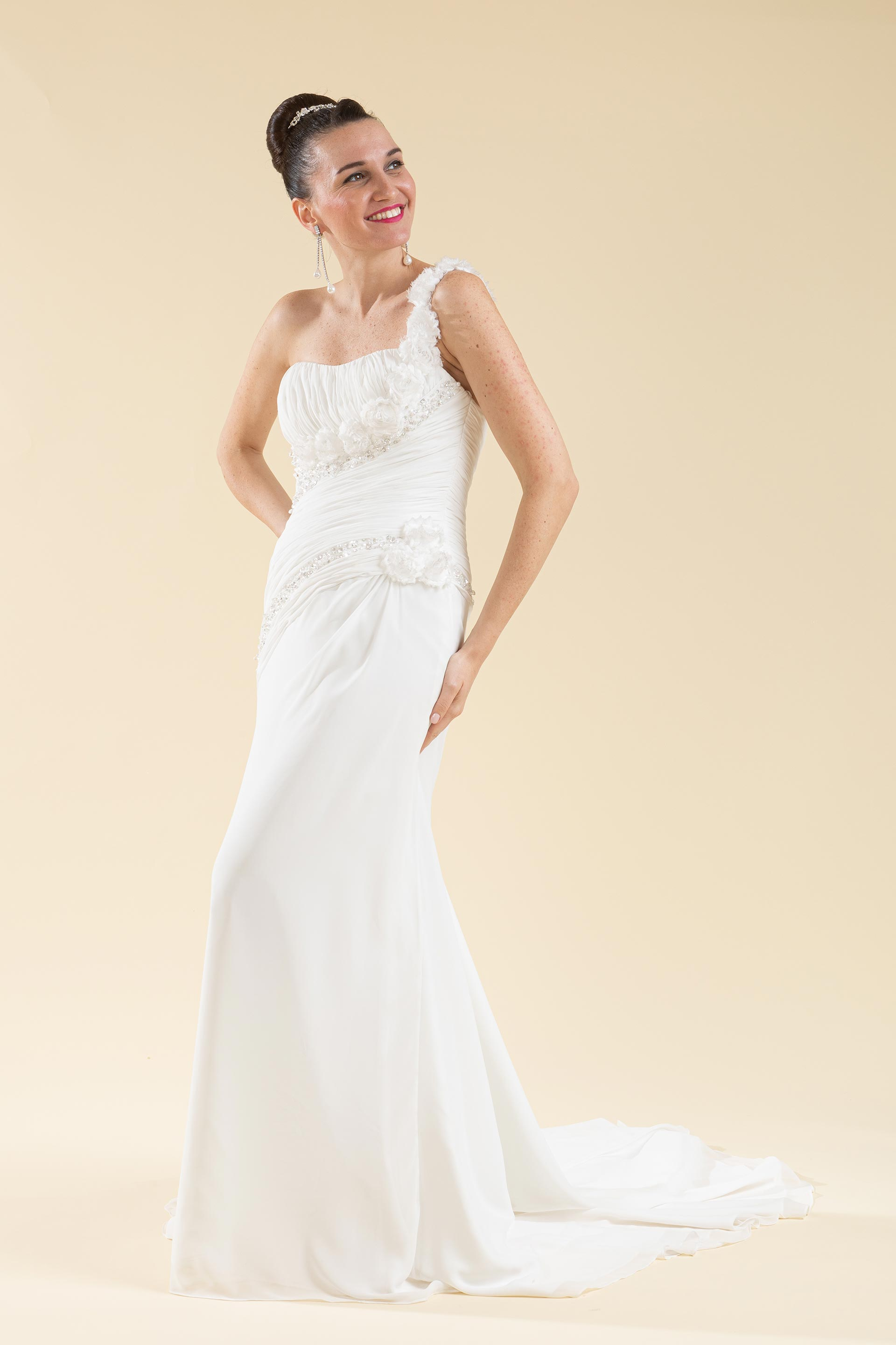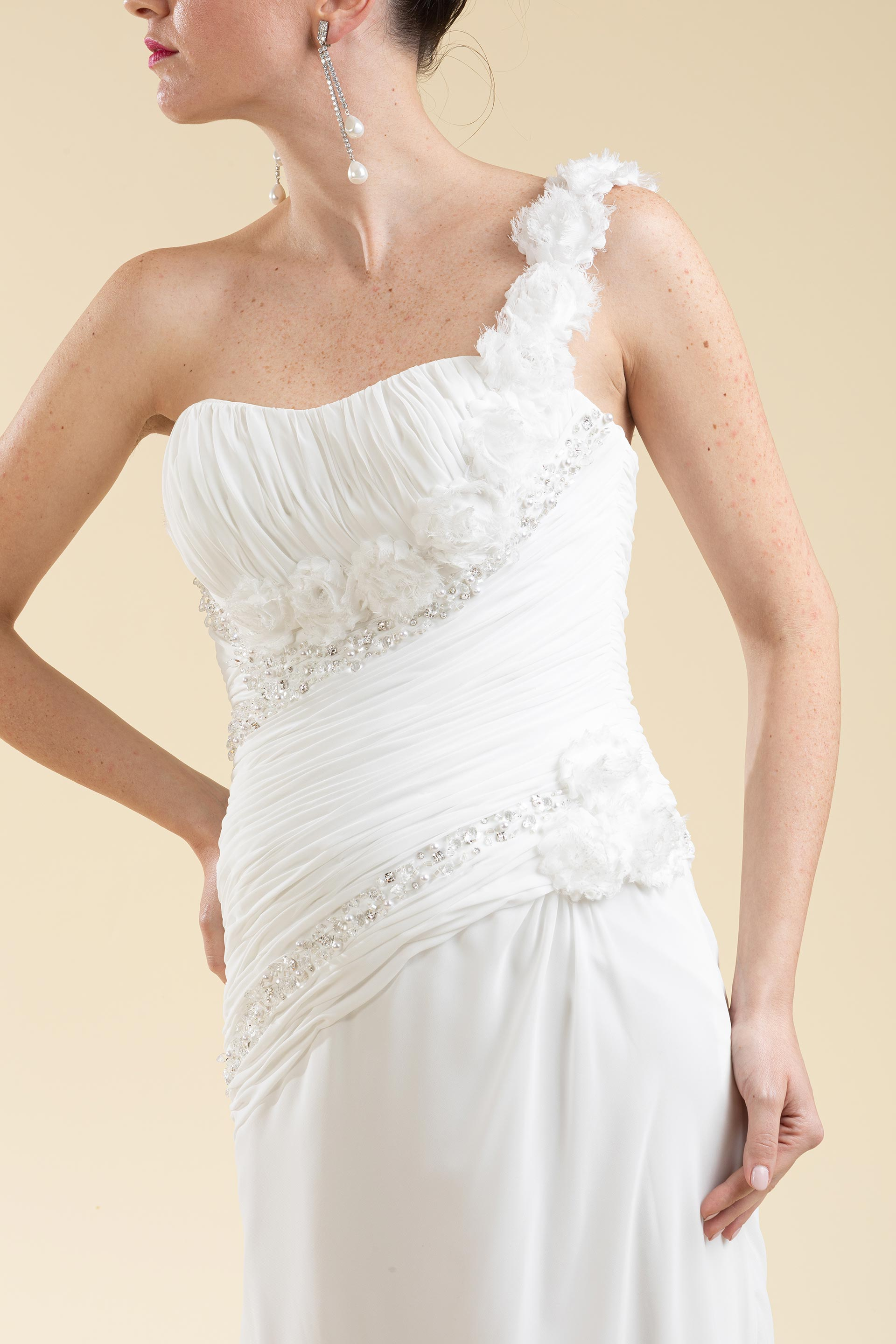 Abito sposa scivolato mono spalla con corpetto drappeggiato e ricamato con cristalli, strass e perline, ad impreziosire la spallina una cascata di fiori ad orlo vivo.