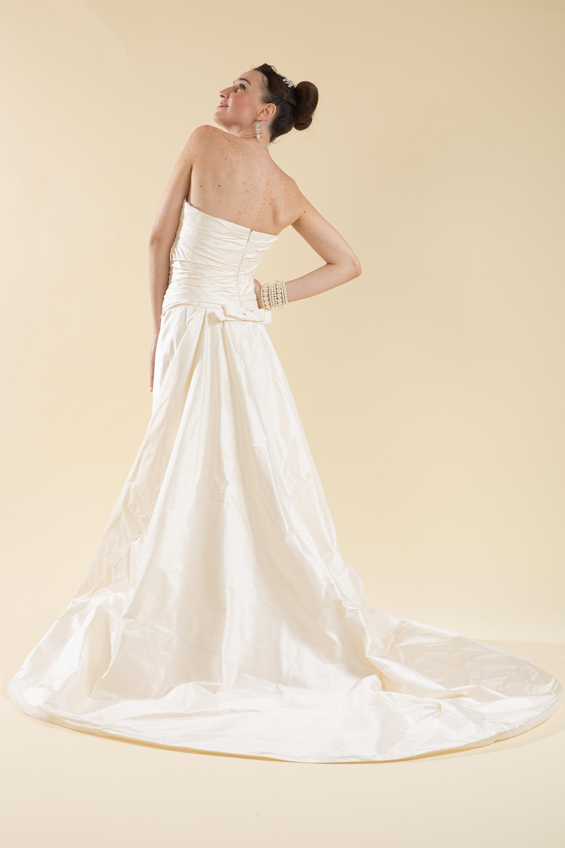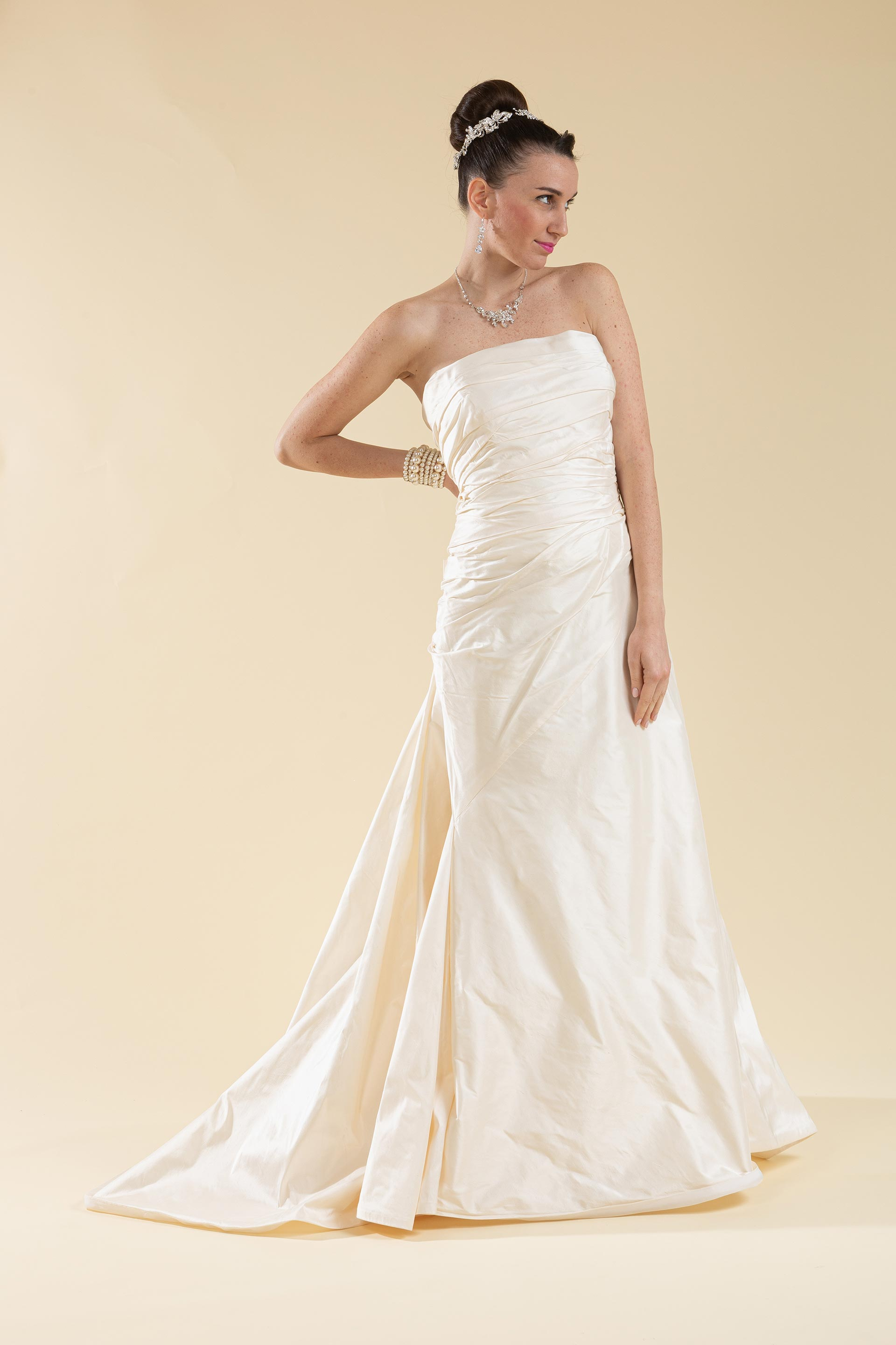 Abito sposa décolleté drappeggiato realizzato in tessuto di taffetà di seta.