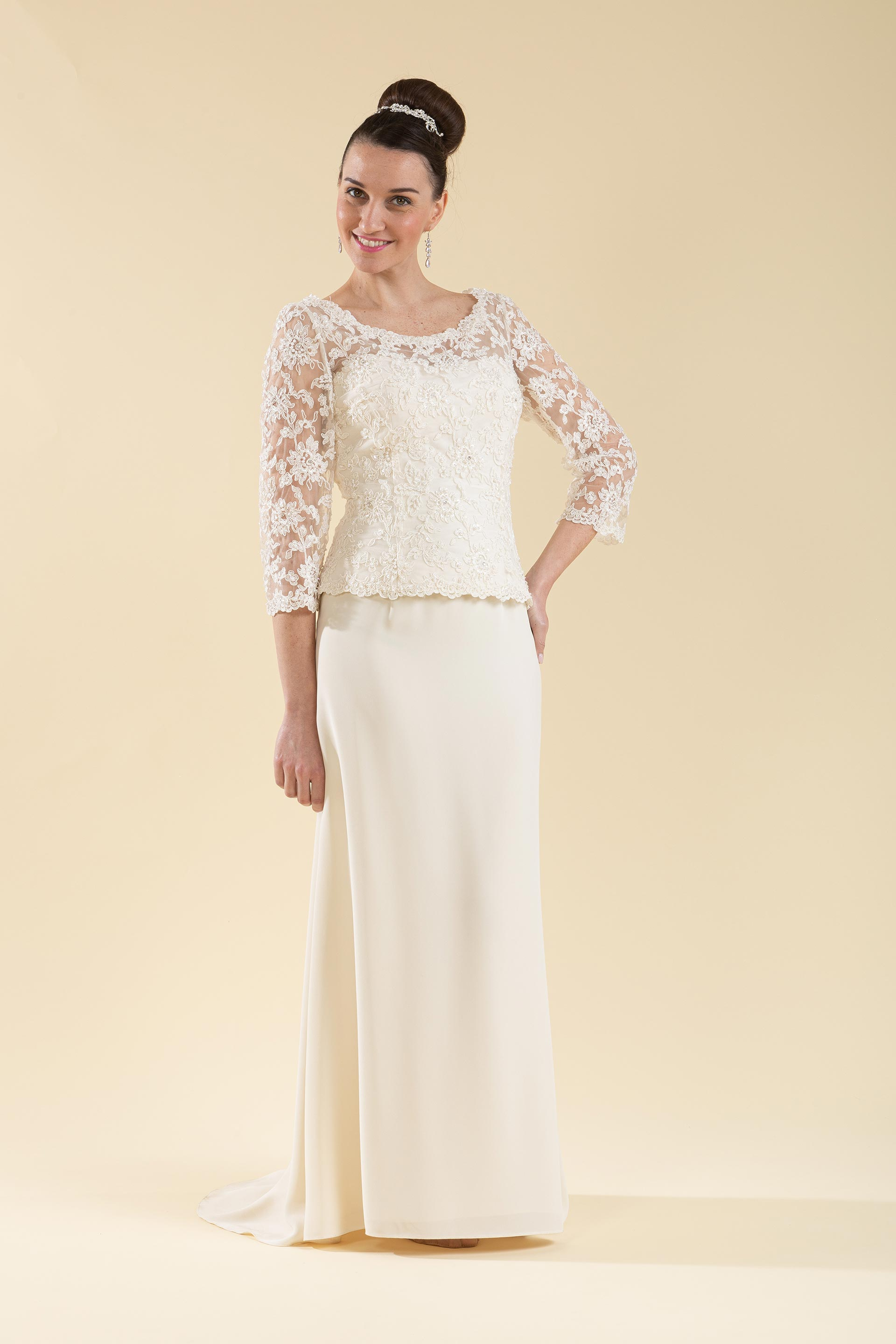 Abito sposa svasato realizzato in tessuto di cady con corpetto a manica lunga in pizzo ricamato.