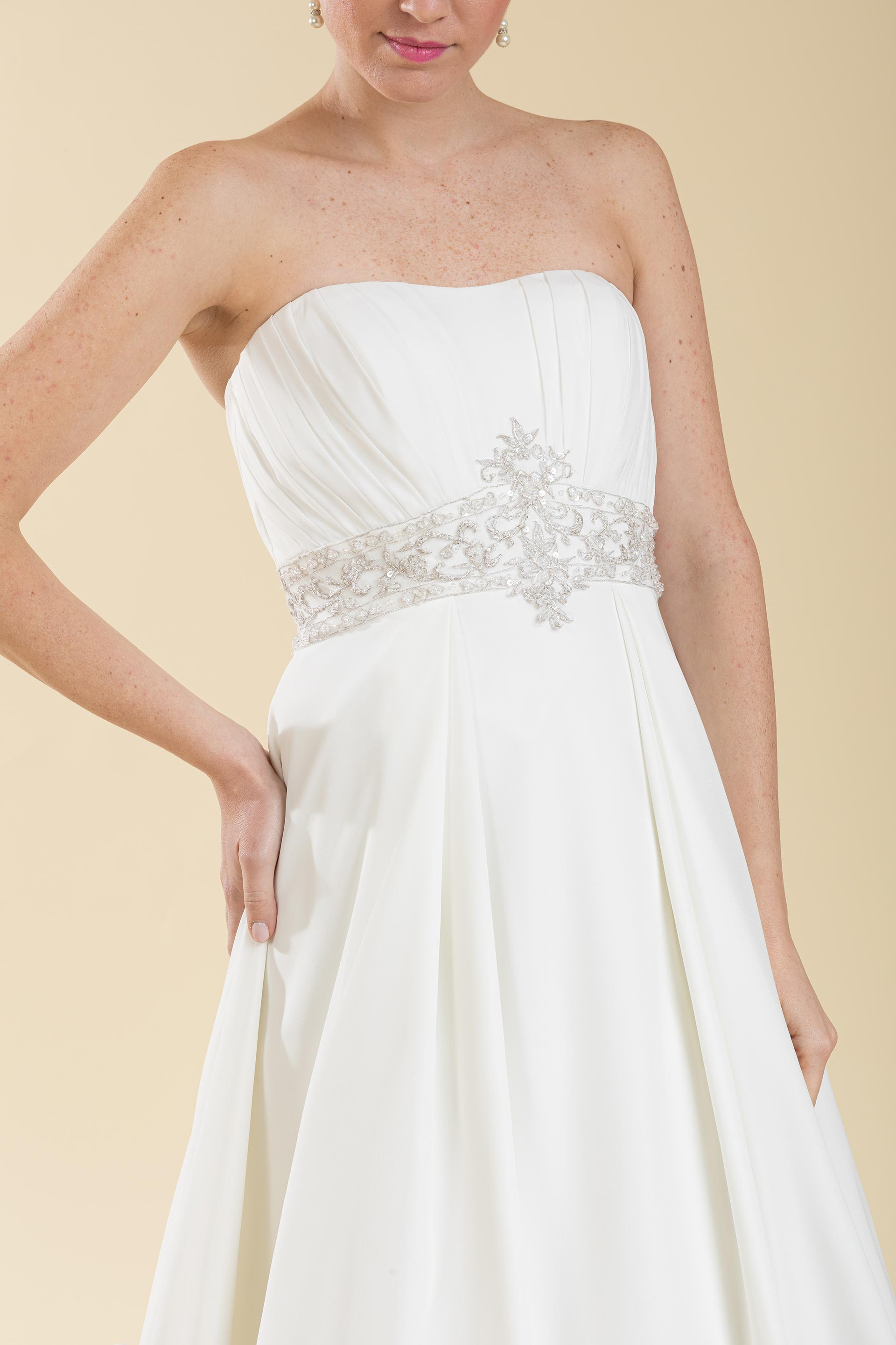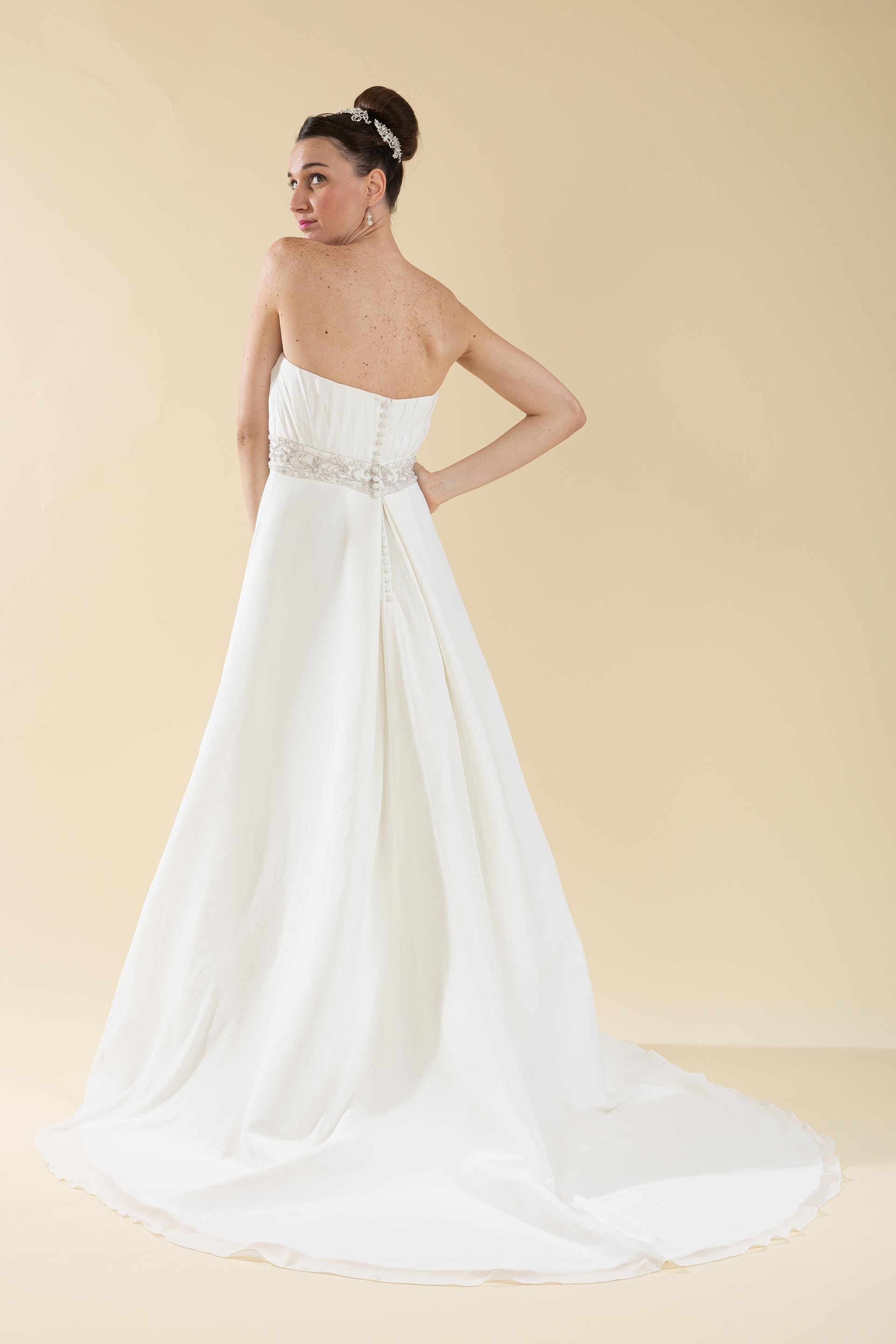 Abito sposa svasato a décolleté con drappeggio sul seno impreziosito da applicazione di pizzo argento ricamata.
