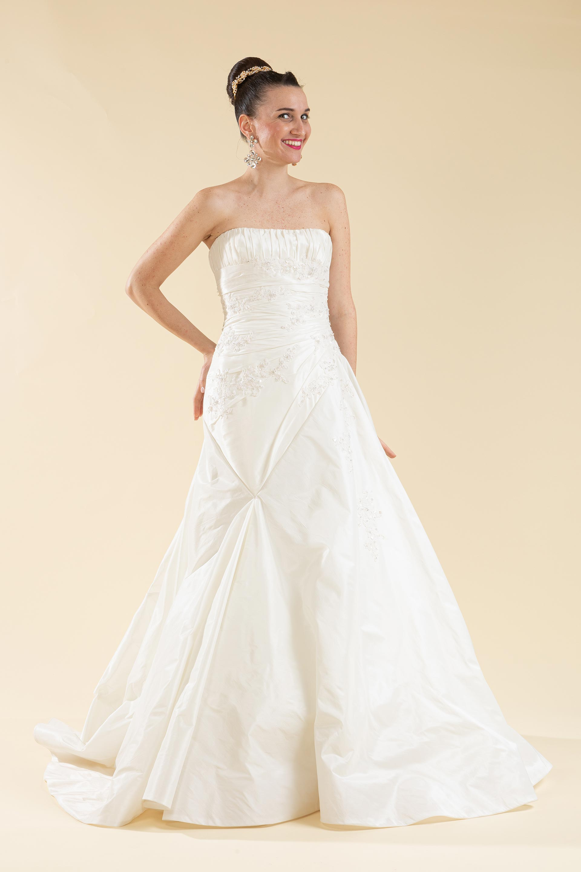 Abito sposa décolleté drappeggiato realizzato in tessuto di Shantung di seta impreziosito da applicazioni in pizzo ricamate.