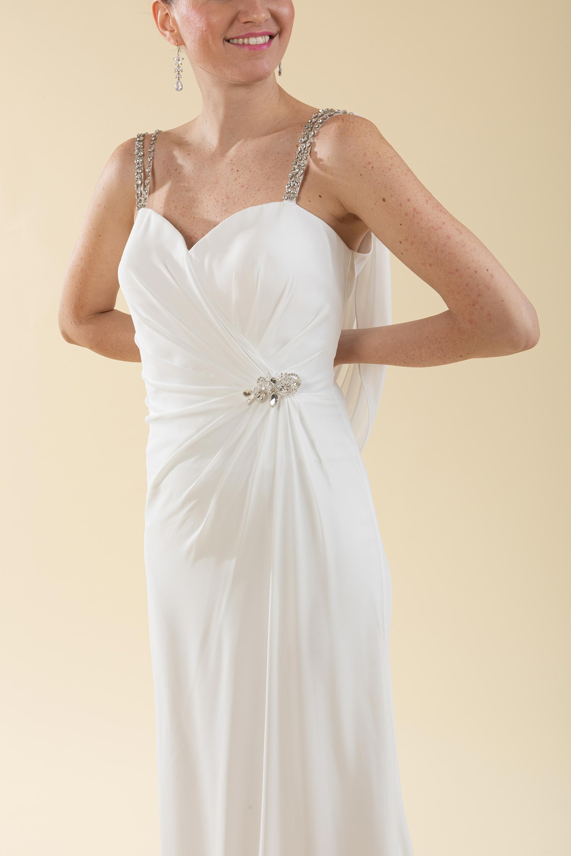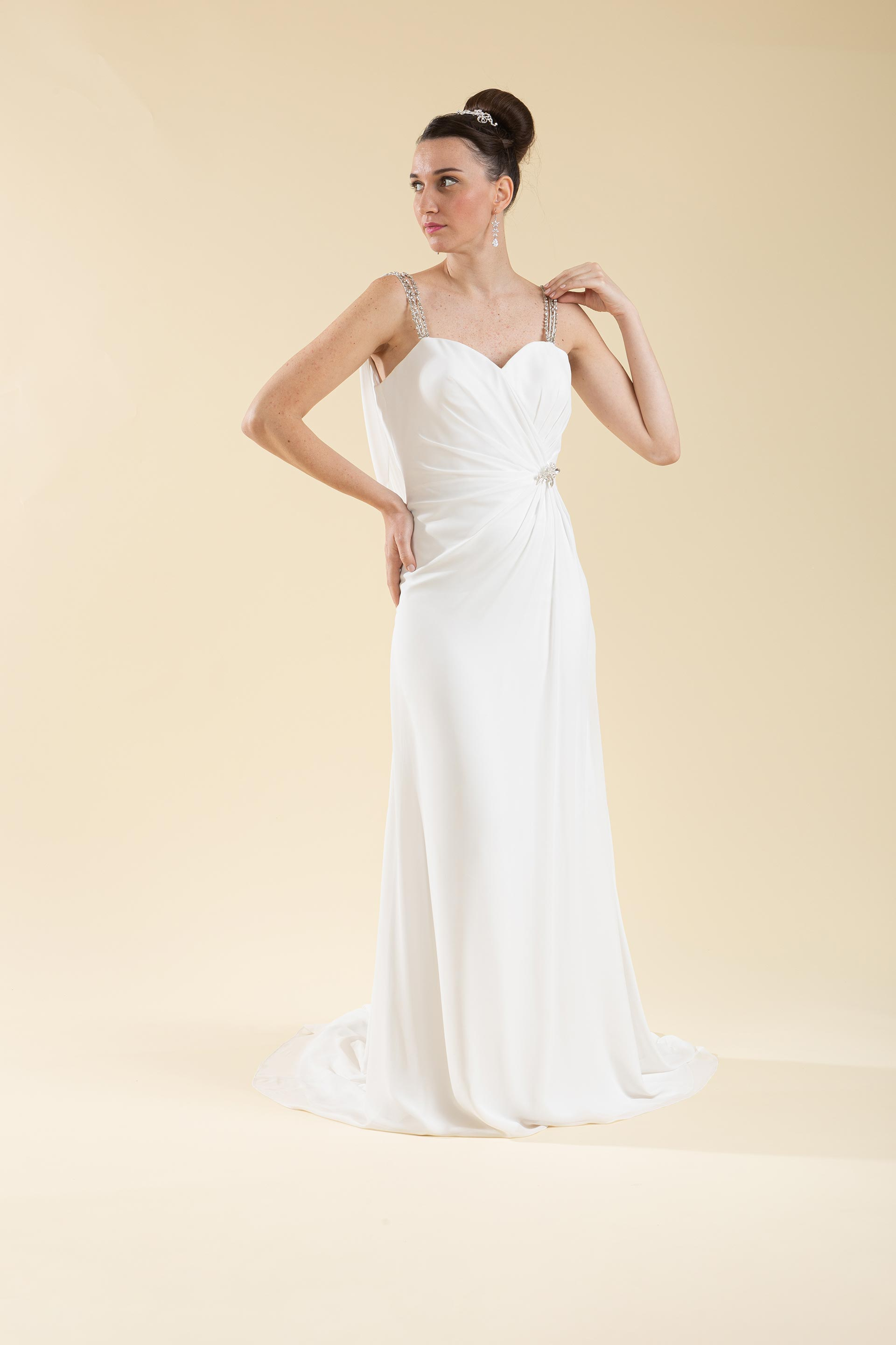Abito sposa scivolato con scollatura a cuore, spalline di strass e drappeggio a raggio realizzato in tessuto di voile.