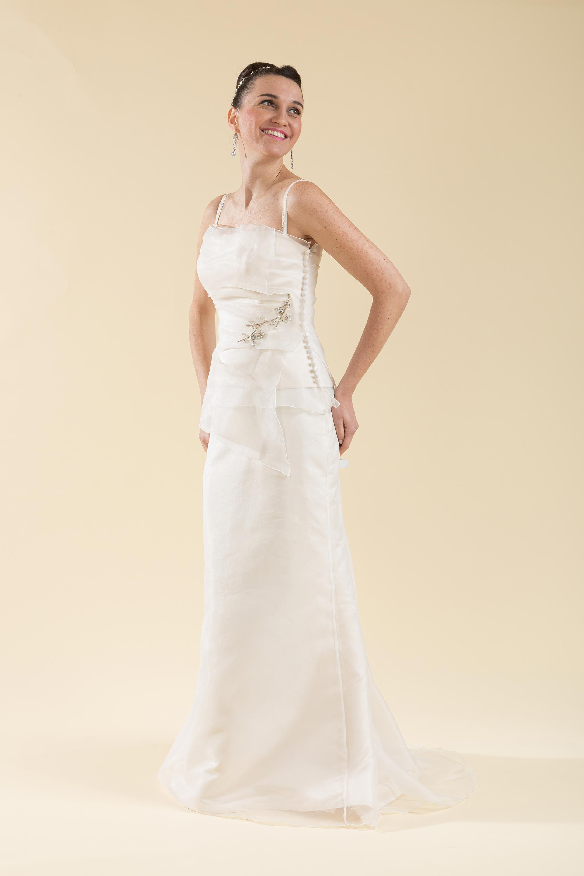 Abito sposa drappeggiato in tessuto di organza don dettagli di ricamo in strass argento.