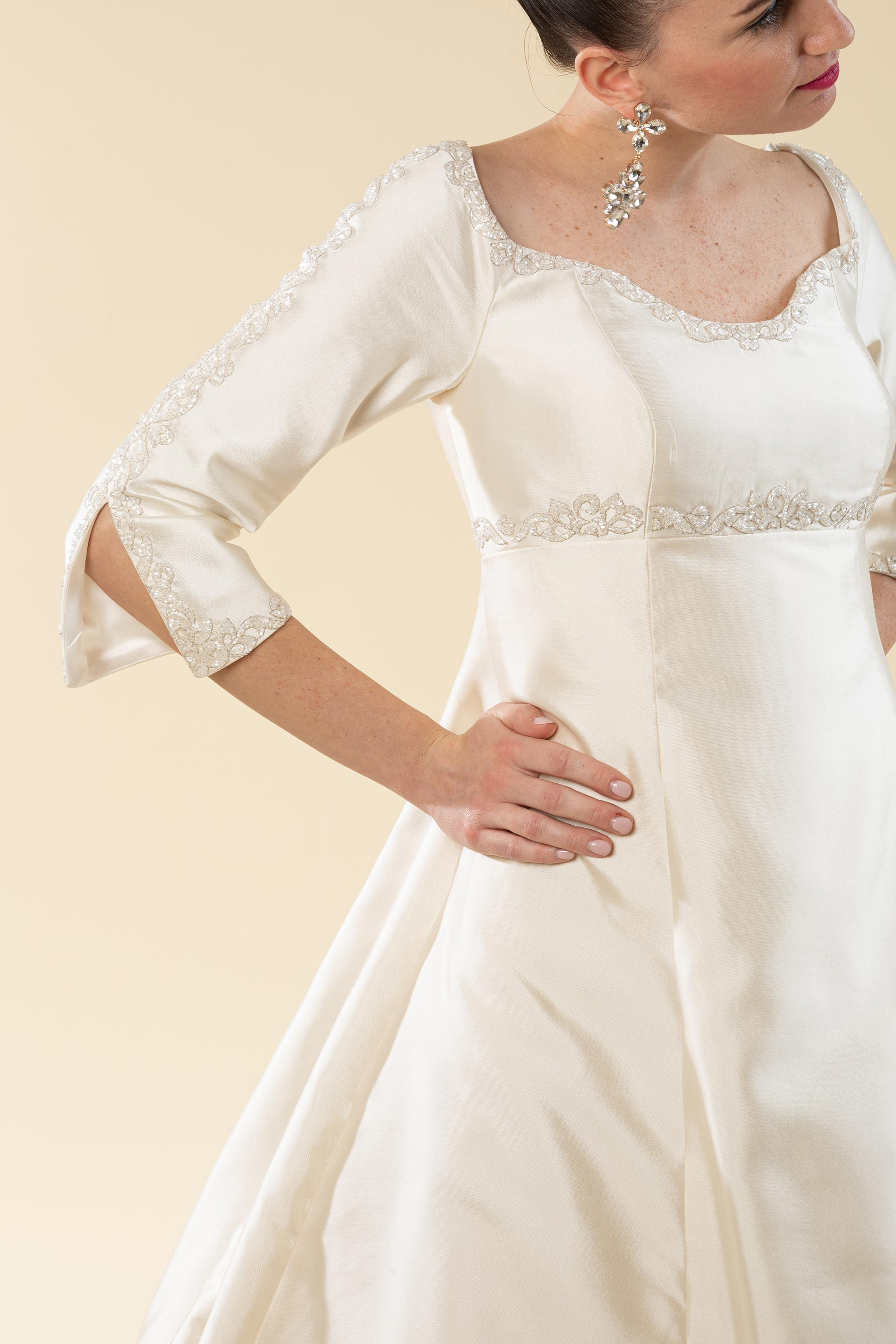 Abito sposa realizzato in tessuto di mikado con manica 3/4 impreziosito da ricami realizzati con micro perline luminosissime.