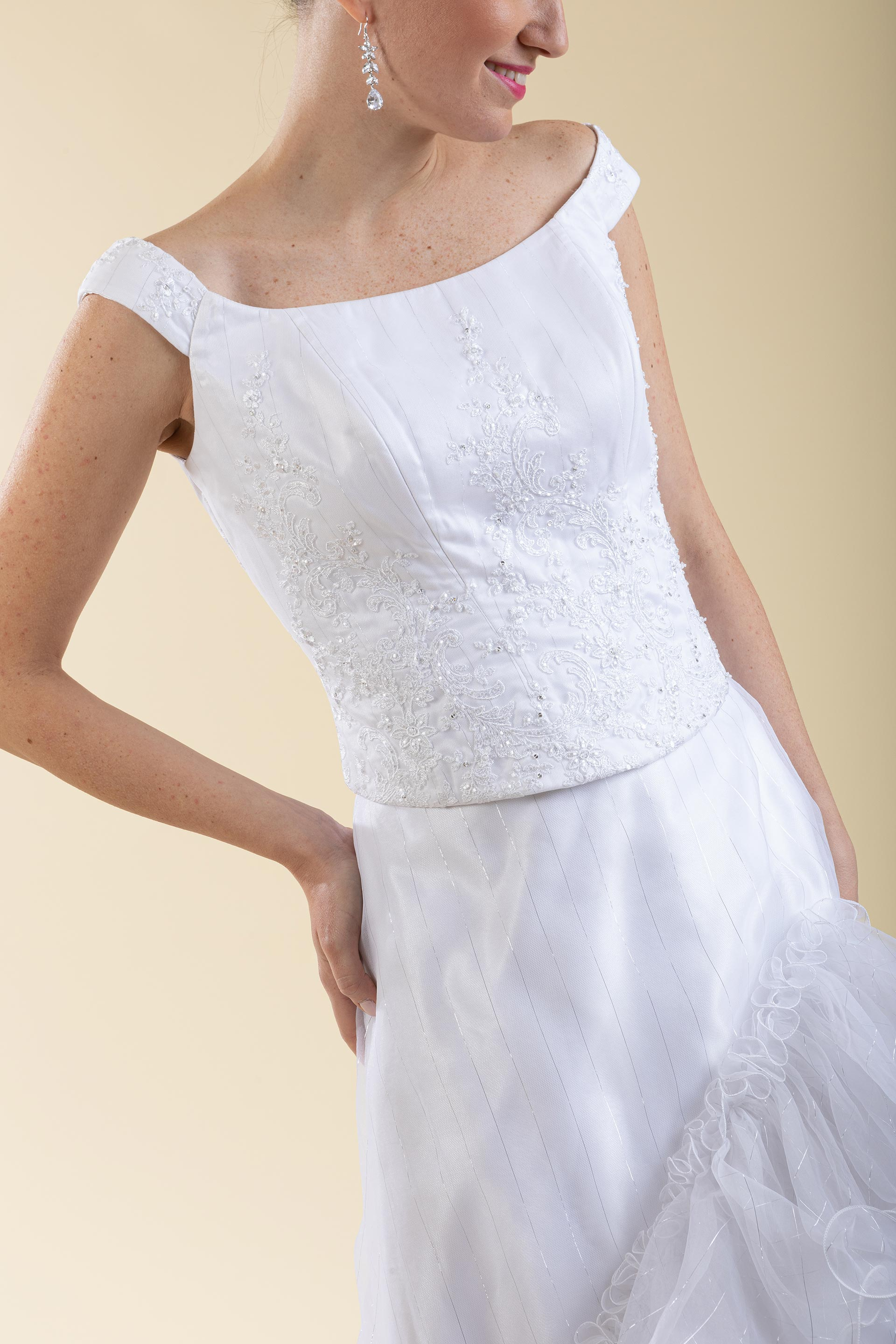Abito sposa 2Pz. composto da bustino in pizzo con scollo omerale e gonna ampia in organza bianca rigata argento con rouge realizzata corta davanti e lunga dietro.