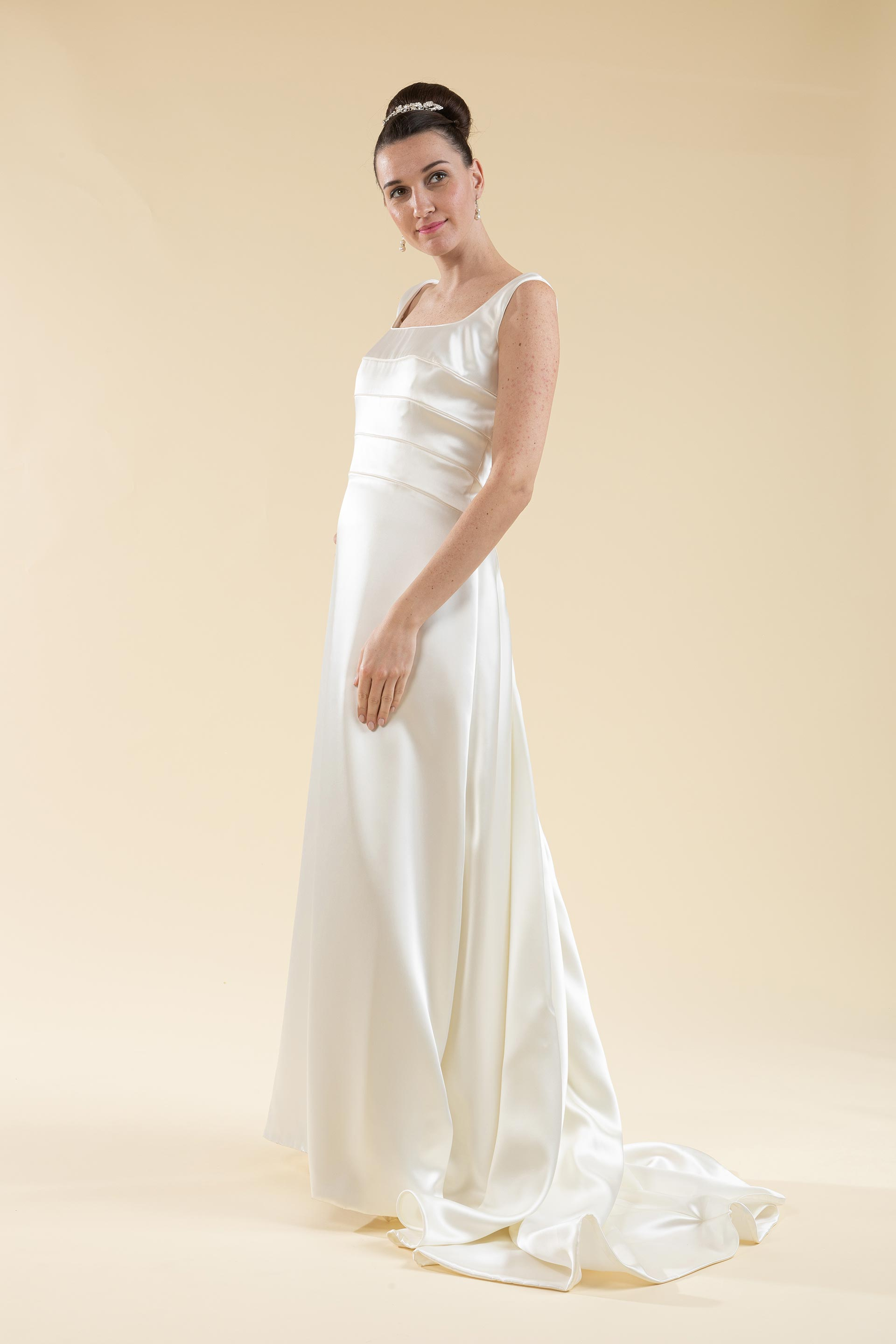 Abito sposa realizzato in raso di taglio svasato con dettagli in pizzo rebrodè ricamato.