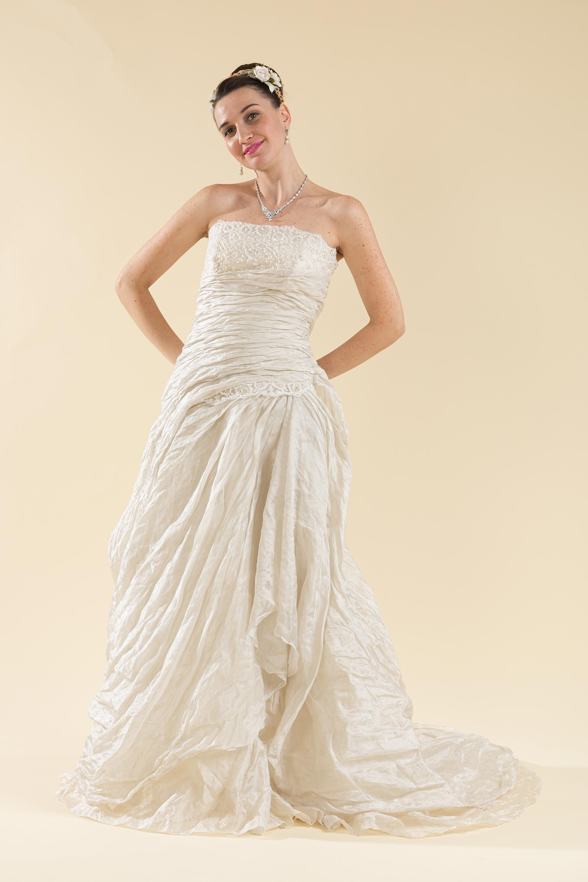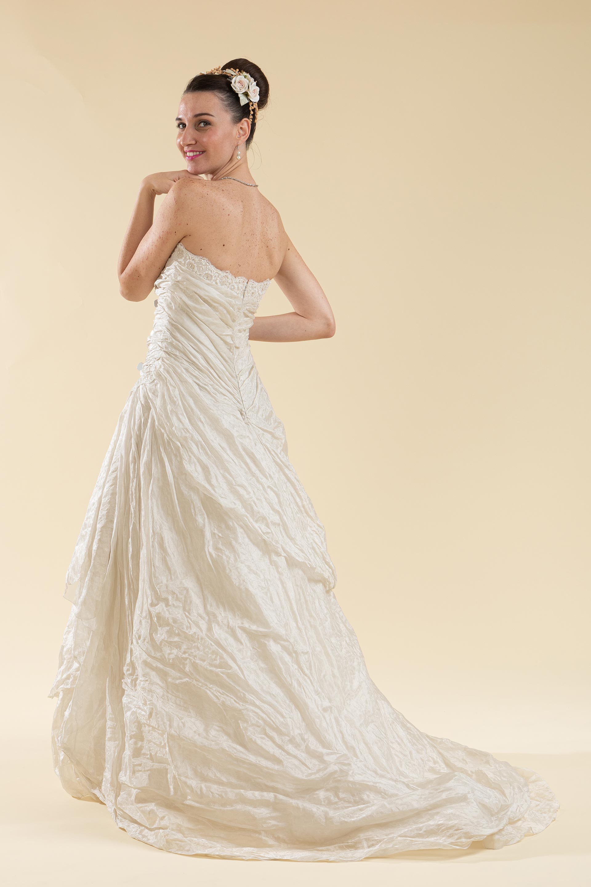 Abito sposa ampio drappeggiato con corpetto in pizzo ricamato e gonna realizzato in tessuto di organza lamè.