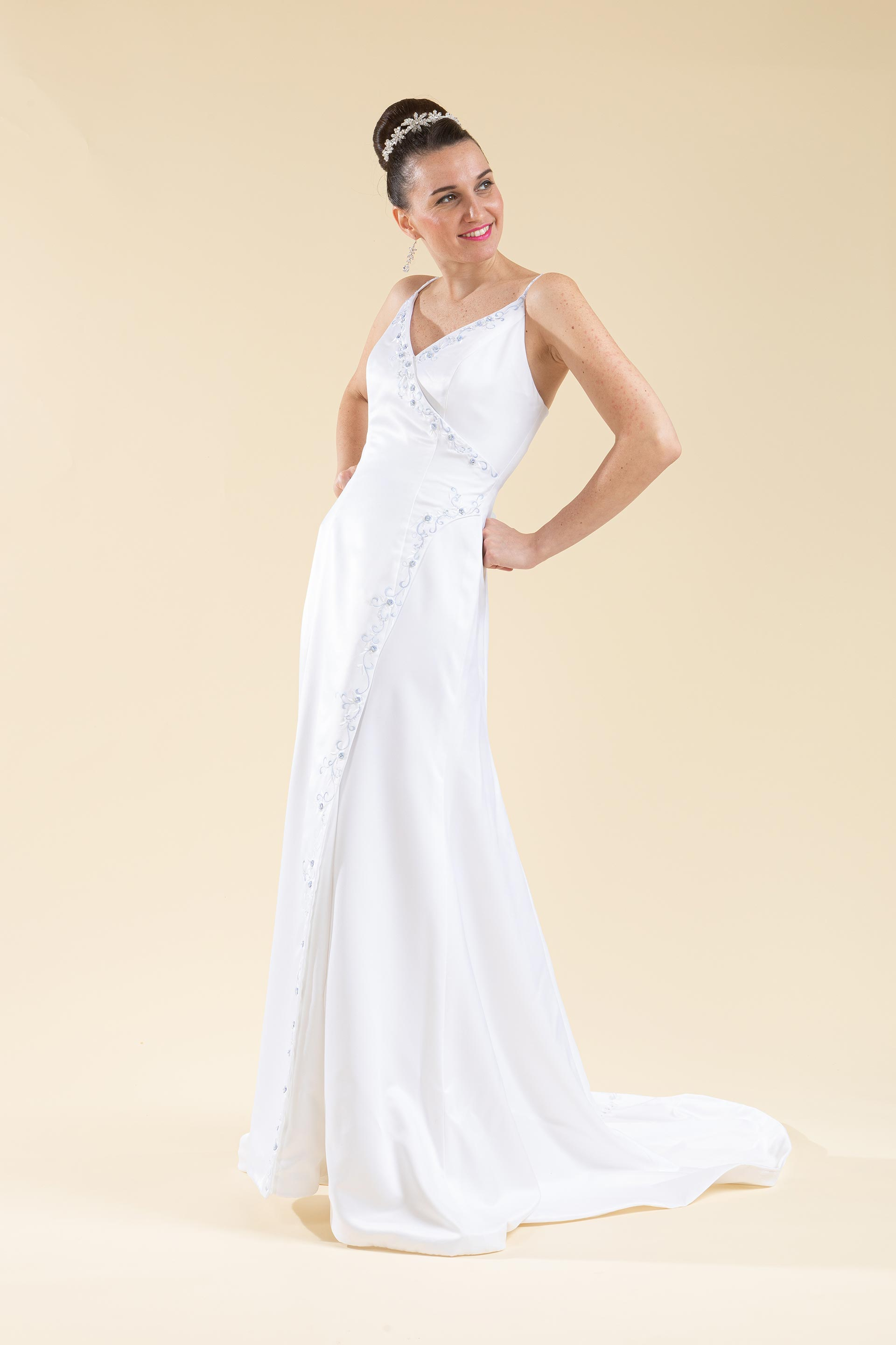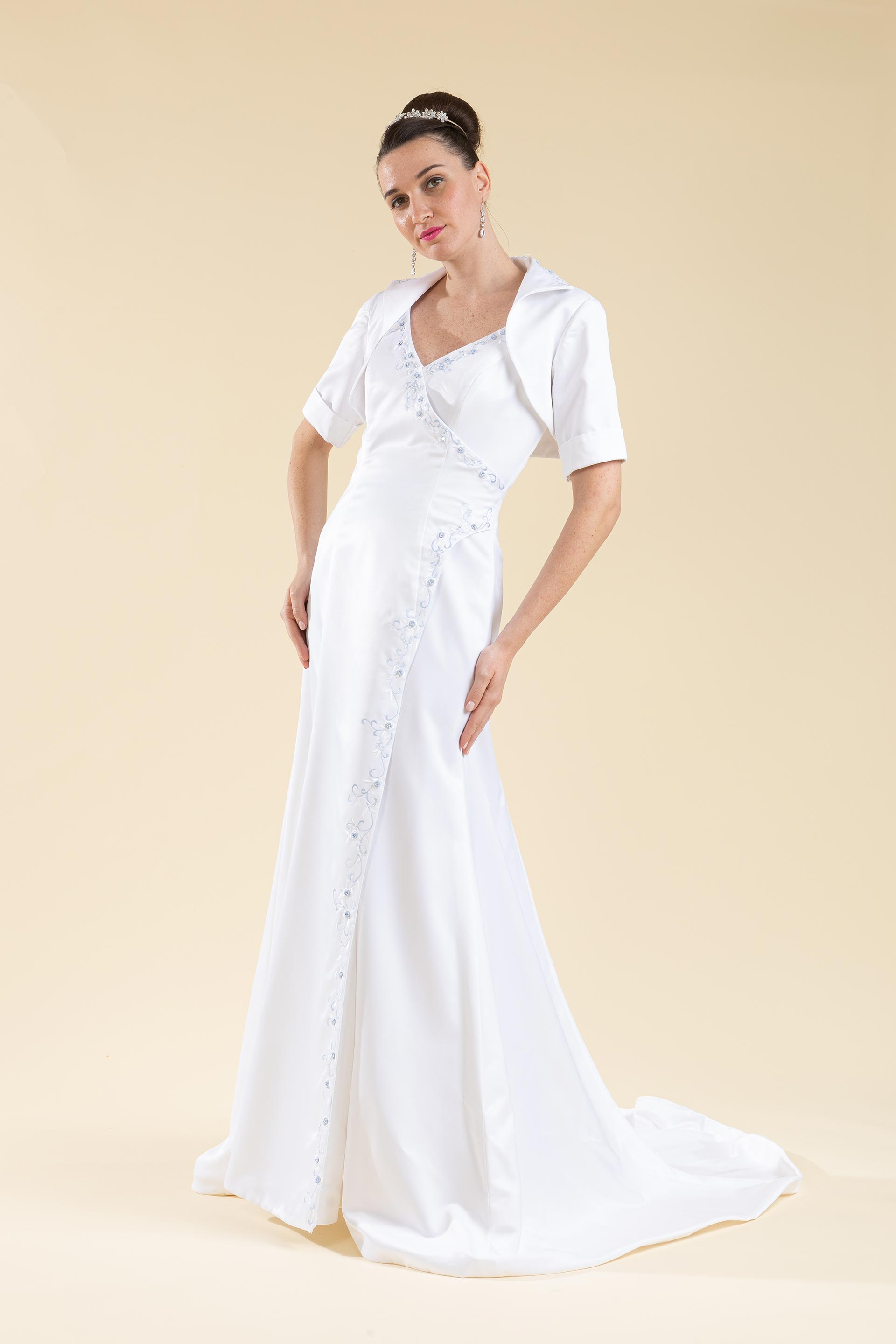 Abito sposa con giacchino abbinato realizzato in tessuto di raso bianco con ricami azzurri.