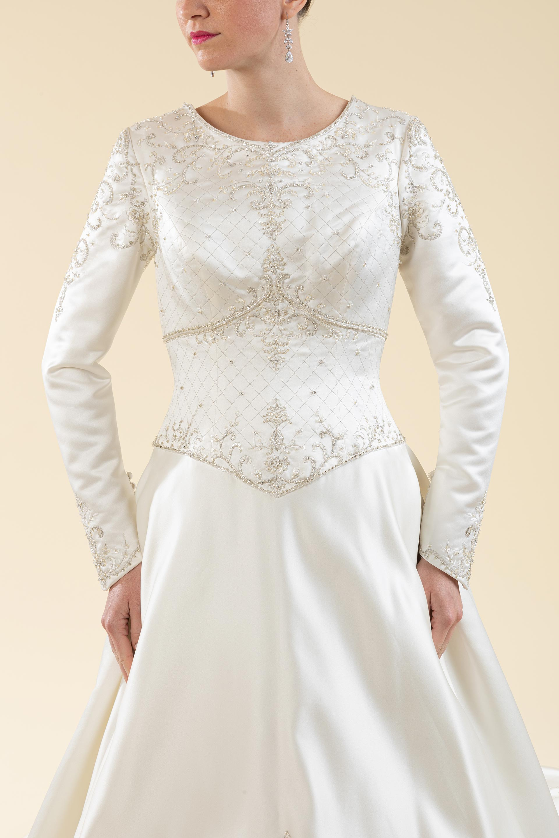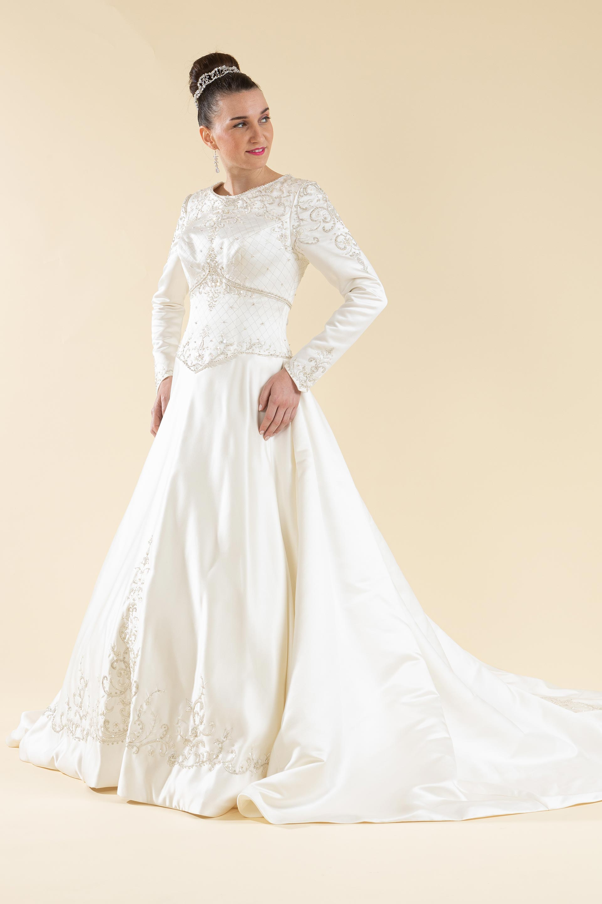 Abito sposa ampio dalla linea romantica realizzato in tessuto di raso tutto ricamato con pailettes, cristalli e micro perline.