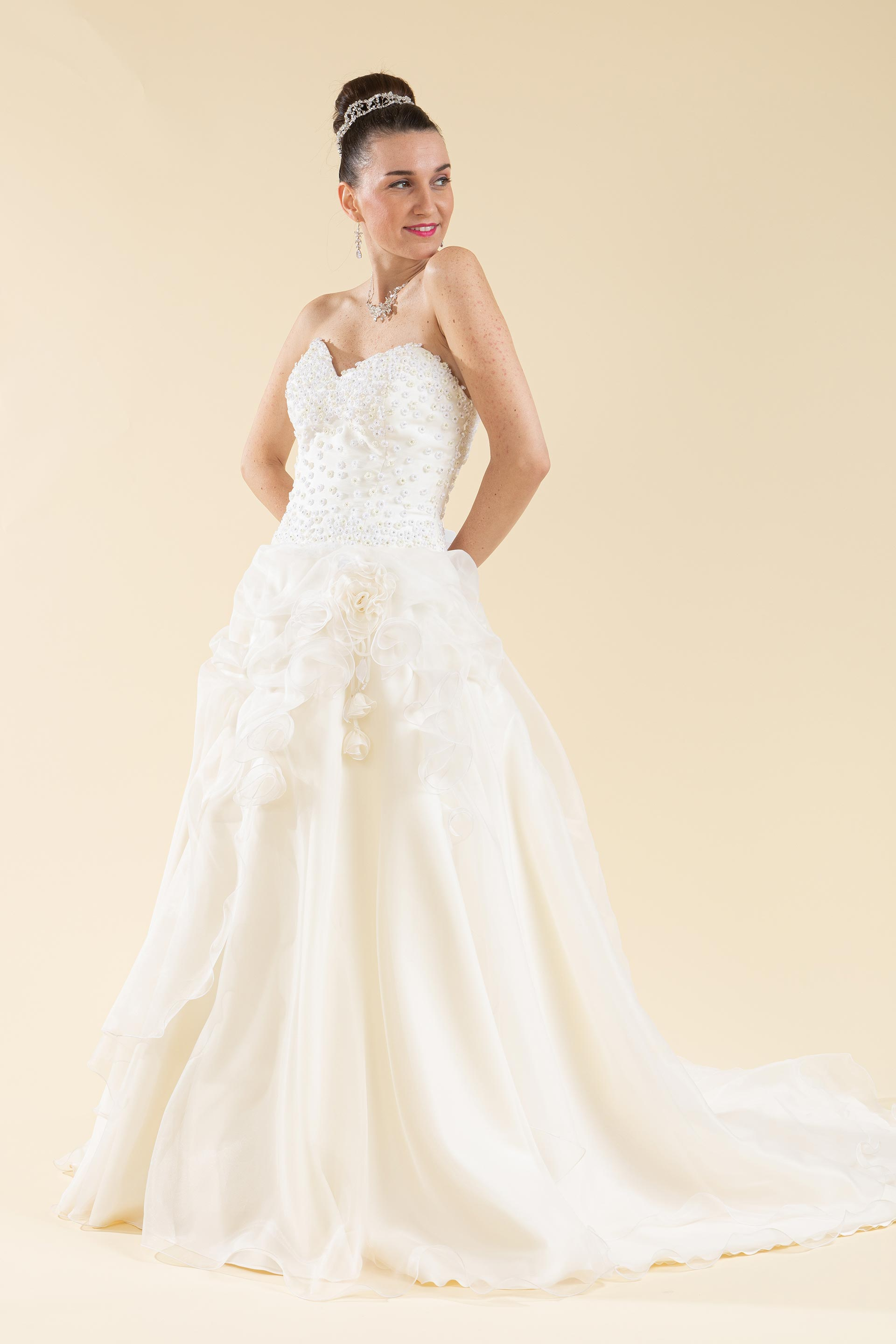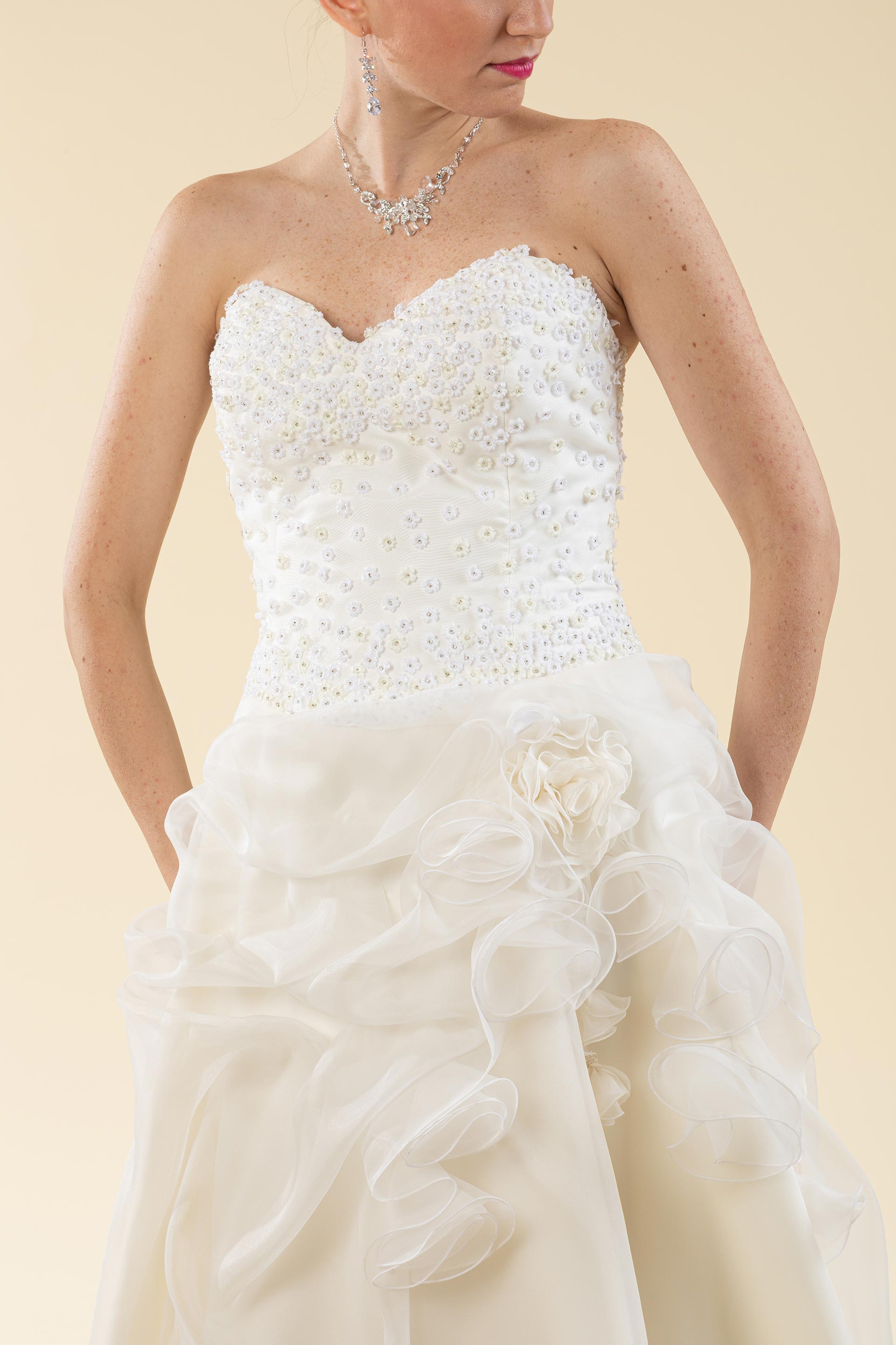Abito sposa ampio con scollo a cuore, bustino realizzato con applicazione di micro fiorellini in 3D con ricamo e gonna ripresa in tessuto di organza impreziosita da applicazione floreale realizzata a mano, la chiusura è realizzata a laccetti.